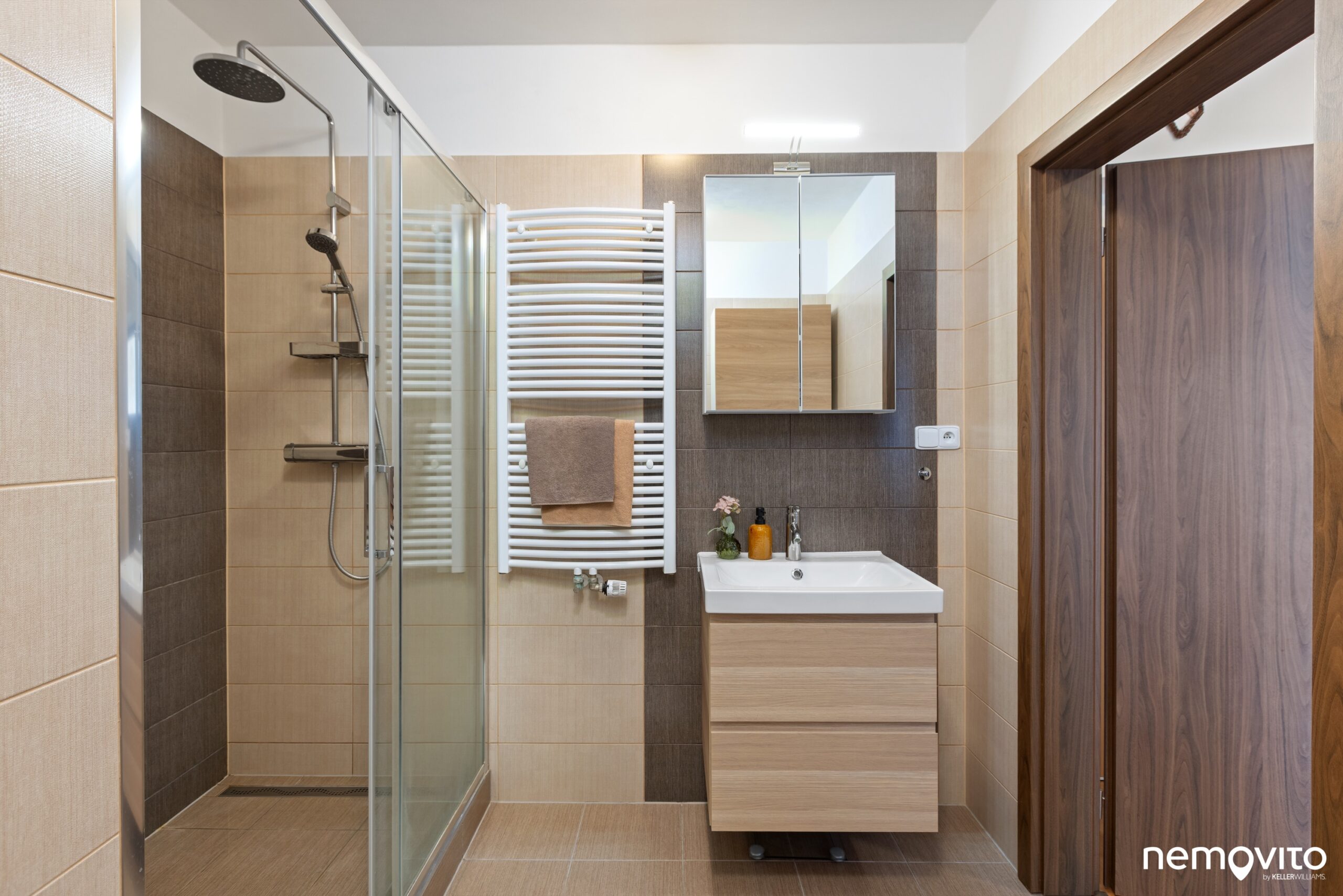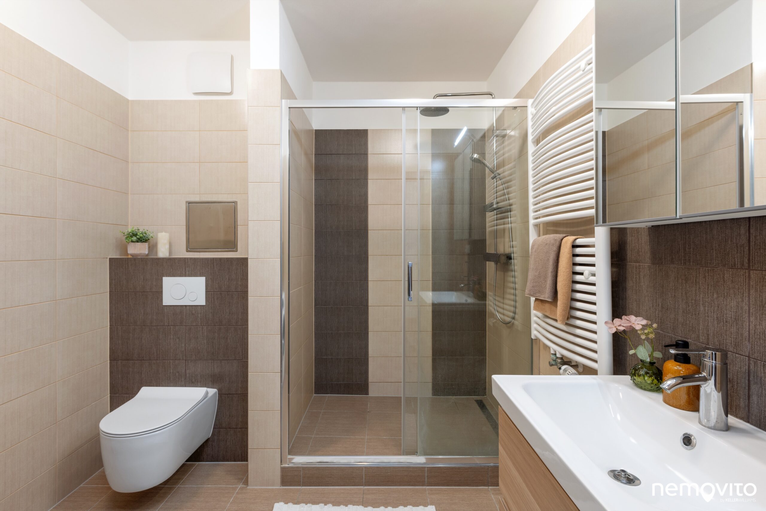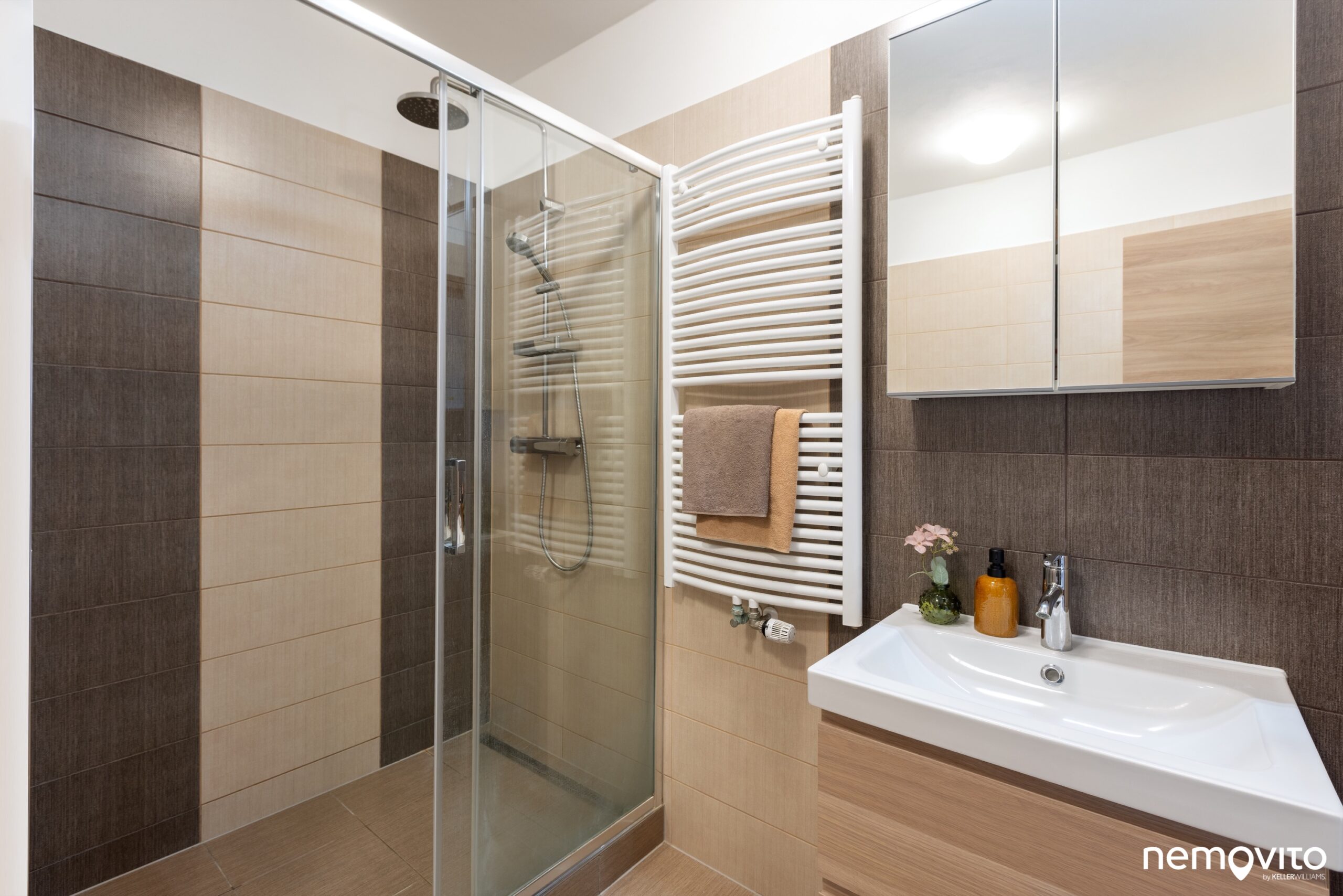 Plocha koupelny je 3,6 m2 a byla rekonstruována společně s celým bytem v roce 2021.