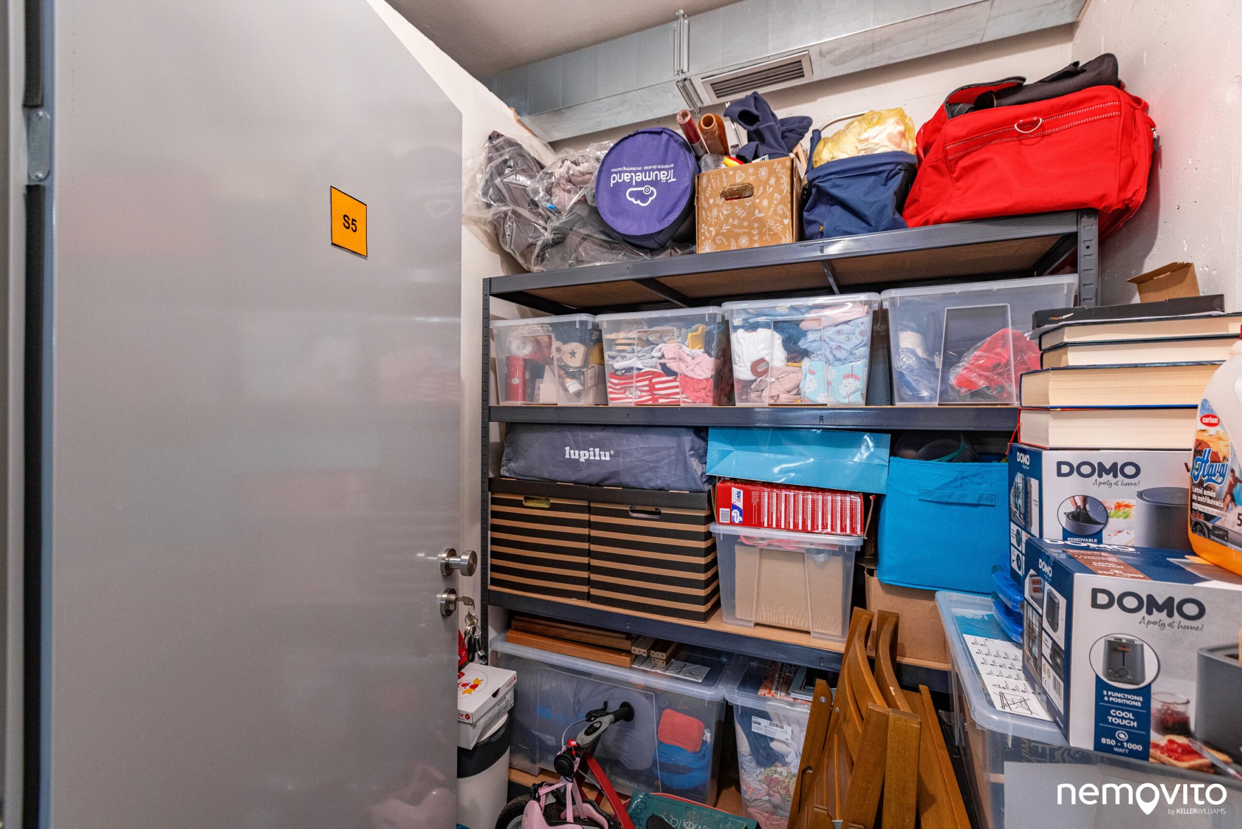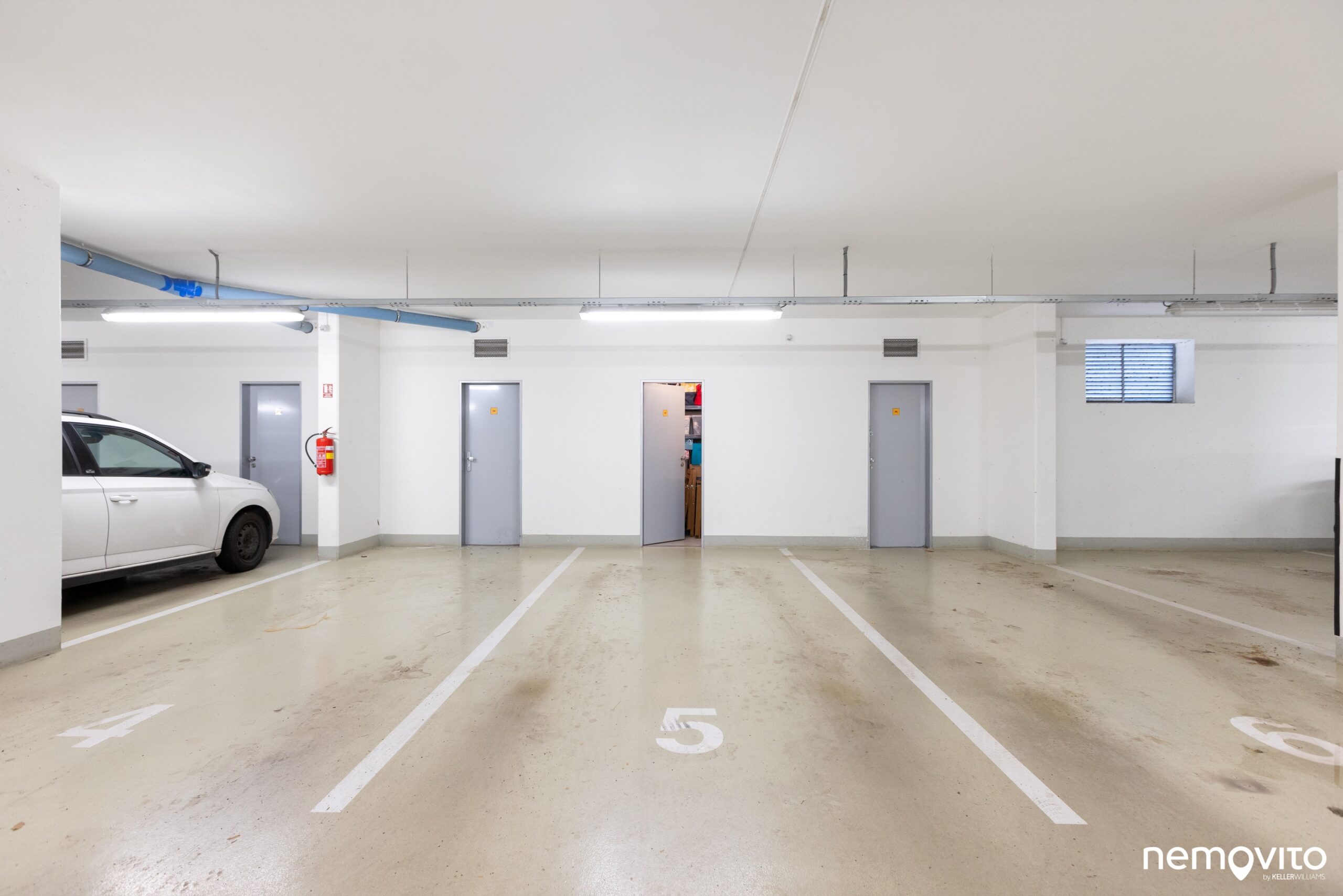 Výtah jezdí přímo z garáží, kde na vás čeká první pětka v životě, ze které budete mít radost. Garážové stání číslo 5 je vzadu doplněné o sklep, který má velikost 3,5 m2 a jak můžete vidět na názorné ukázce - vejde se do něj dost.