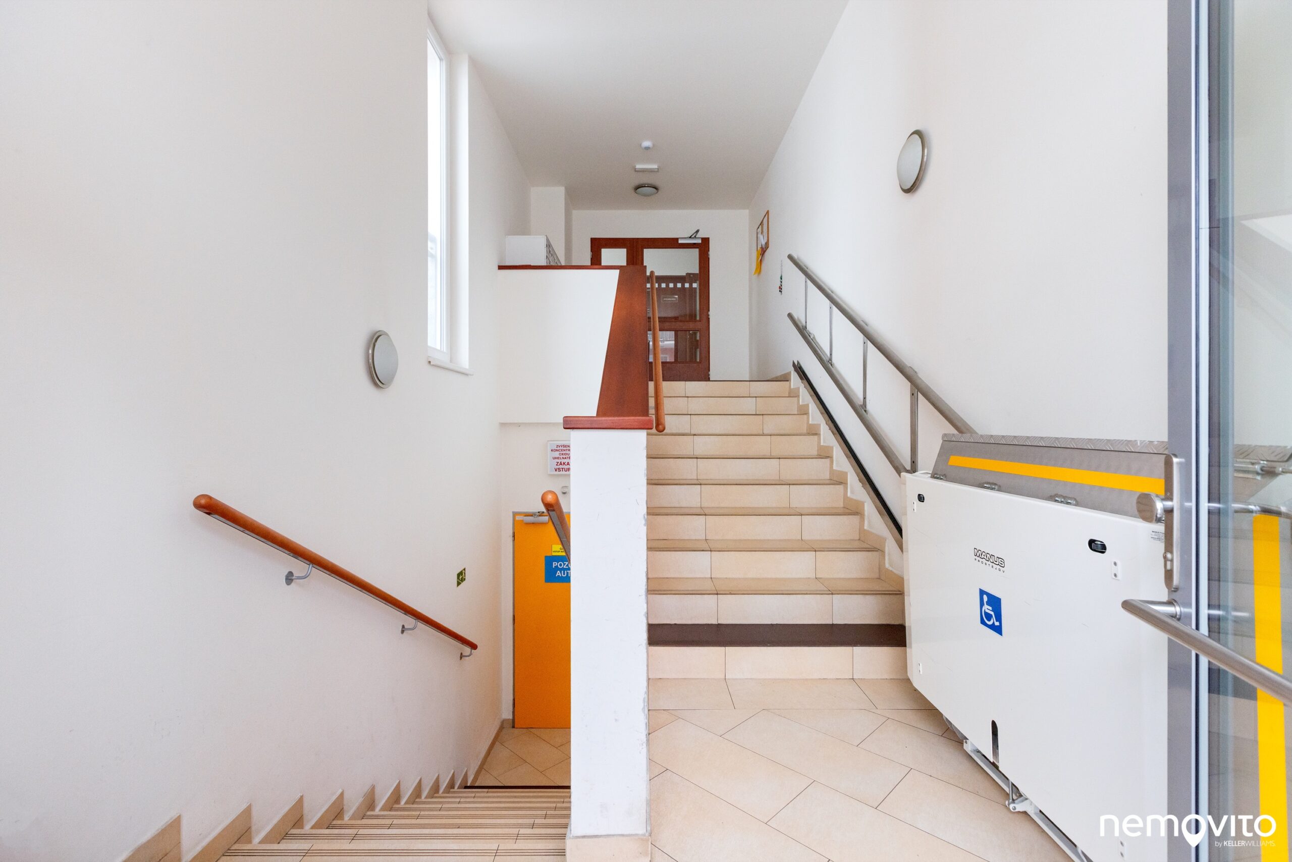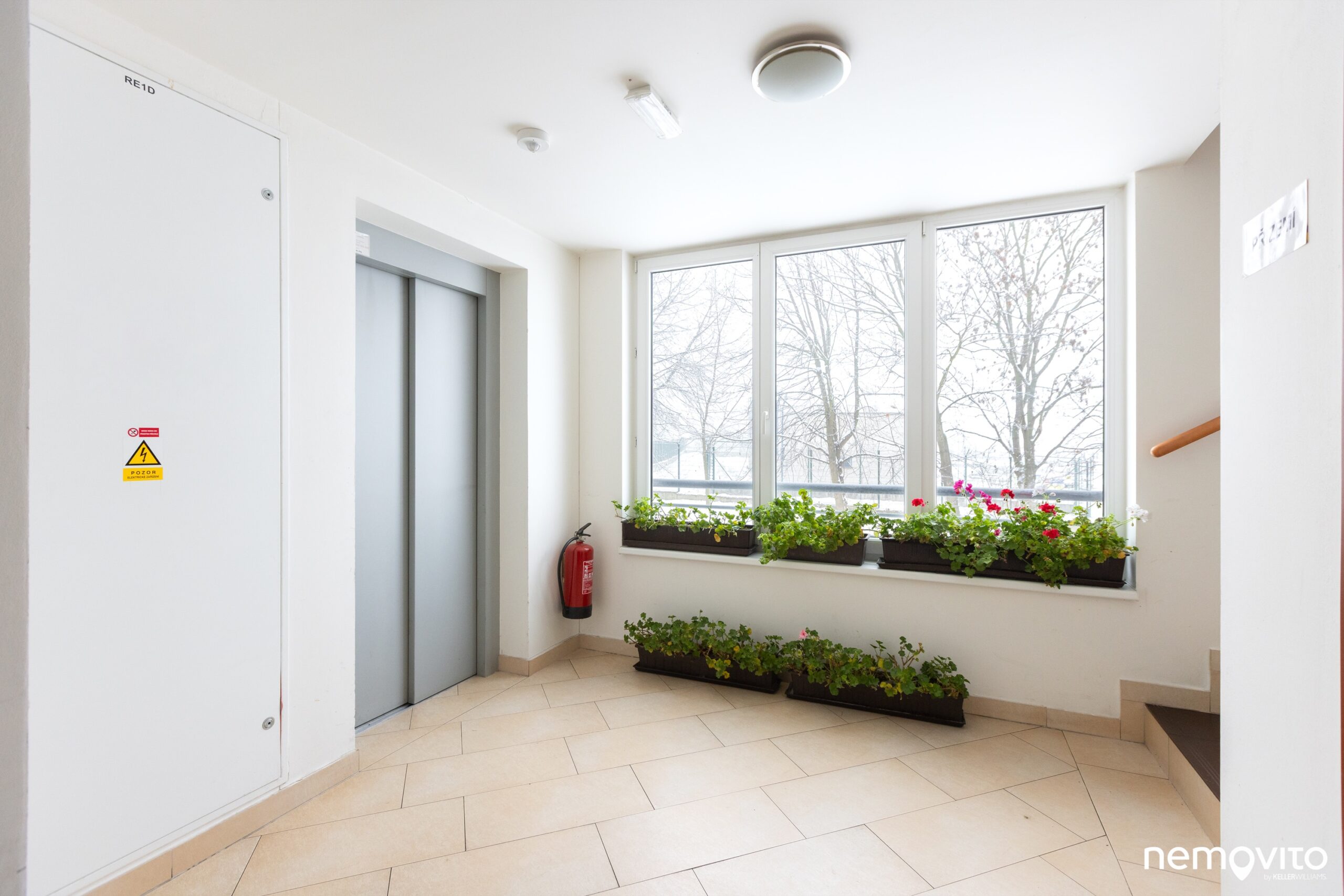 V domě je výtah, ale možná ho ani potřebovat nebudete, protože stačí vyběhnout půl schodiště od dveří a pak jedno podlaží až do bytu.