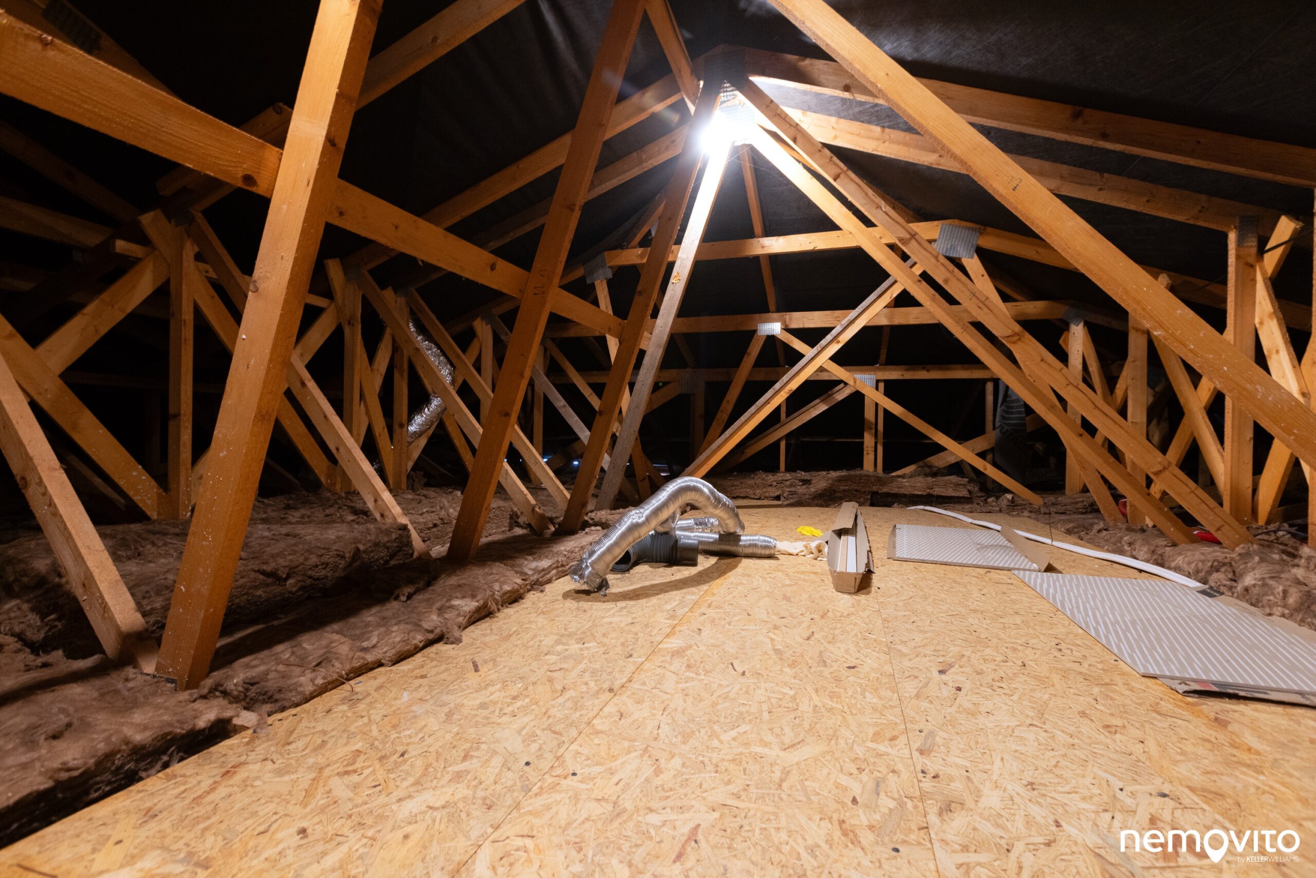 Velká chodba, kterou lemují vestavěné skříně, nabízí ve zlomu také vstup na půdu. Ta je po vzoru celého domu skutečně velká. Její fotku naleznete tady.