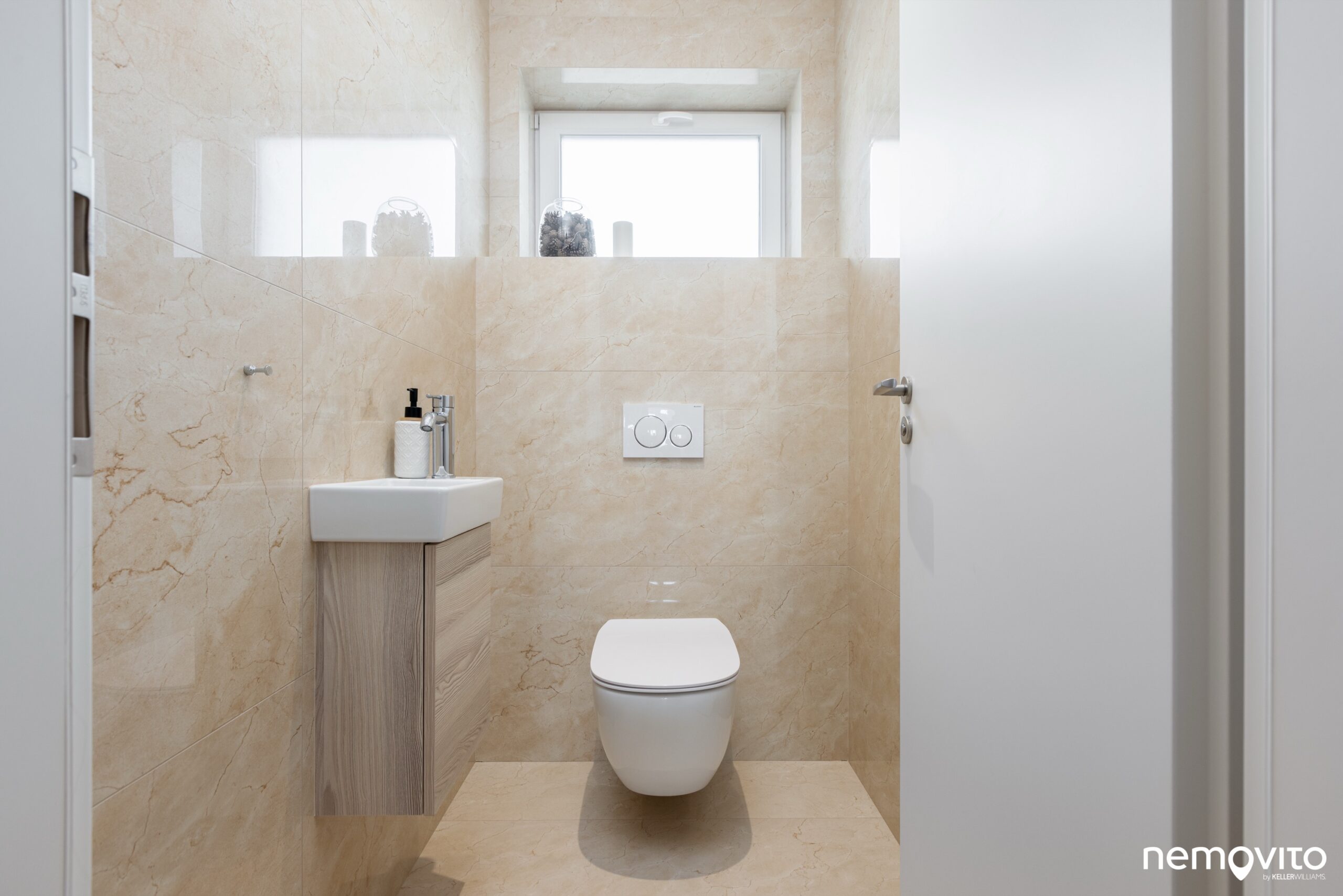 Velkoformátová dlažba a tlumené tóny. Obložení až po strop, všechno perfektně sladěné. Takhle vypadá moderní sociální zázemí rodinného domu. WC je oddělené a samozřejmě s umývátkem.