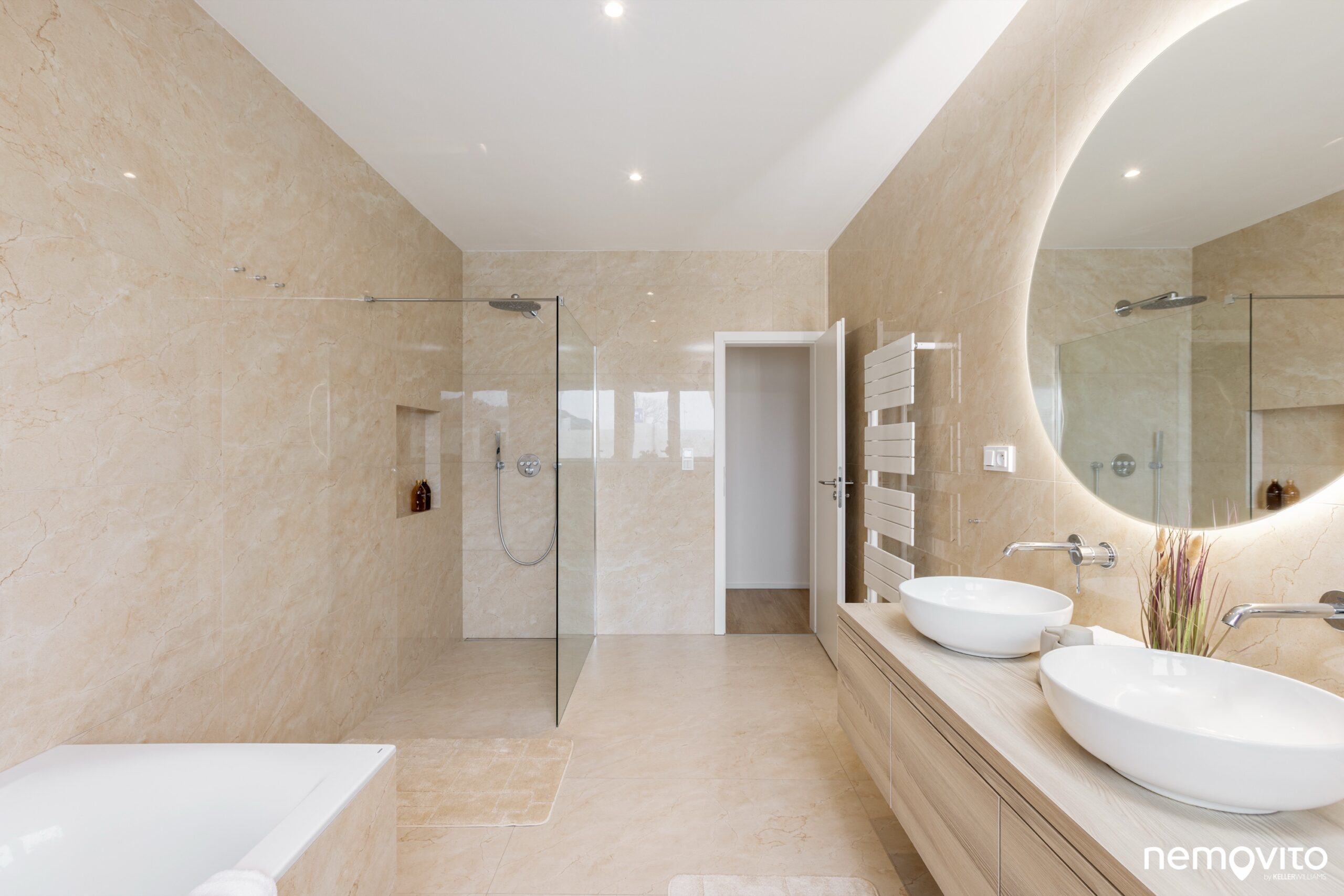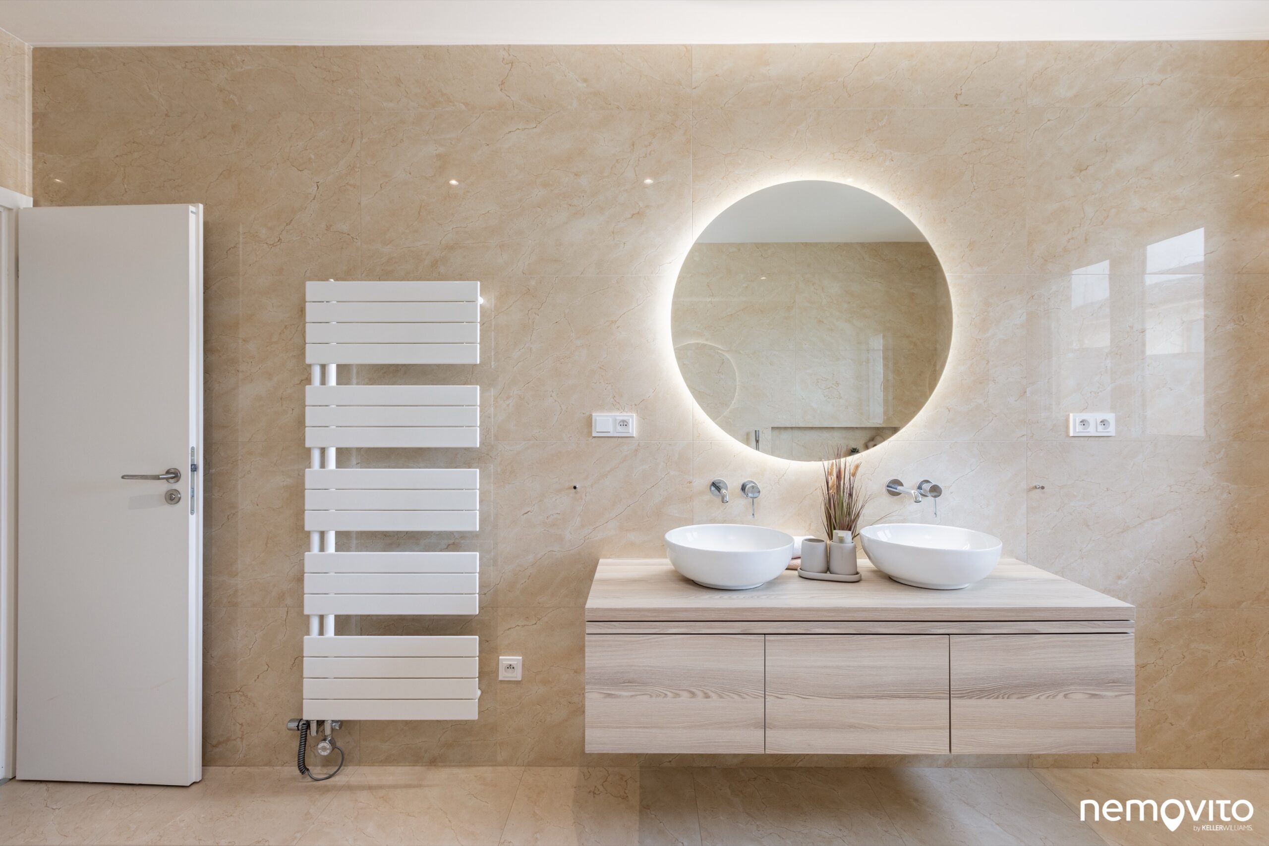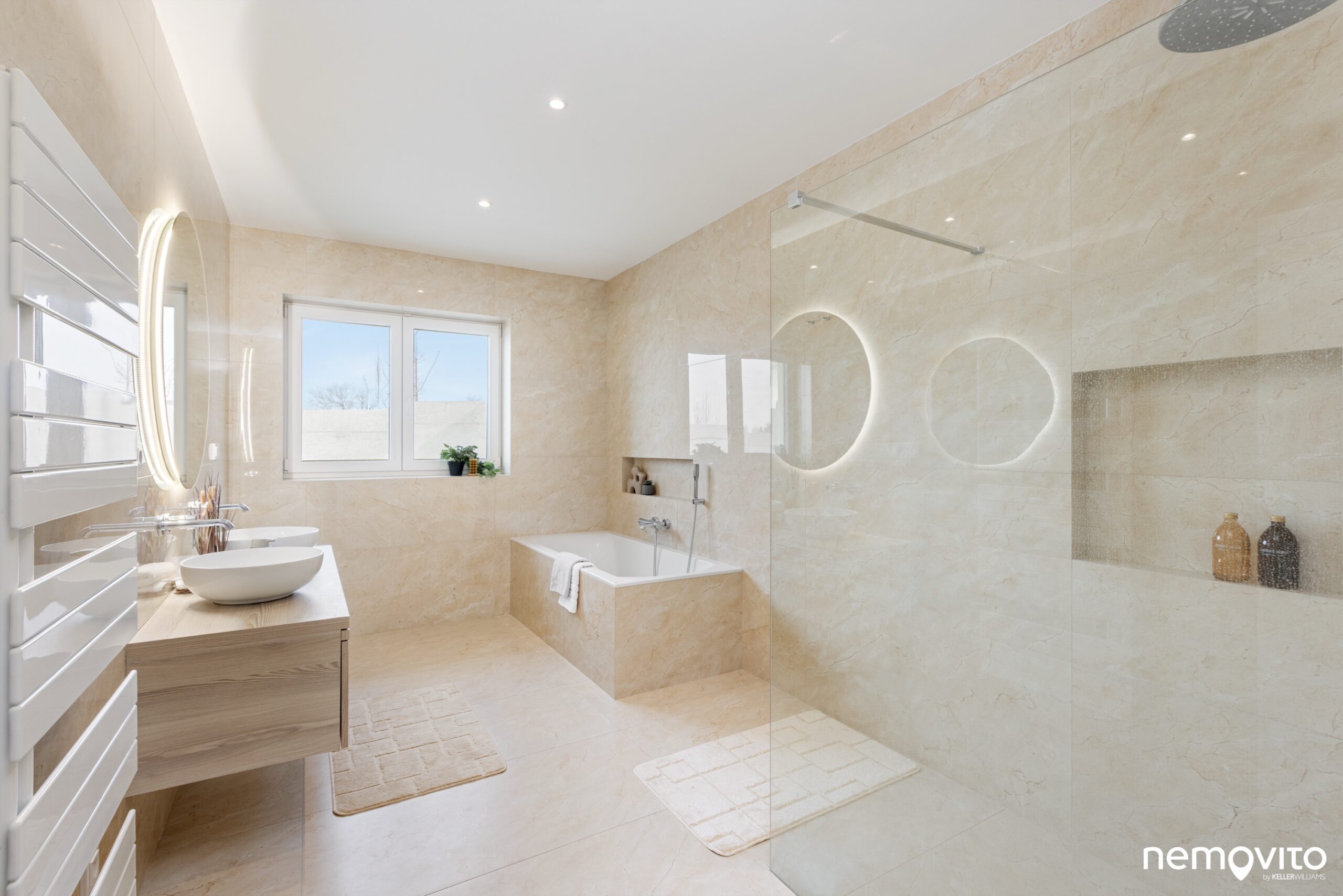 Artemis sice nedávno z měsíce přistála, ale tahle koupelna vás na něj odpálí zpátky. Viděli jste někdy větší koupelnu? 11,3 m2 s velkým oknem, sprchou, vanou, dvoumyvadlem. A tanečním sálem uprostřed. Bez potíží se sem vejde ještě WC.