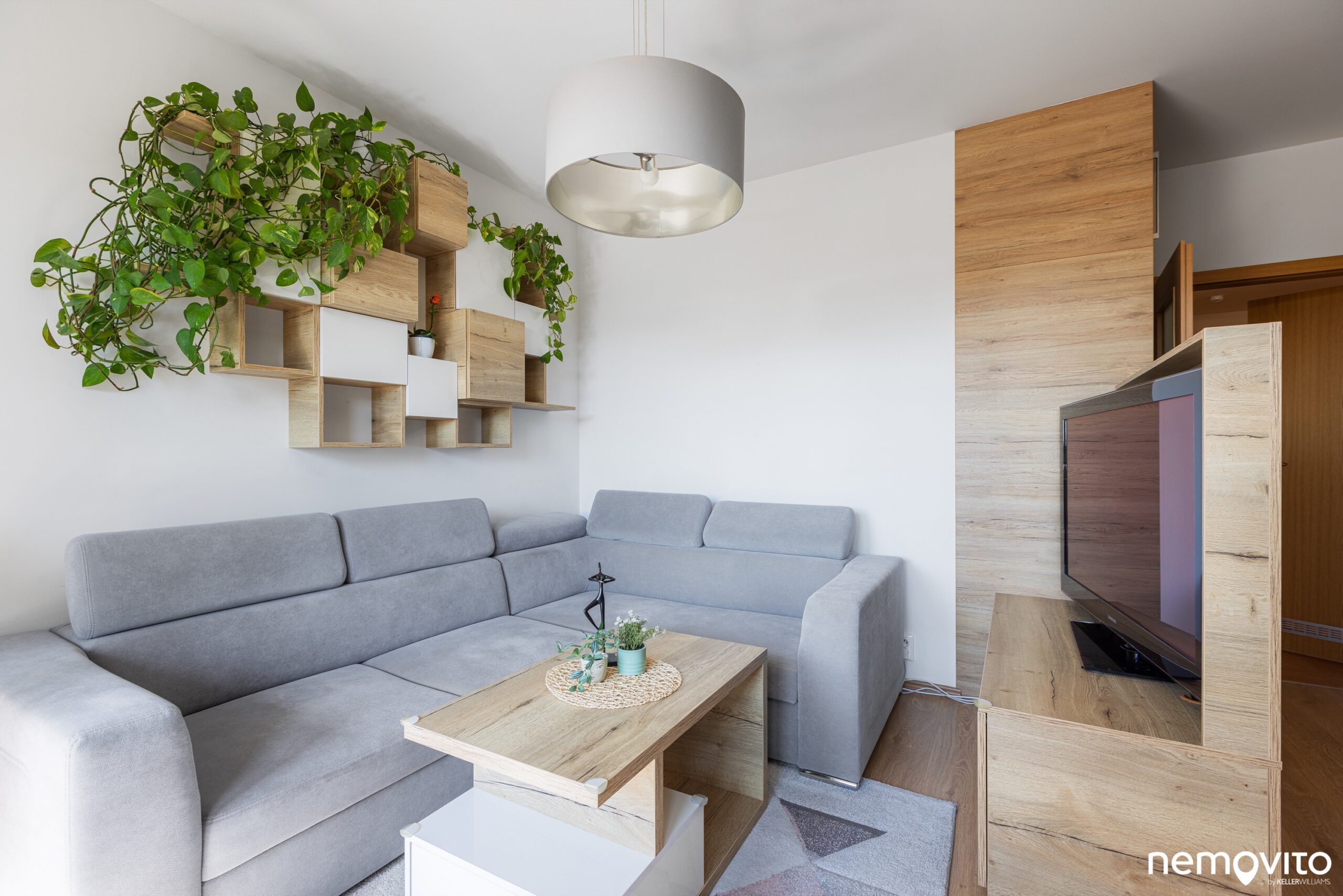 Nepravidelný půdorys obýváku se podařilo bezezbytku využít díky skvělému nápadu s dělící polo stěnou, která zároveň tvoří televizní stolek.