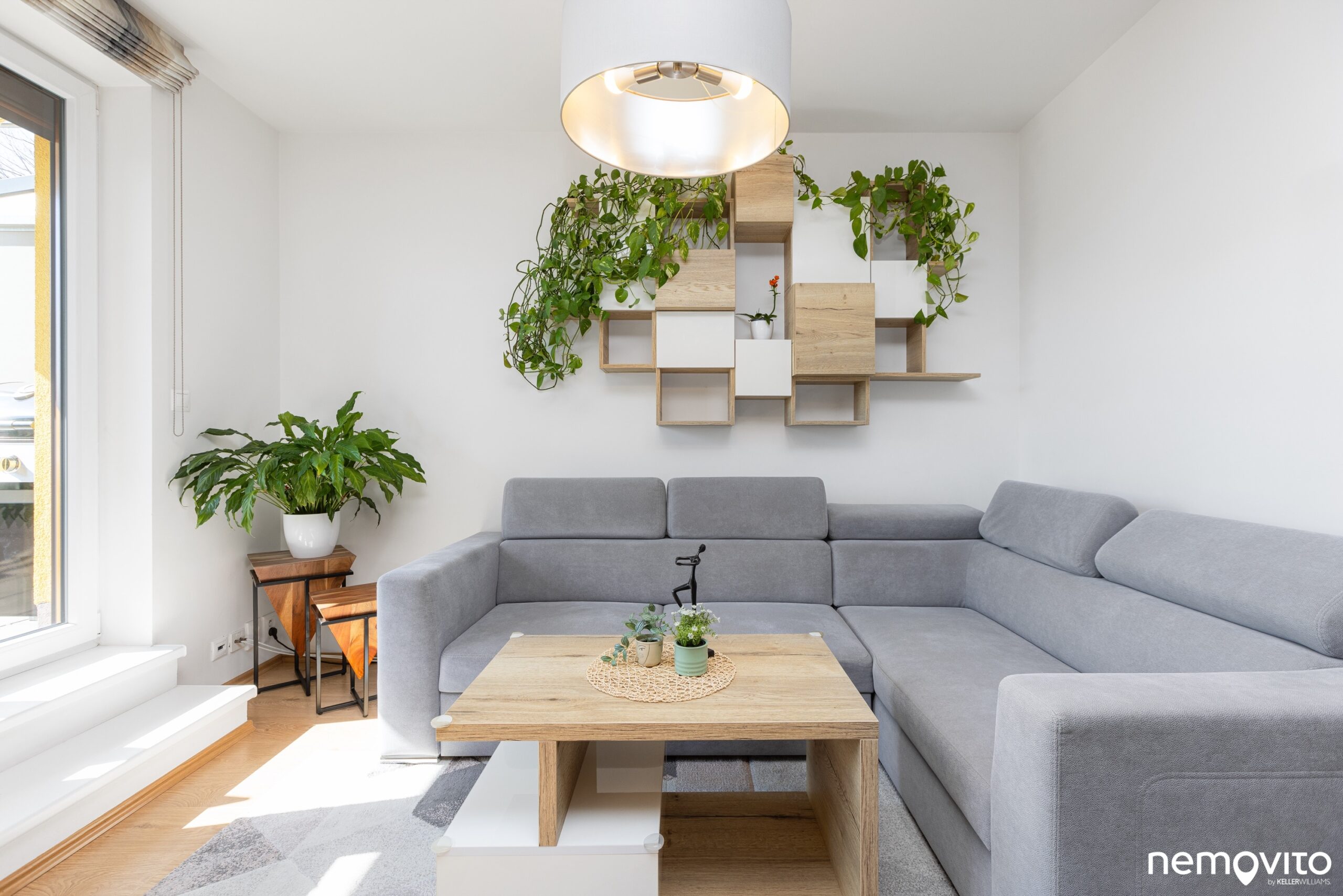 70 metrů bytu doplňuje 13 metrová terasa, dva čtyřmetrové balkony a k tomu ještě parádní sklep. Zmíněných 70 metrů je čistá plocha bytu, který svým půdorysem potěší ty, kdo nechtějí jenom nudné pravidelné čtyři stěny. Drtivou většinu nábytku pořizovat nemusíte, protože je téměř všechno vyhotoveno na míru a designově sladěné tak, aby byl byt svěží a podtrhoval vzdušnost obýváku, na které se podepisuje nejen skvělá orientace, ale také velká prosklená plocha. Pokud by toho sluníčka bylo přeci jenom moc, zatáhnete elektrickou markýzu nebo rolety. A třeba takové rozdělení obýváku mezi gaučem a kuchyňským koutem, to byl vyloženě husarský kousek. Dělící polo příčka nejen funkčně odděluje dvě části místnosti, navíc skvěle slouží jako úložný prostor a místo pro vestavěnou lednici. To potěší každého hračičku!