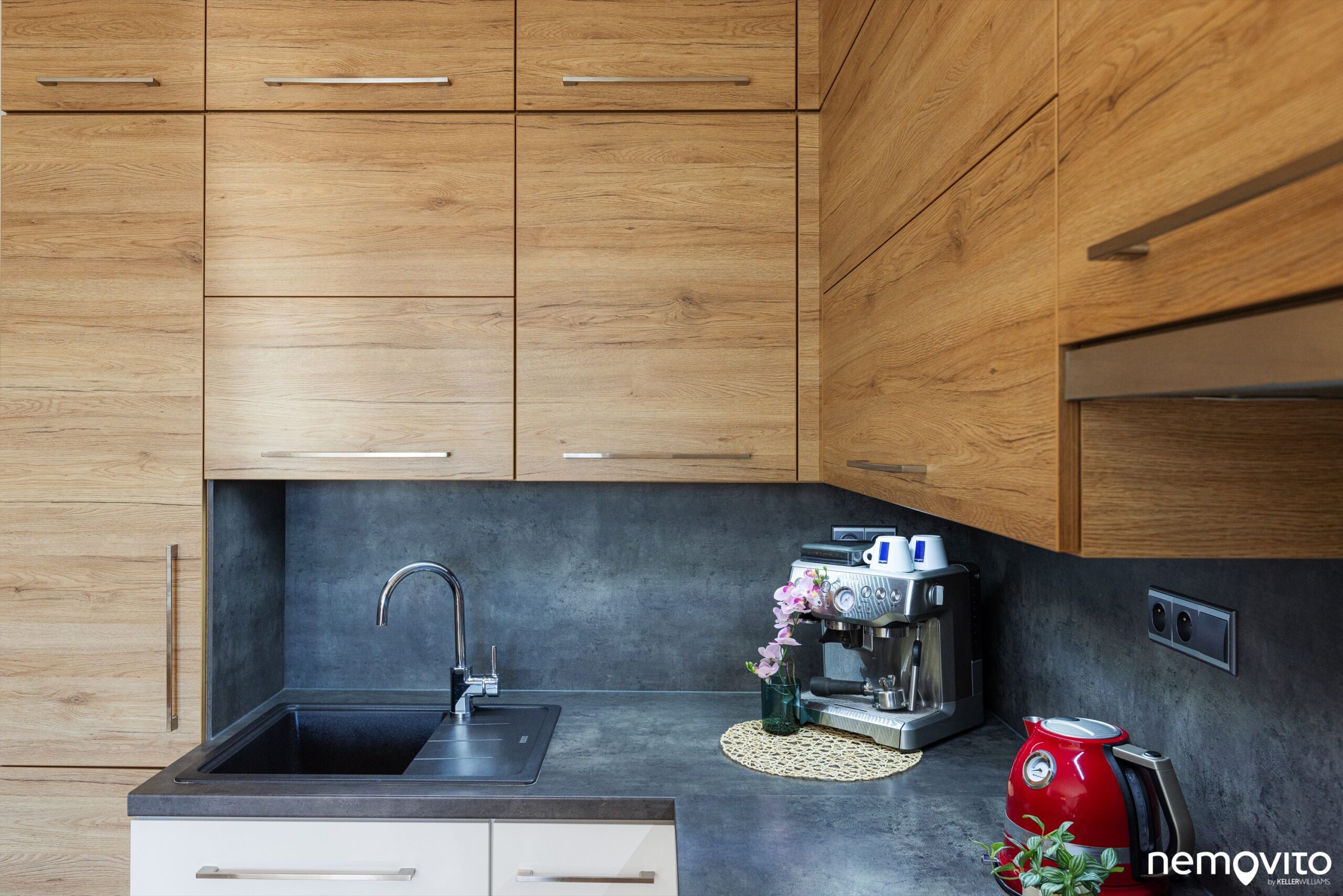 Ve stejně laděném provedení je pak vyvedena také kuchyňská linka, která díky dvěma barevným segmentům šikovně maskuje svou velikost. Tak nějak, jako by tu snad ani nebyla!