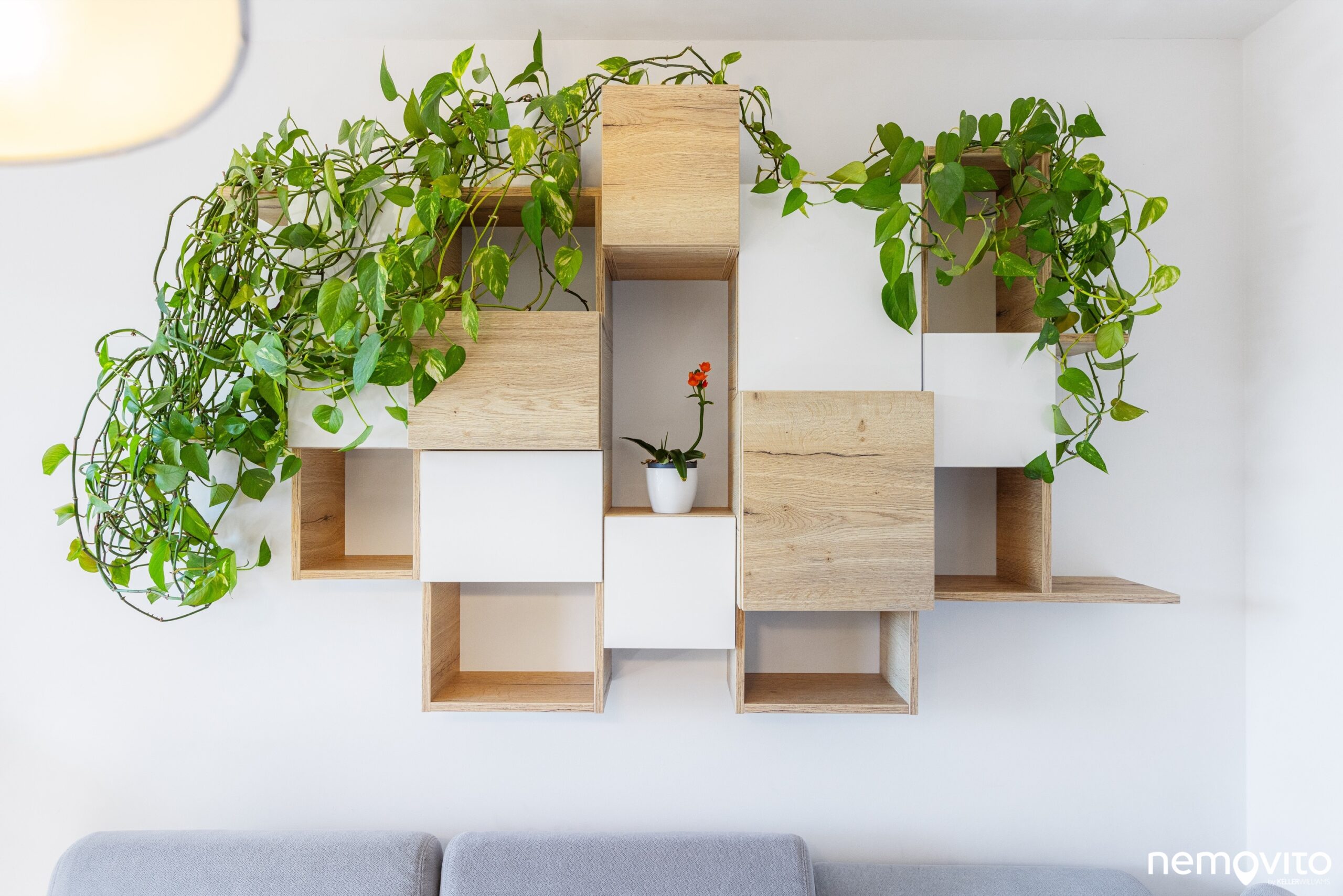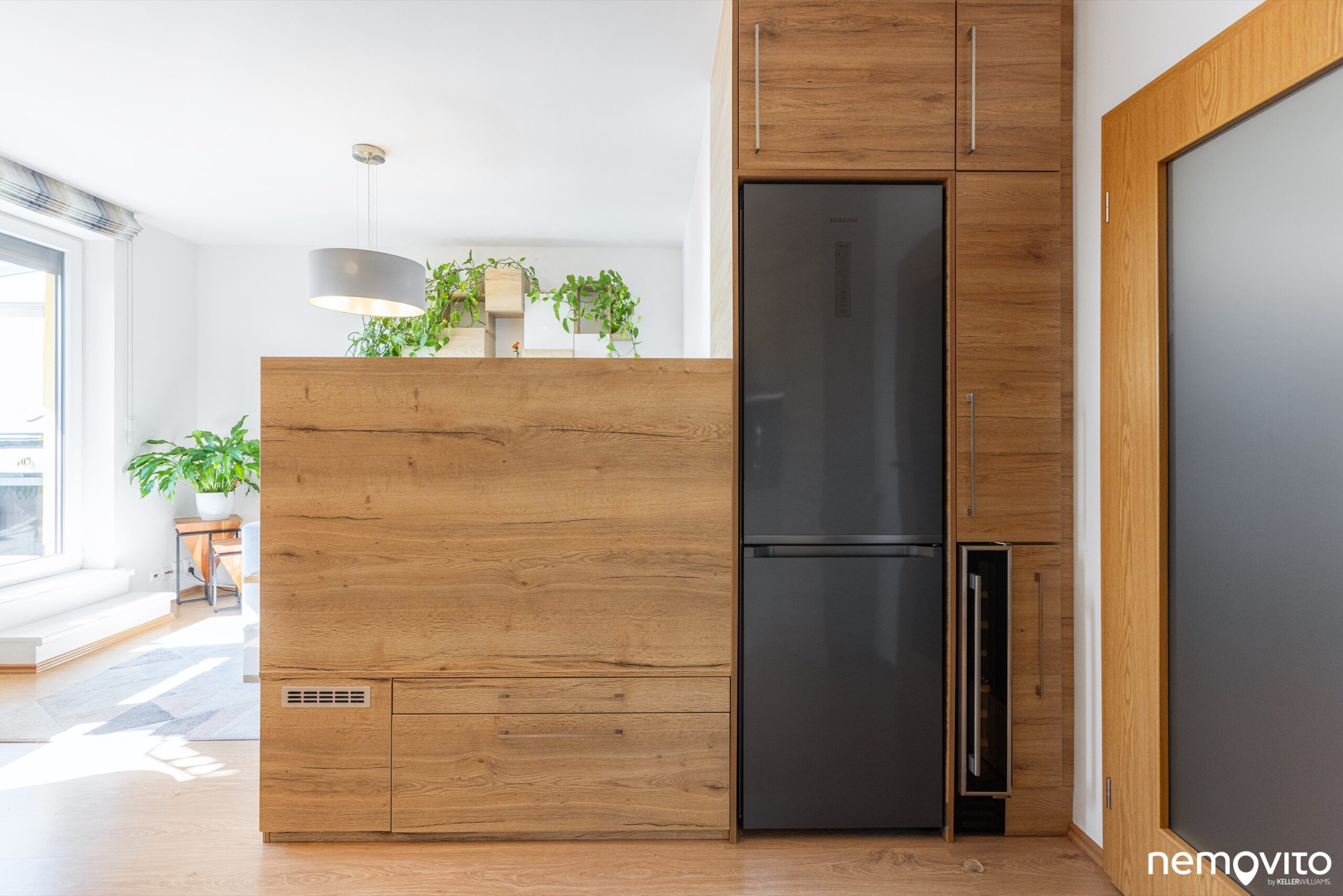 Pokud hledáte lednici nebo vinotéku a další úložné prostory, pak se otočte k již zmíněné polo stěně, která z druhé strany tvoří televizní stolek. Geniální řešení, které šetří místo a poskytuje maximální množství úložných prostor.