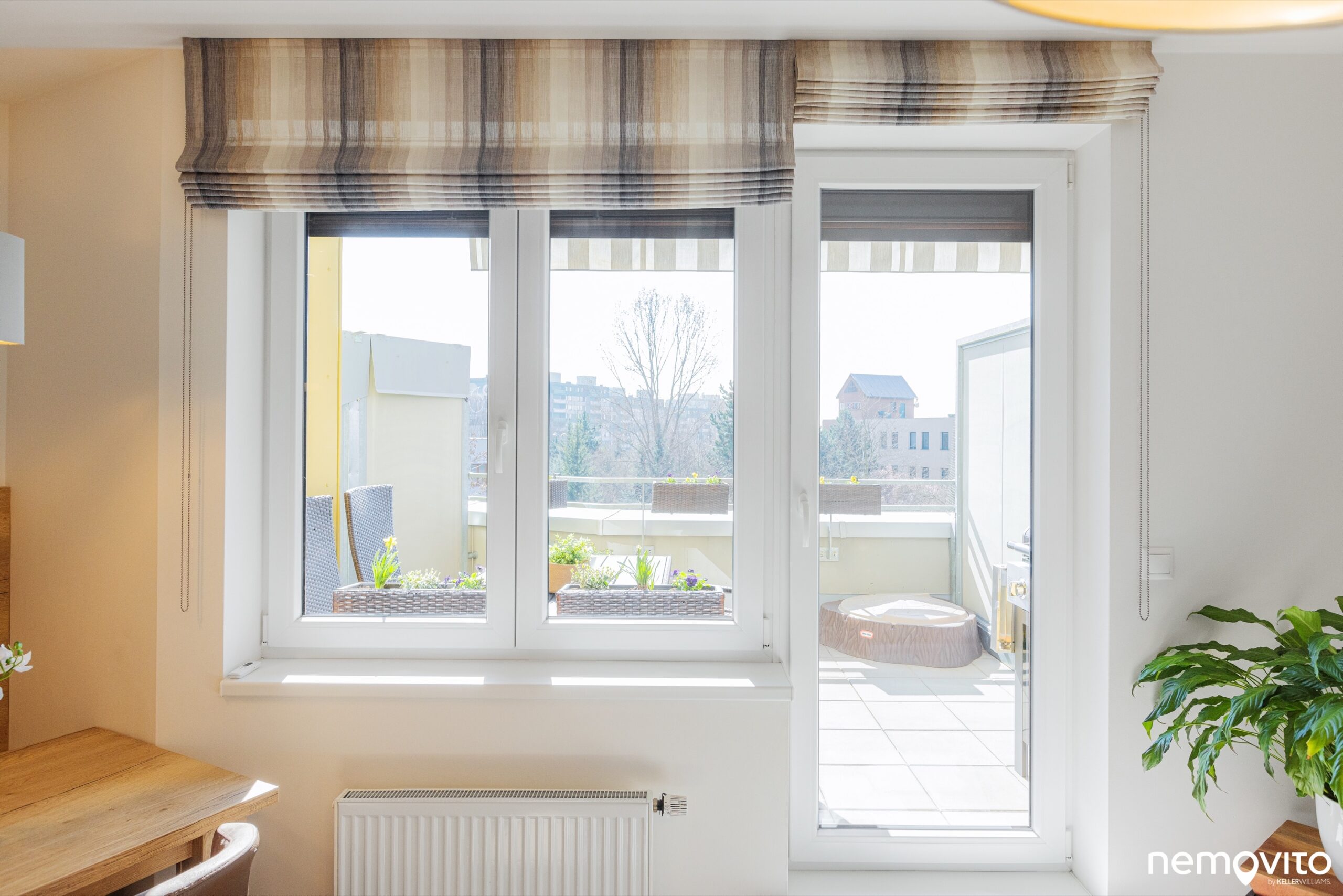 Čelní stěna bytu, přes kterou je terasa přístupná, těží z velké prosklené plochy. Díky nejslunnější orientaci tady skutečně platí, že se jedná o světlý byt. A nečekejte od toho jen prázdnou větu, je to fakt.