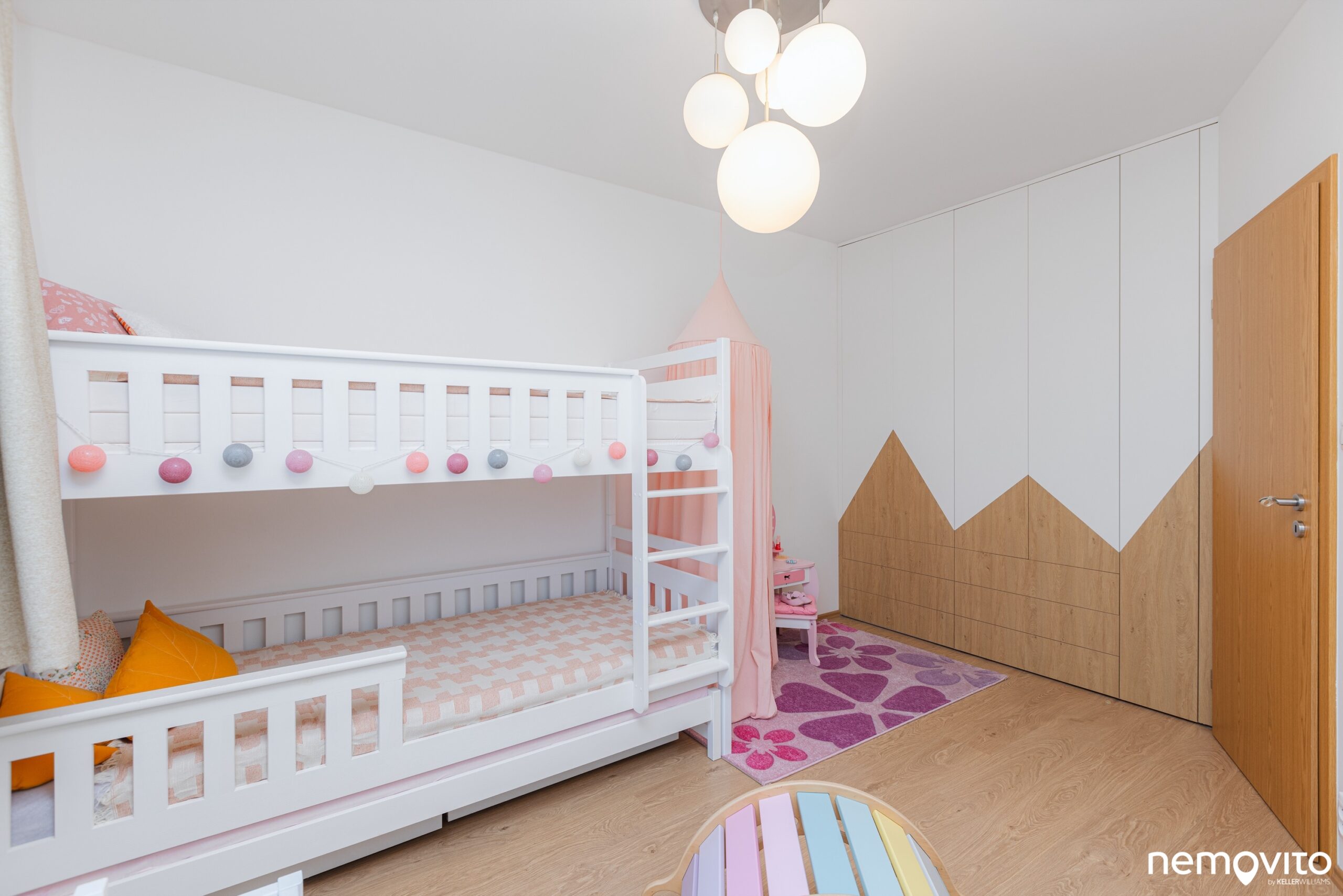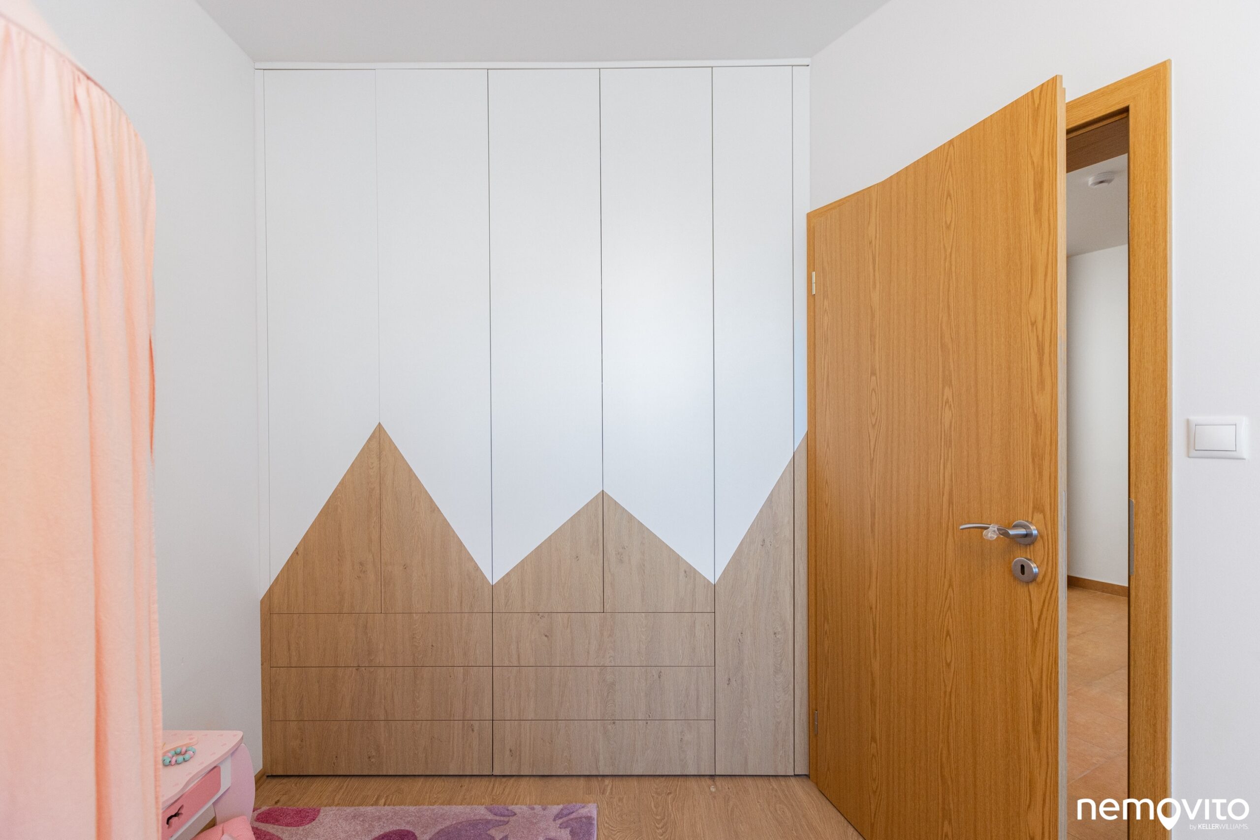 Dětský pokoj s nápaditou vestavěnou skříní, kterou byste možná v rohu místností u dveří přehlédli, má velikost 13,5 m2. Orientace je stejná jako u sousedního pokoje, tedy na severovýchod a s přímým vstupem na balkon.