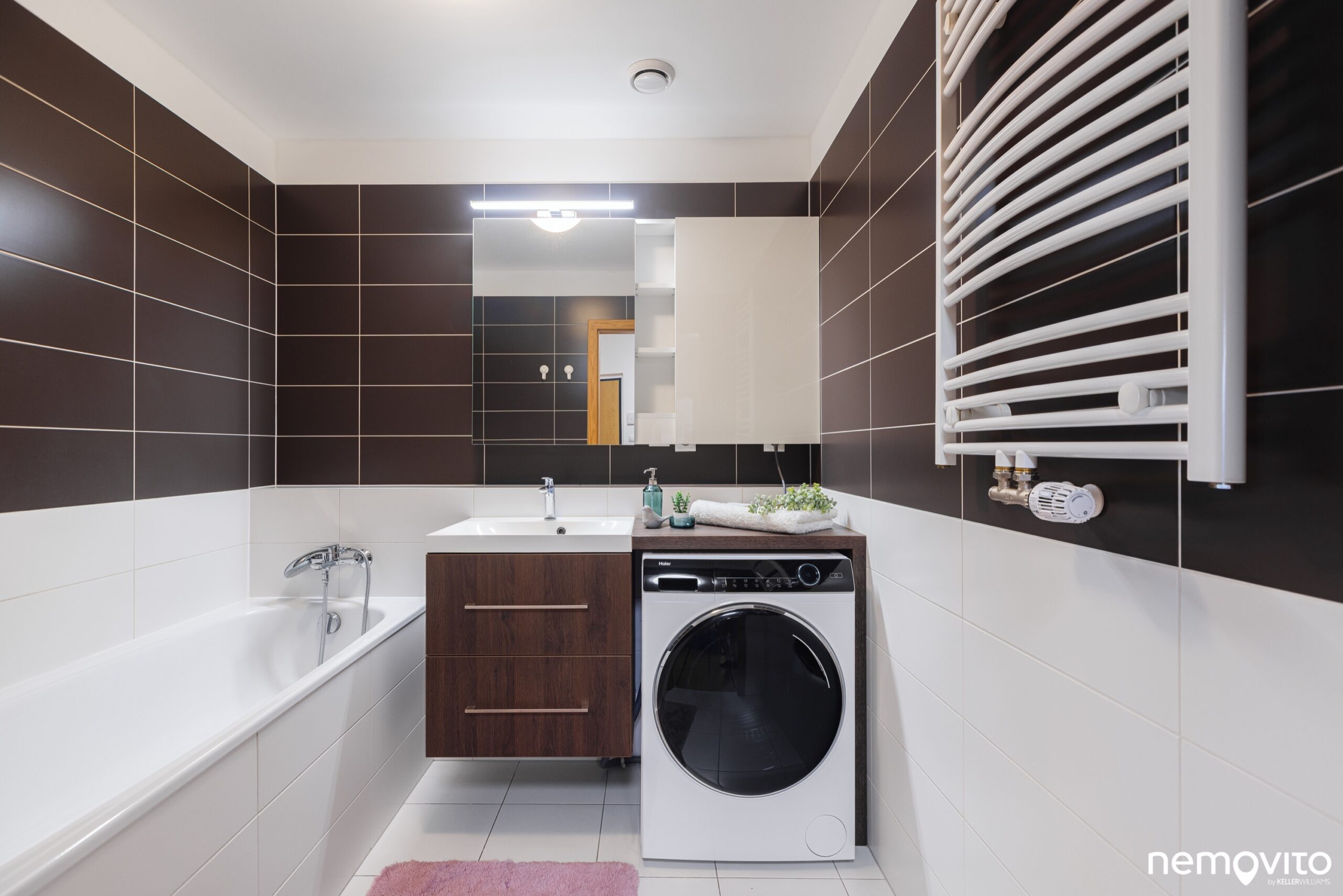 Koupelna s vanou se nachází mezi obývákem a dětským pokojem. Je tedy umístěná hned za zdí, u které je v dětském pokoji vestavěná skříň. Ta v bytě pochopitelně zůstává jako nedílná součást.