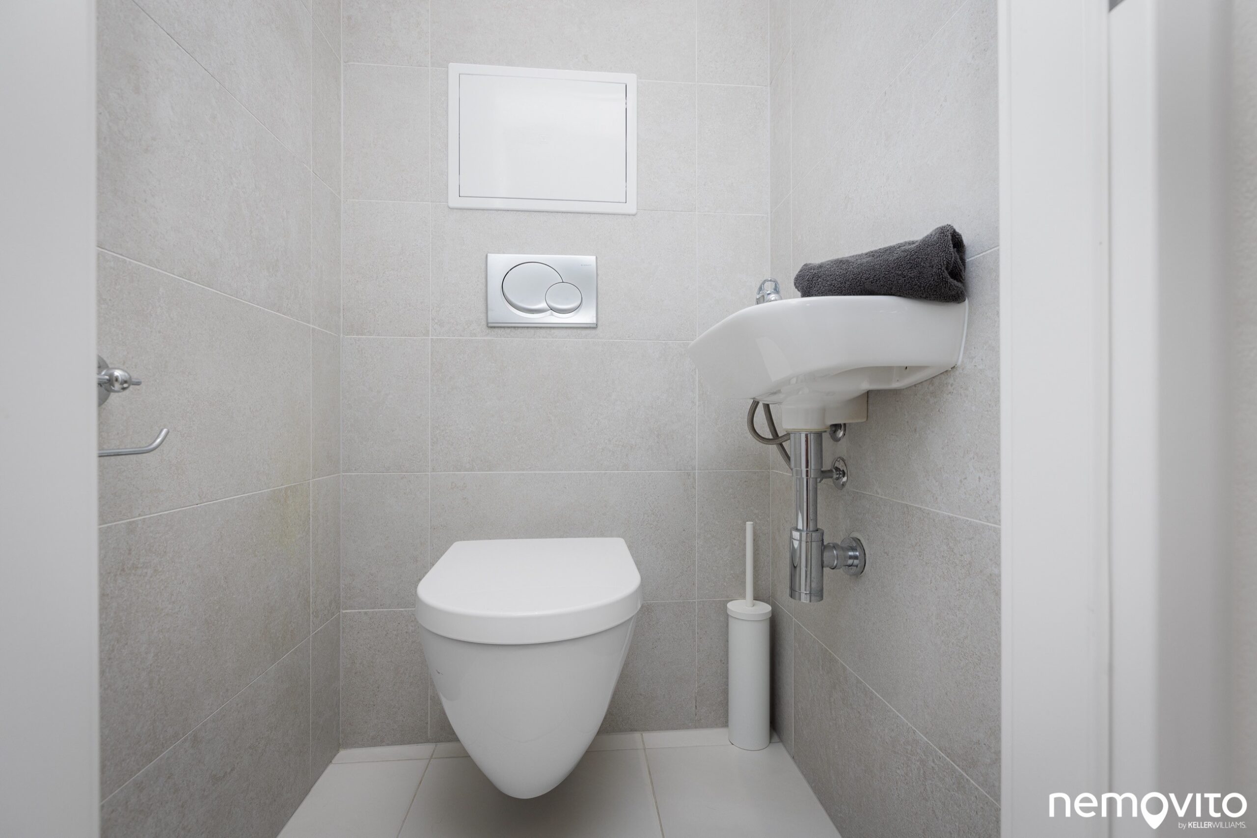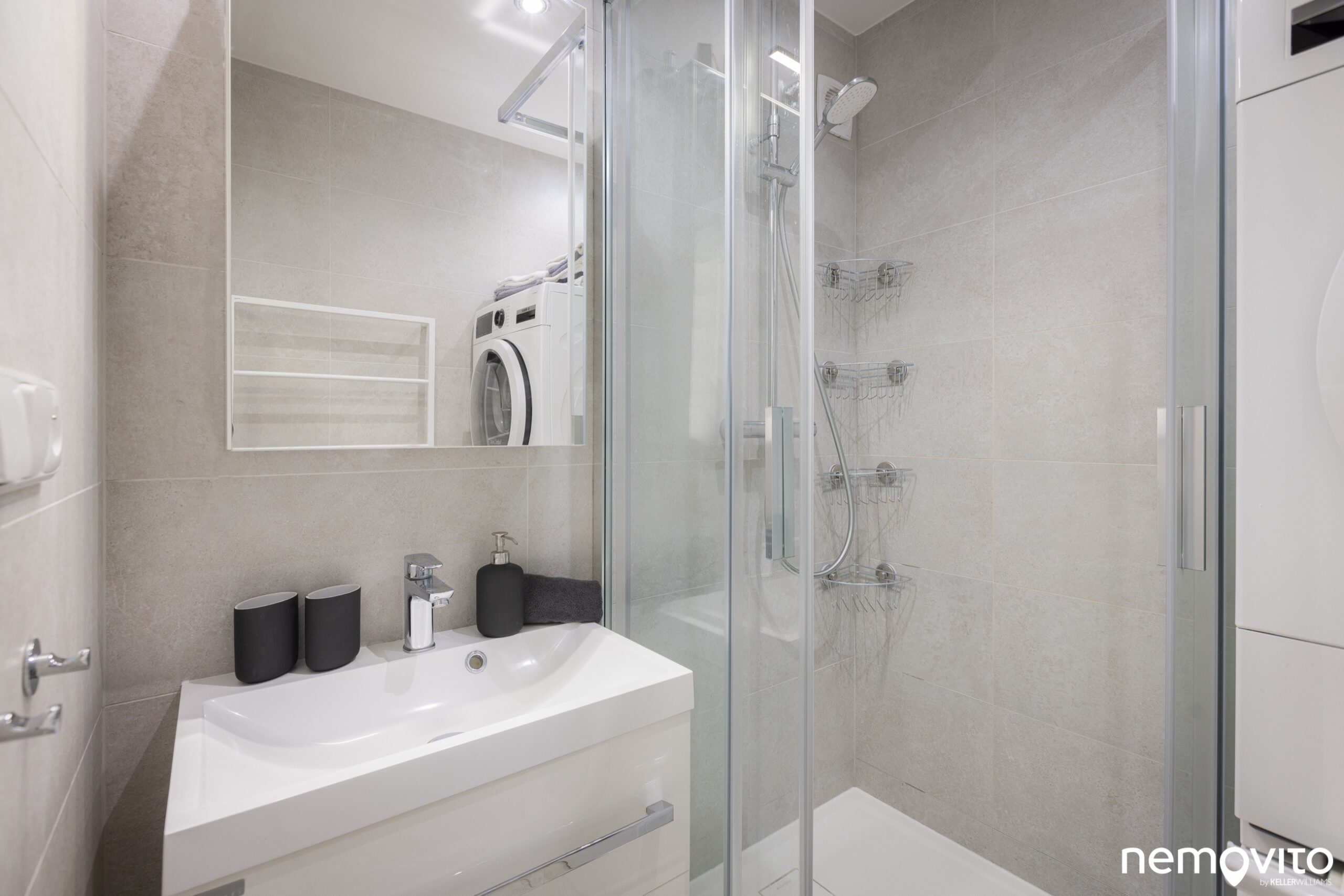 Čisté, jednoduché, nadčasové. Obklad koupelny i samostatné toalety je v tlumených odstínech šedé barvy, takže žádný divoký výstřelek, nad kterým byste za pár let museli pousmát. Pračka i sušička se bez potíží vejdou vedle sprchového koutu.