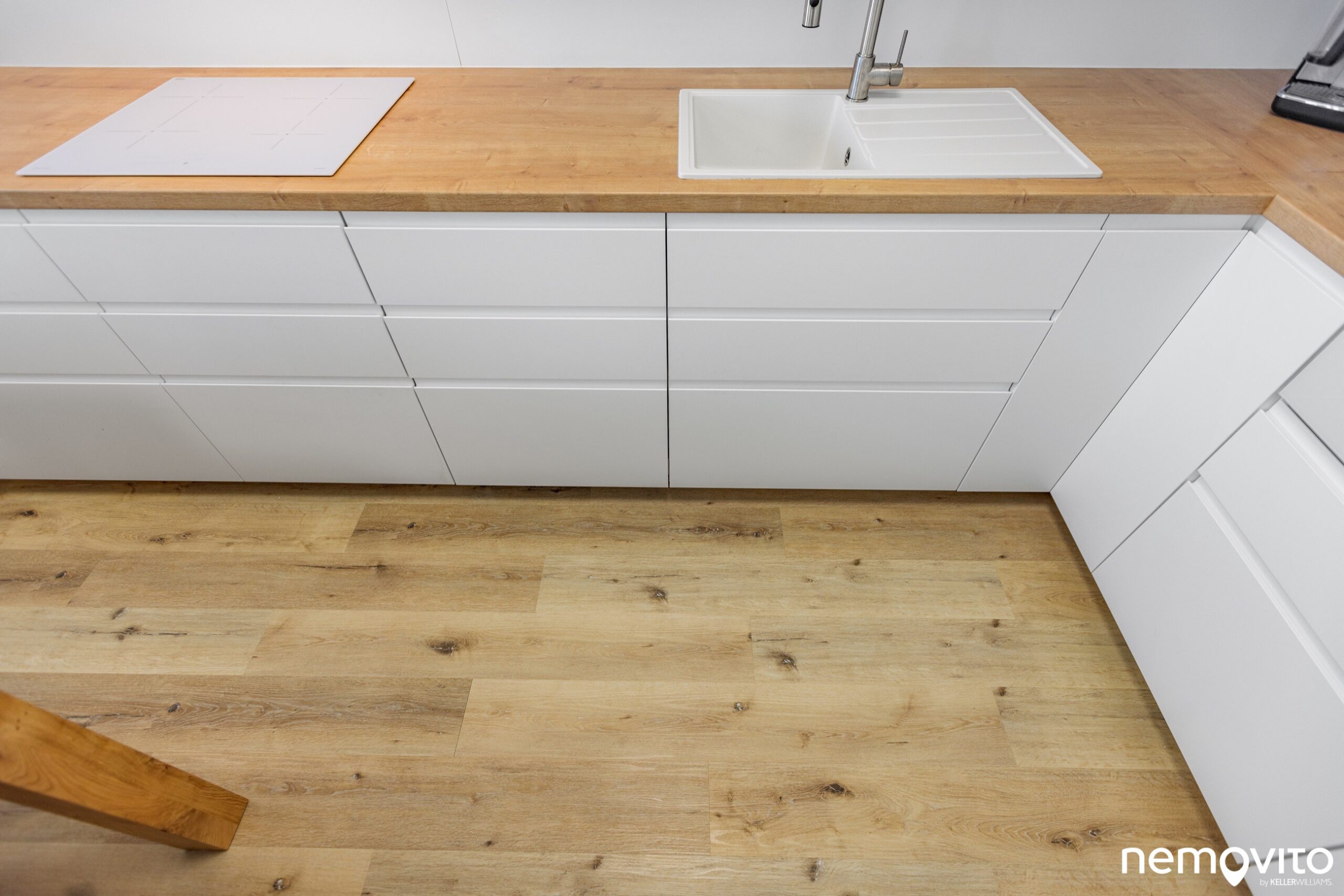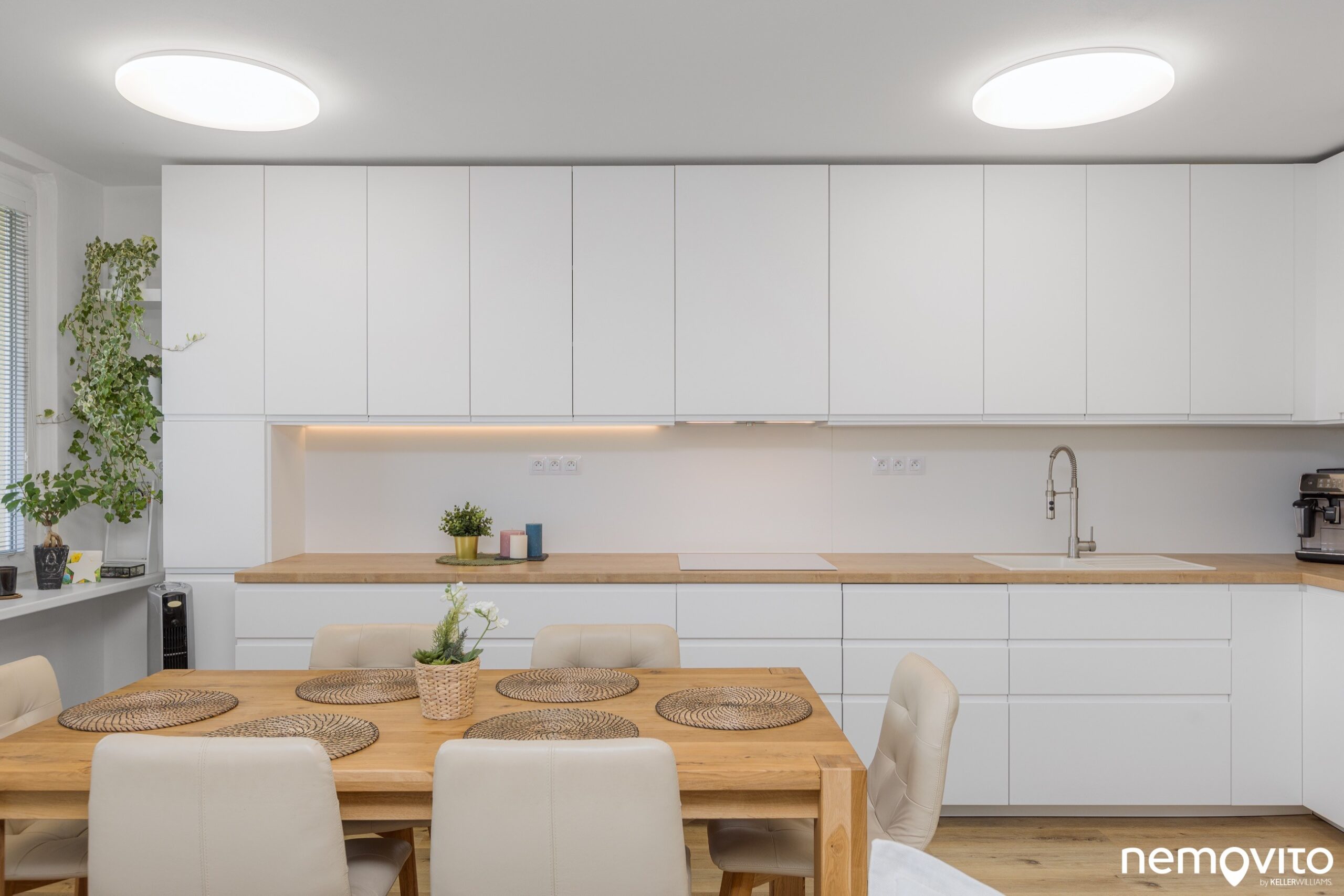 Nová kuchyňská linka je v celém rohu místnosti. Spousta místa na práci, spousta místa pro ukládání nádobí nebo potravin. Bílé matné provedení bez úchytů je čisté a elegantní.