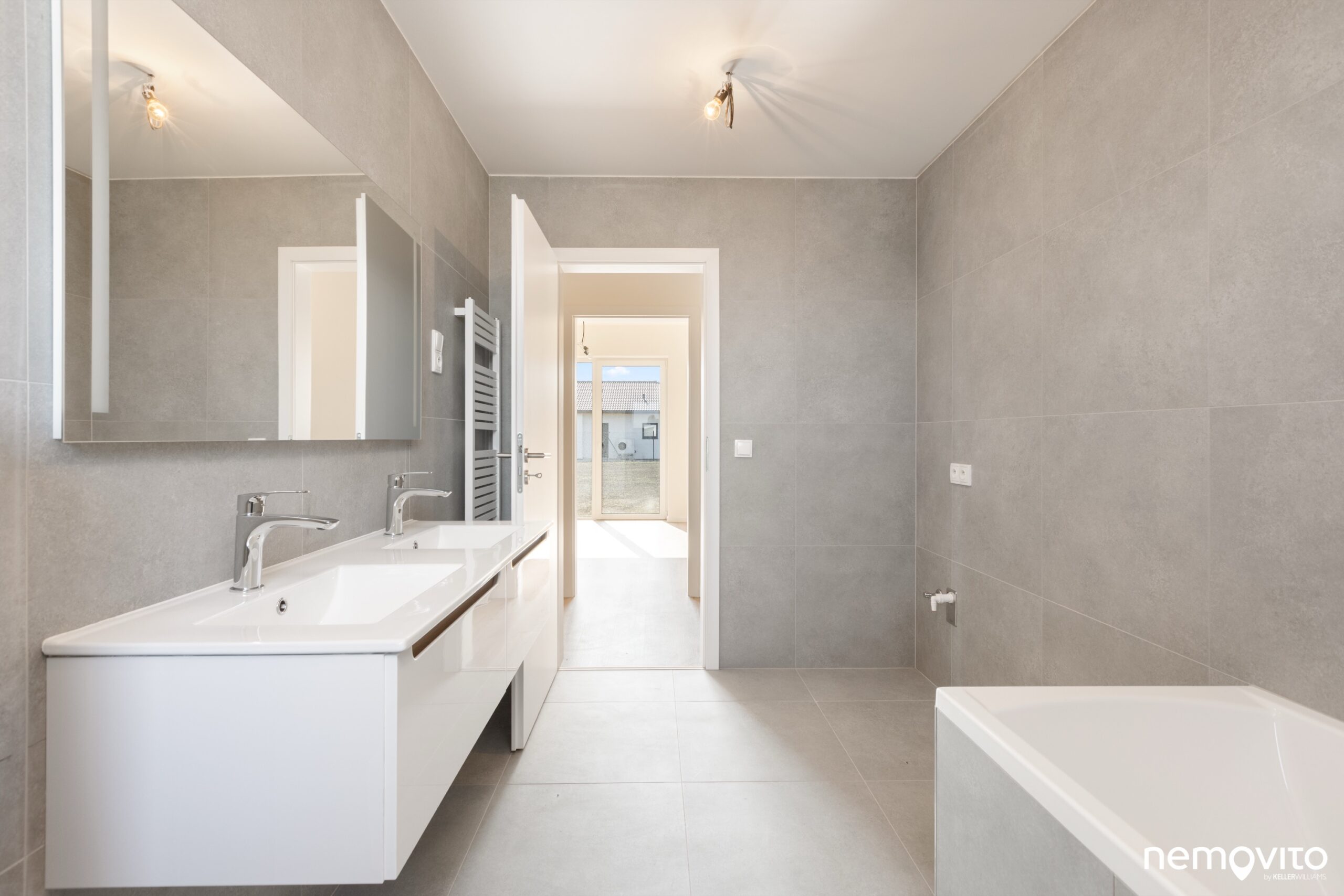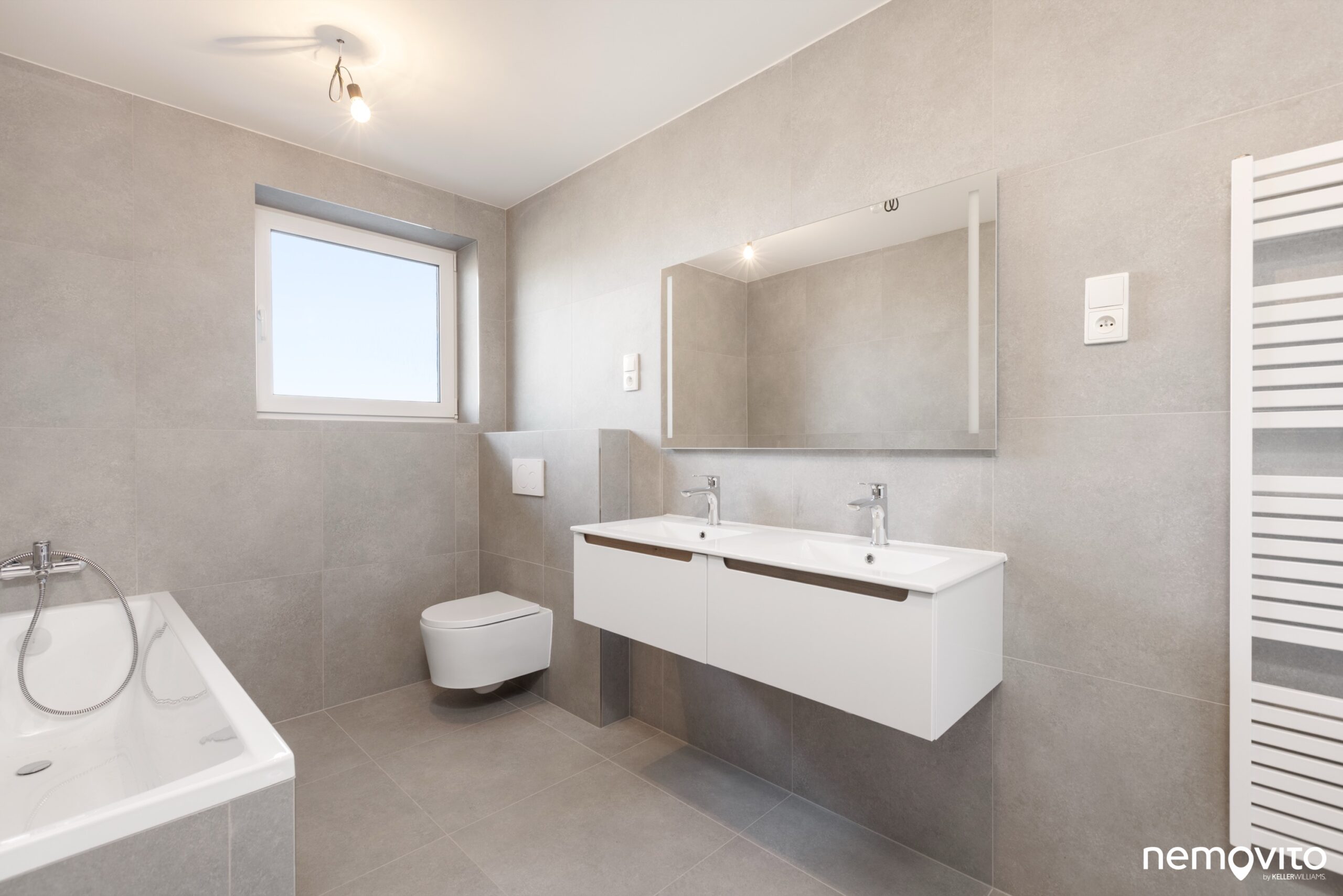 Koupelna v minimalistickém, moderním provedení, které jen tak nezestárne. Velkoformátová dlažba až ke stropu, hromada místa pro pračku a sušičku, a příjemná plocha 7 m2 s oknem.