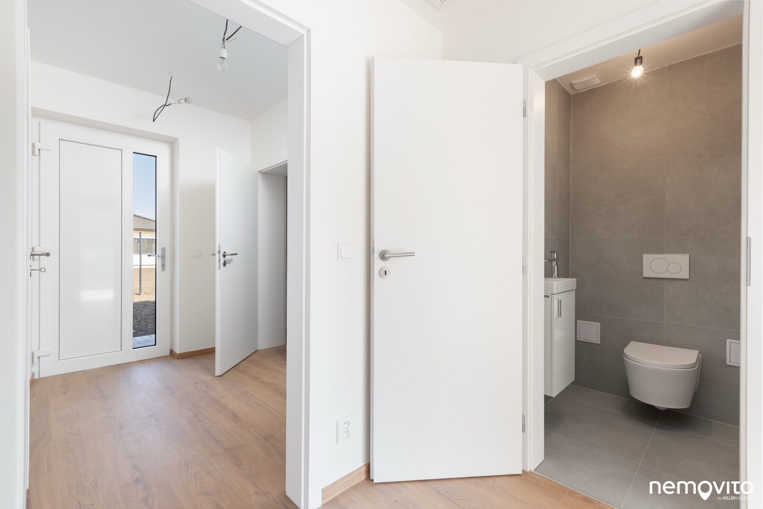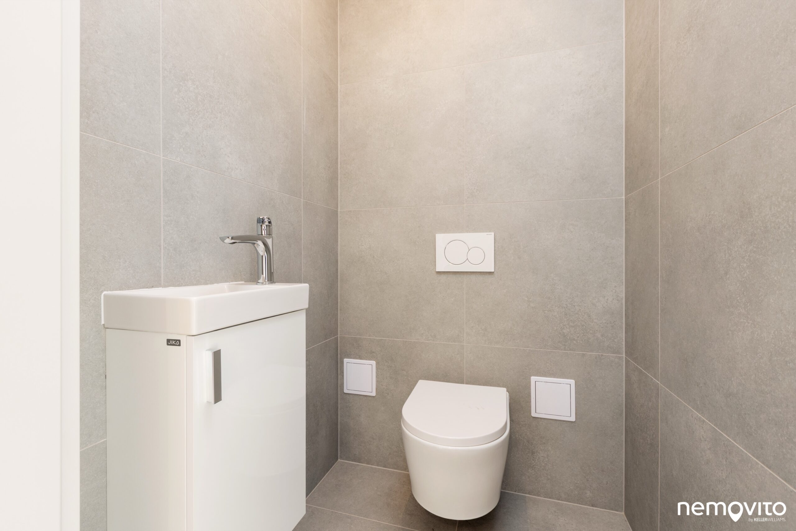 Velkoformátová dlažba a tlumené tóny. Obložení až po strop, všechno perfektně sladěné. Takhle vypadá moderní sociální zázemí rodinného domu. WC je oddělené a samozřejmě s umývátkem.