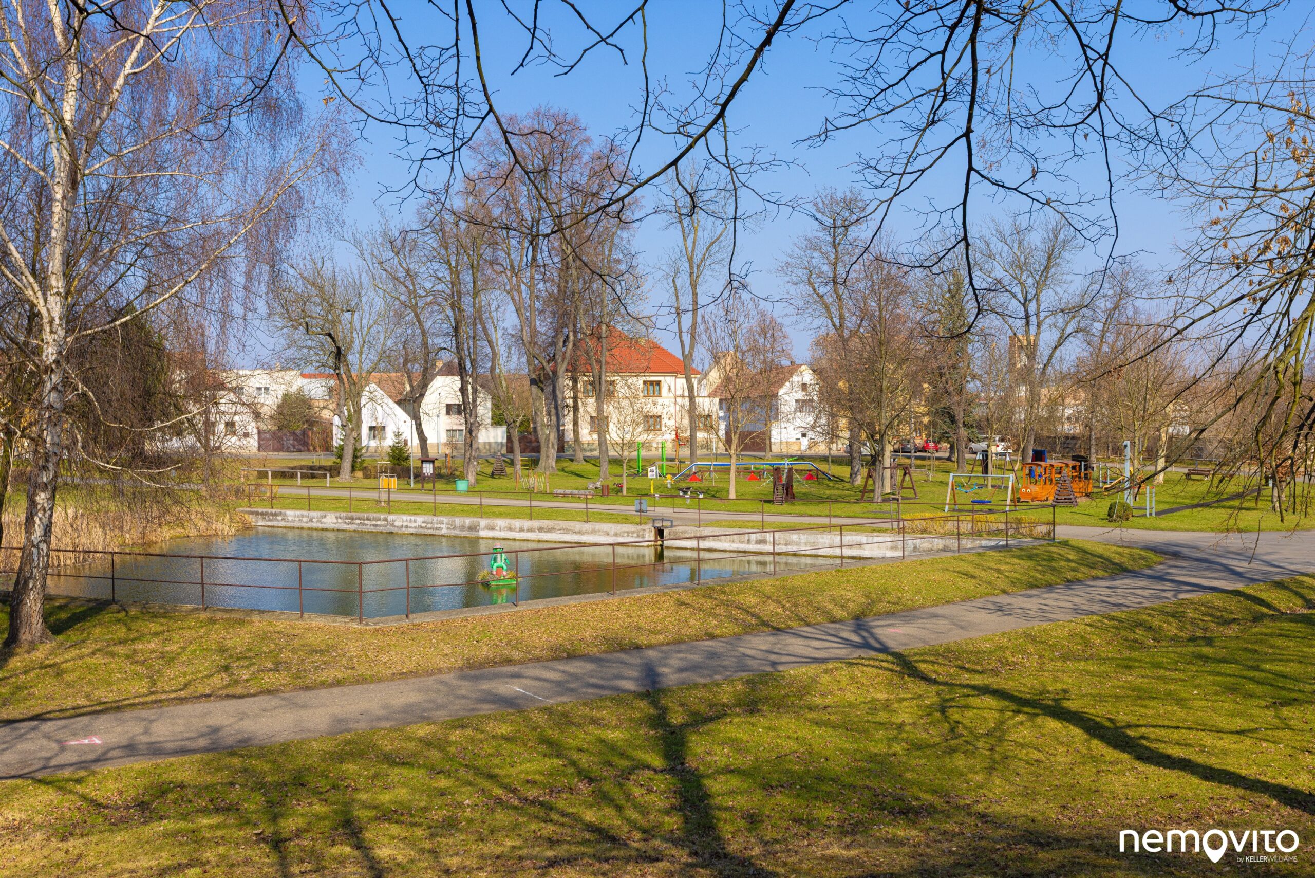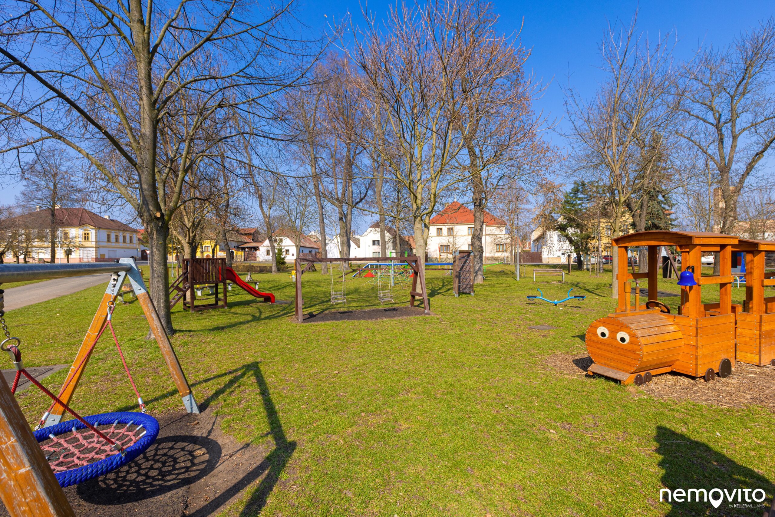 Náves je totálním rájem pro děti. Hromada místa, která je protkaná nespočtem prolejzaček, a kde si i v zimě pěkně zabruslíte.