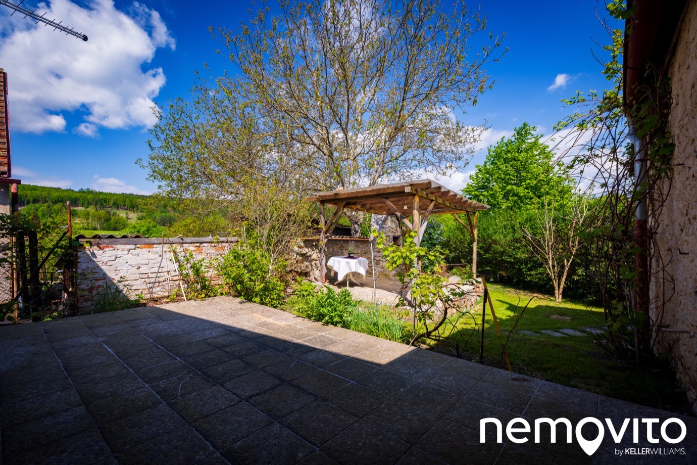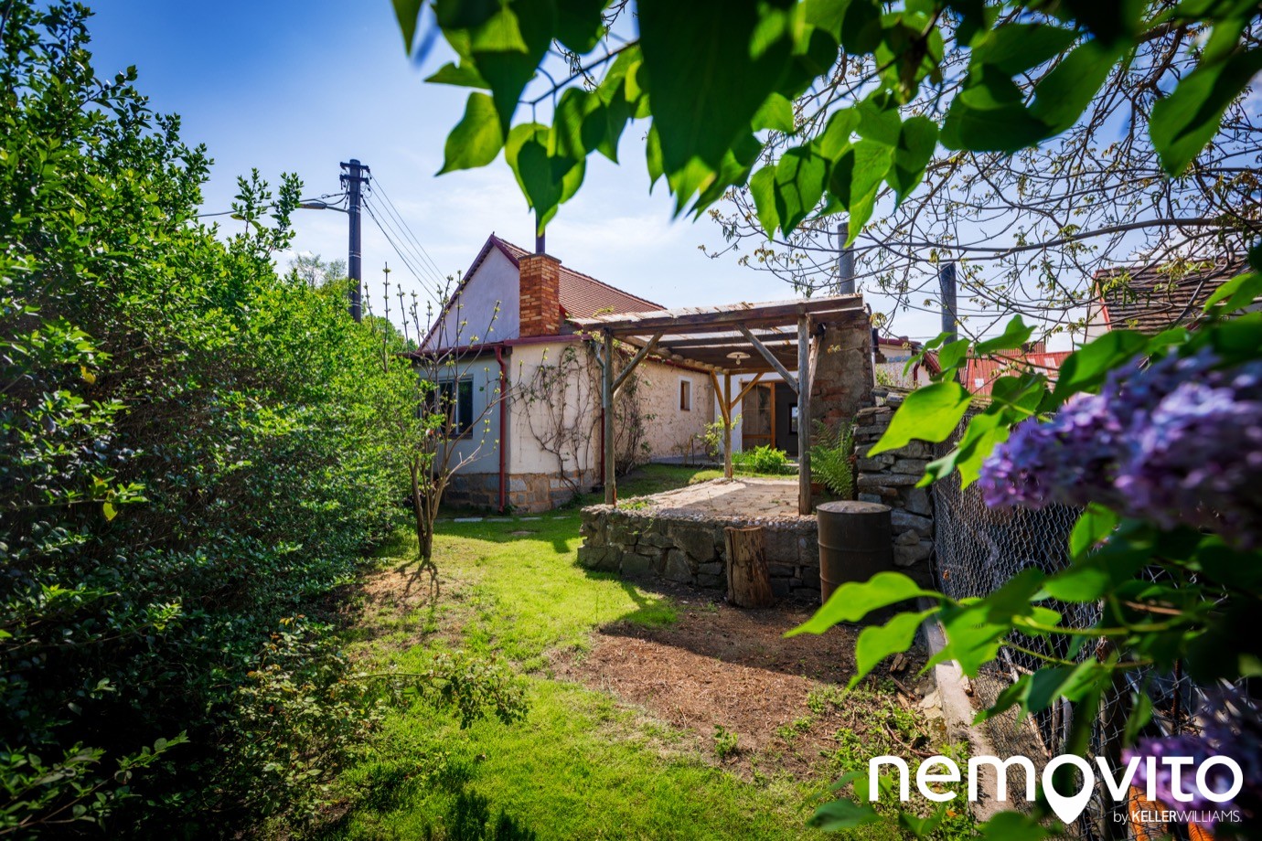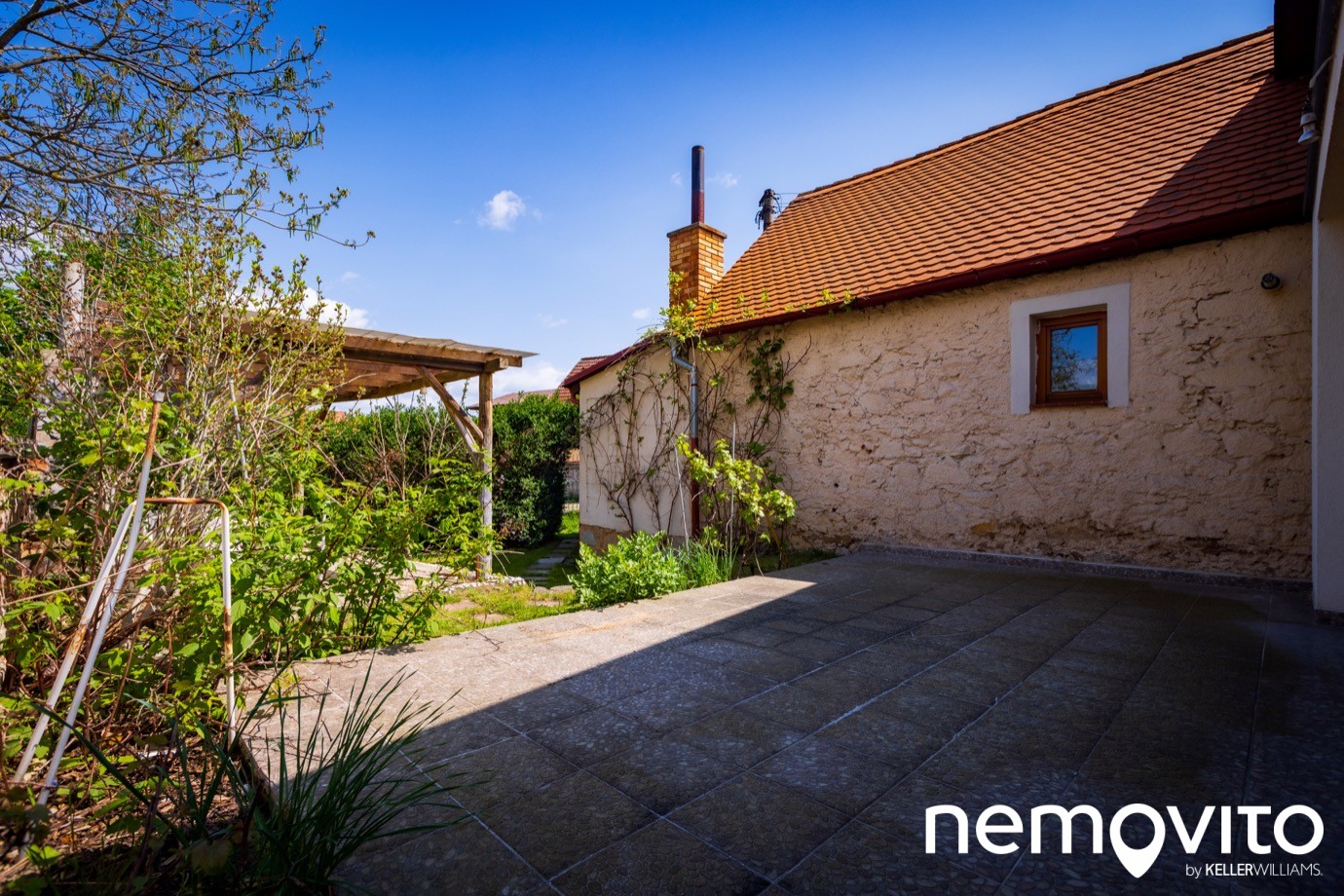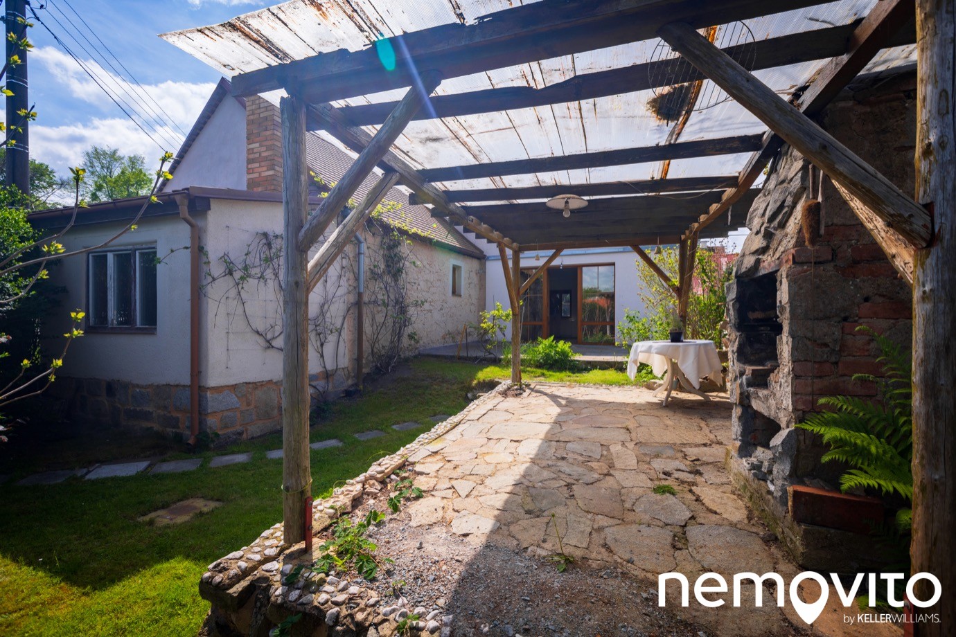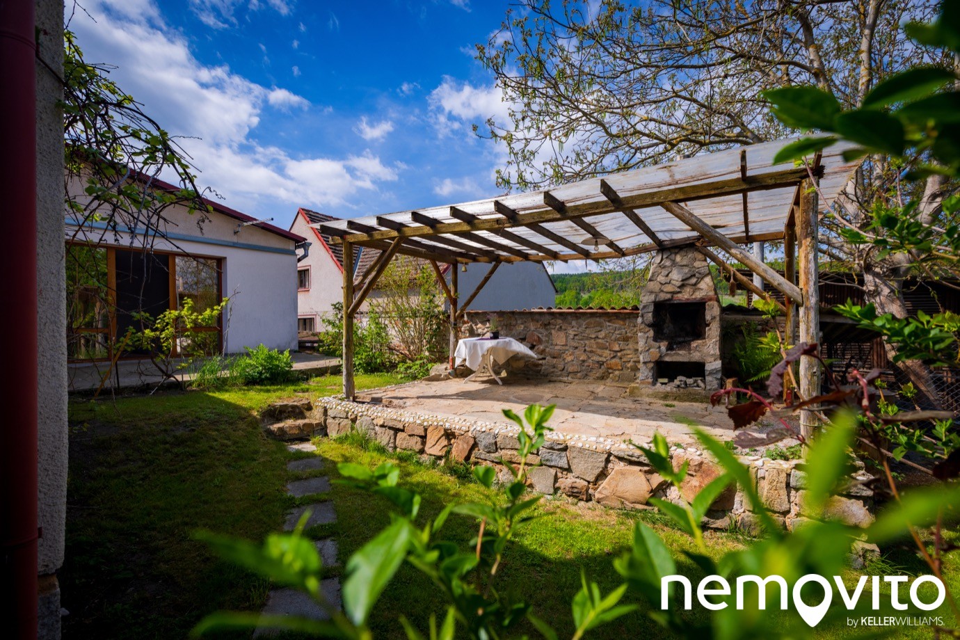 V něm vás čekají dvě terasy, z toho jedna krytá a s krbem. Nutno podotknout, že vytvořená pergola už je za hranicí své životnosti, ale pár sezon jistě ještě zvládne.