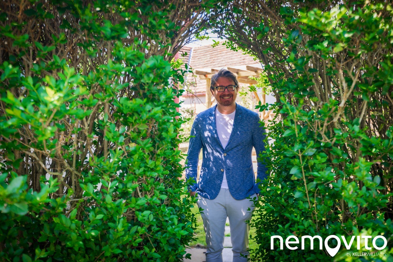 Nejprve si ale domek oběhneme dokola. Z jeho pravé strany je přistavěna zděná kůlna s komínkem, která může být využita jako dílna nebo úložný prostor. Vstup na pozemek demonstruje figurant na druhé fotce - průchod je ve křoví napravo od kůlny.