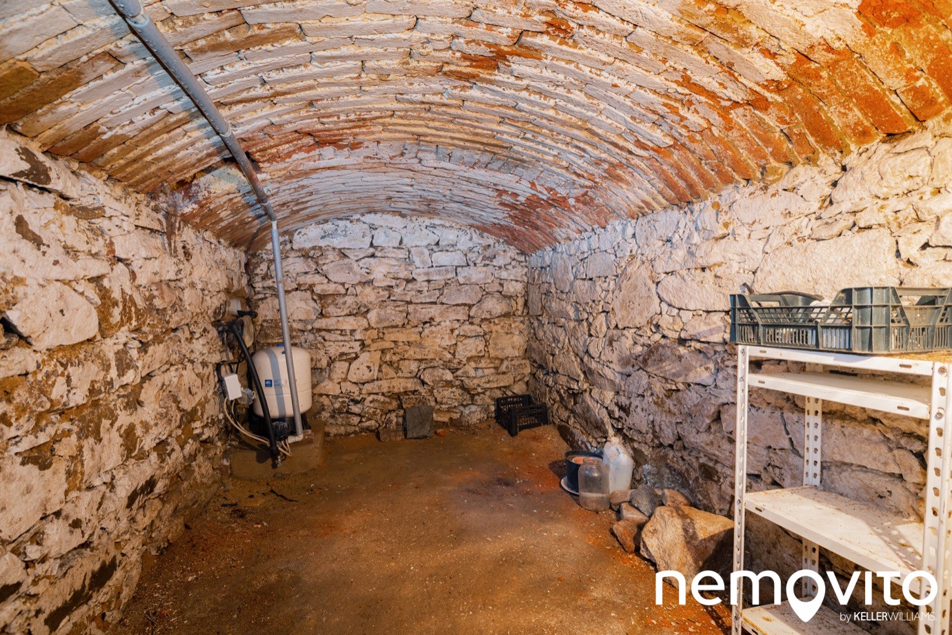 Za rohem se pak nachází komora a vstup do sklepa, který je řešen poklopem. Pod ním jsou schůdky a zhruba 7 metrová místnost s klenutým stropem a výškou 1.8 m. V rohu se nachází vodárna od studny.