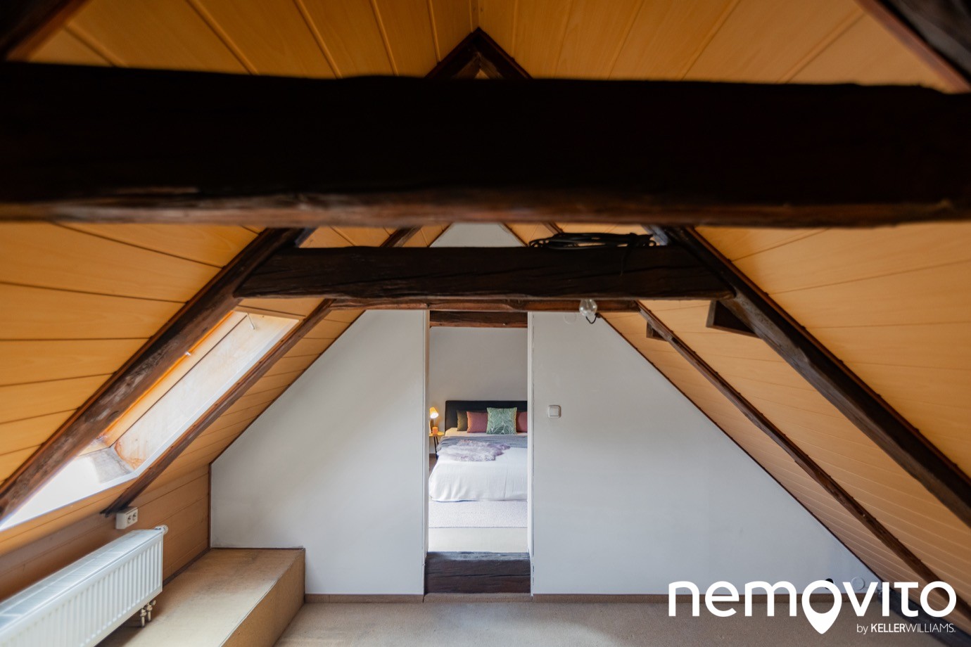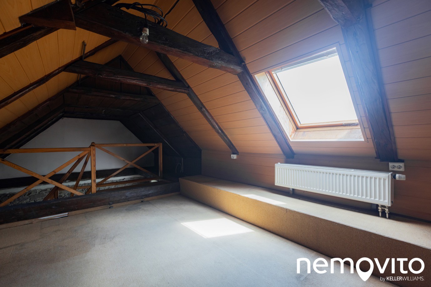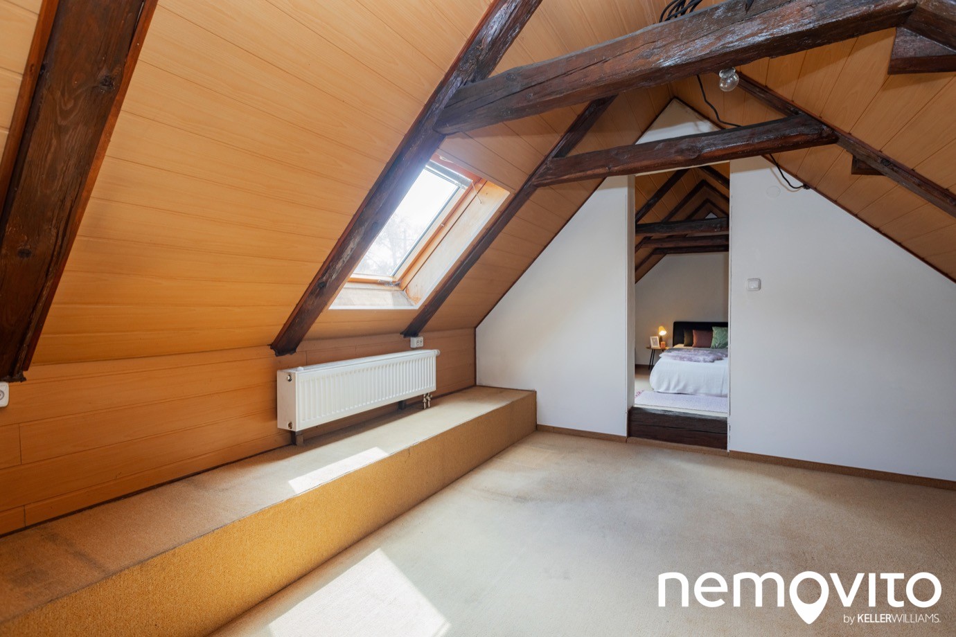 Výška stropu je omezená trámy, s více než 180 cm se pod ně nepostavíte. Zadní pokoj má velikost 19 m2. Střešní okna byla samozřejmě vyměněna při rekonstrukci.