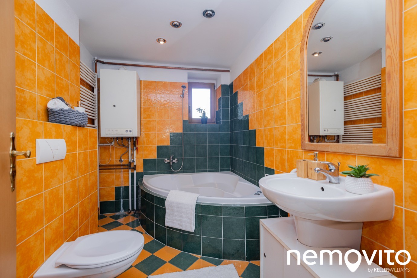 I koupelna je velkorysá (necelých 6 m2), vejde se do ní rohová vana, toaleta i plynový kotel.