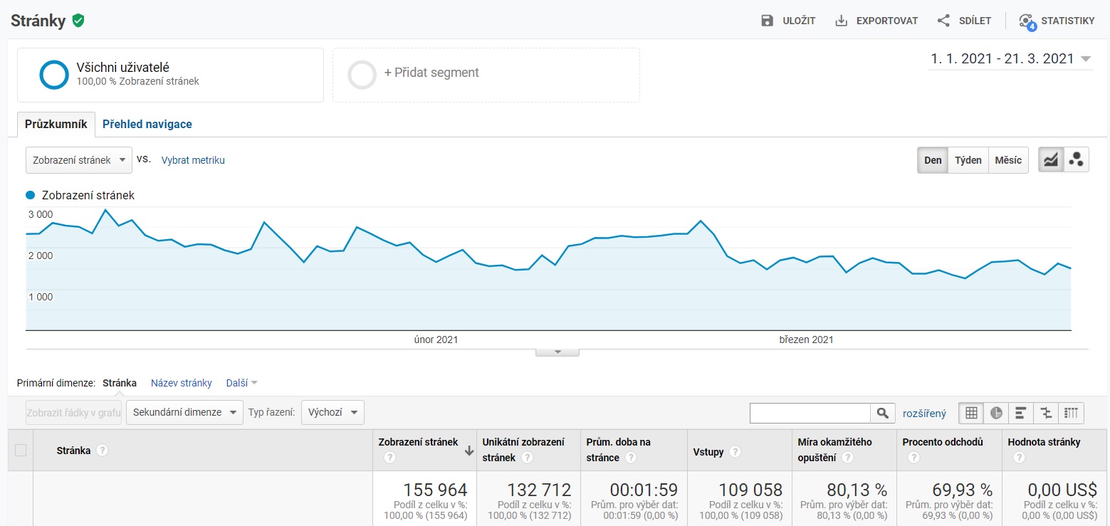 Takto vypadá počet zobrazení stránek od začátku roku do 21. března. Pokud se mají nemovitosti dobře a rychle prodávat, musí být vidět. Když návštěvníci stráví jejich prohlížením tisíce hodin měsíčně, pak šance výrazně roste.