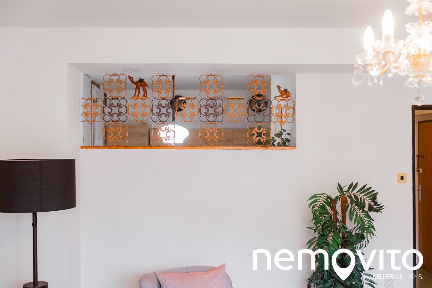 Zpátky do obýváku a směrem ke kuchyni. Ta je od něj aktuálně oddělená polopříčkou - kuchyně se nachází dobovou zdobnou mřížkou ve zdi.