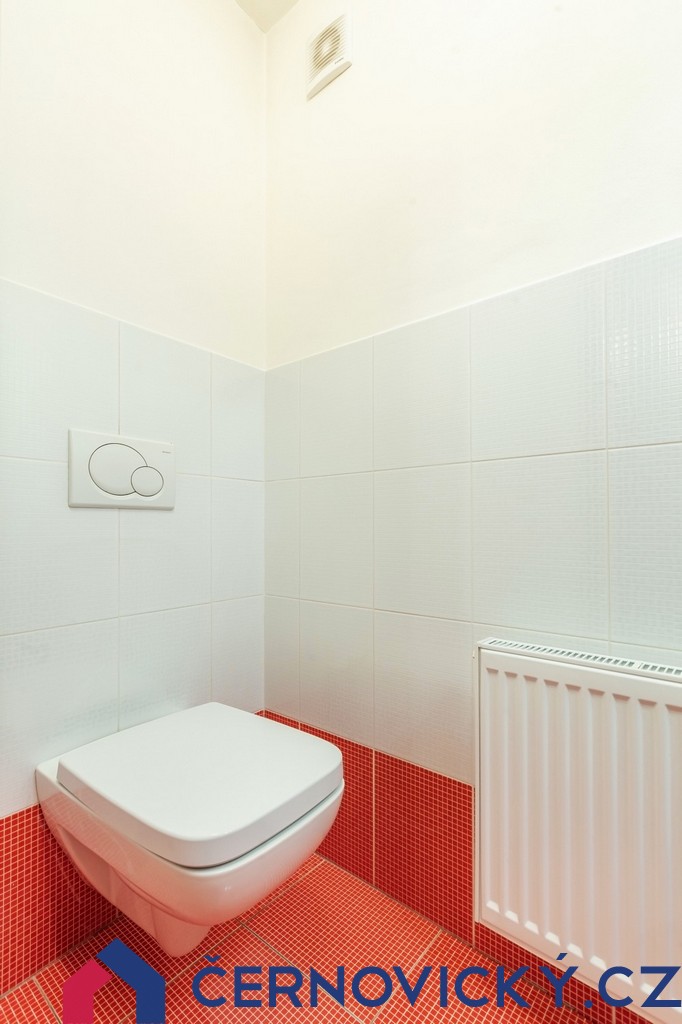 V takto velkém bytě pochopitelně nechybí samostatná toaleta pro návštěvy. Jak již bylo zmíněno, přístup do bytu je přes vlastní, uzamčené schodiště. Dole je místo pro umístění botníku či skříně.