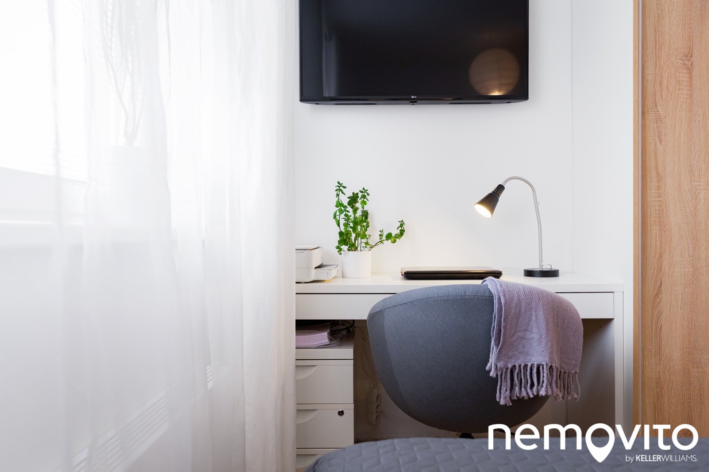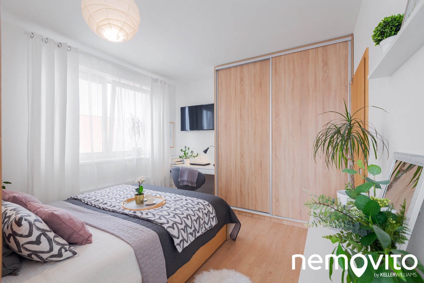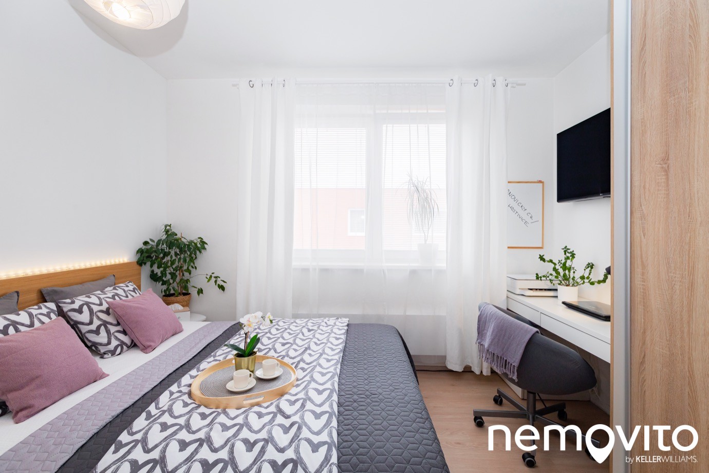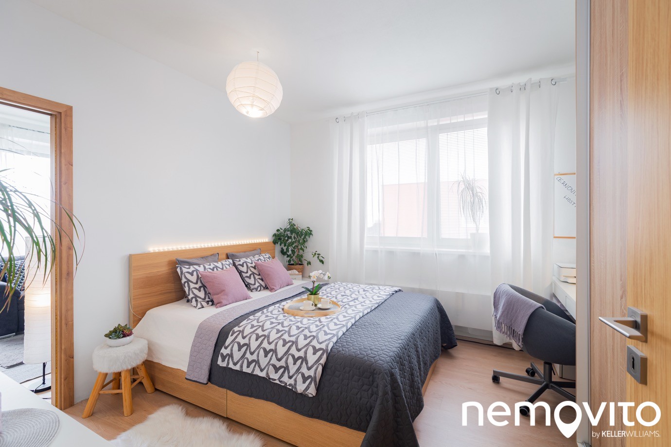 Mimo velké postele a skříně zůstal prostor i pro pracovní kout, ohrožený tedy nebude ani váš home office. Ten budete ale trávit stejně spíš na terase.