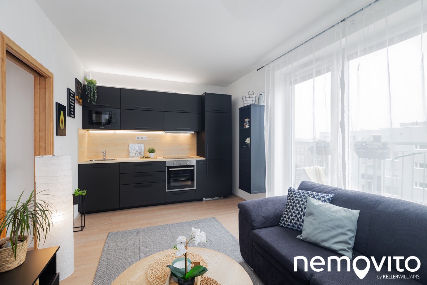 A začneme třeba právě u kuchyně. Ta bývá často jedním z nejslabších článků nemovitostí, které jsou zaměřeny na dostupnou cenu. Linka v černé matné barvě po celé délce stěny bytu ale prozrazuje, že tady záleželo taky na tom, aby i malý byt skvěle vypadal.