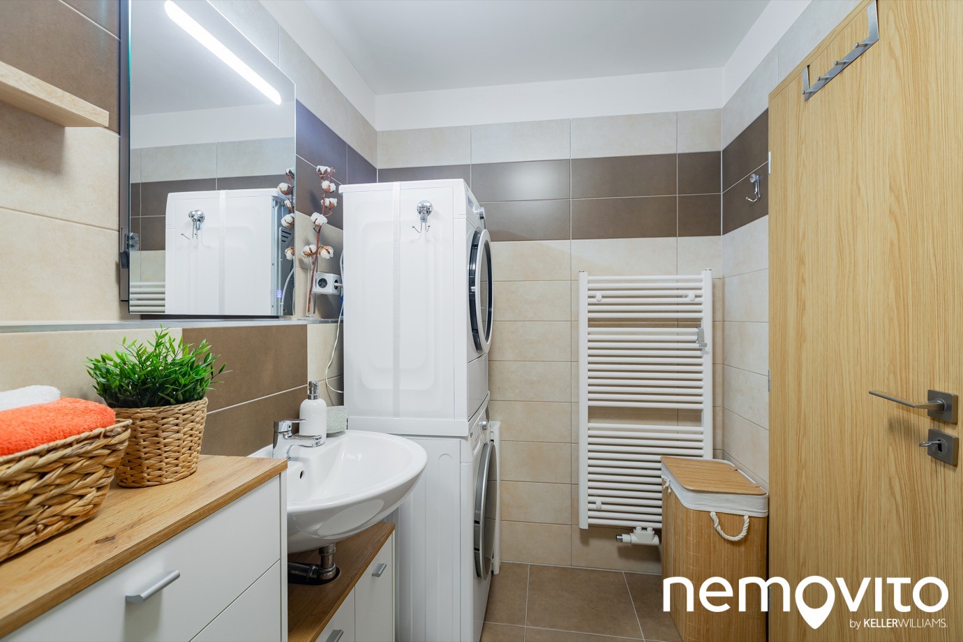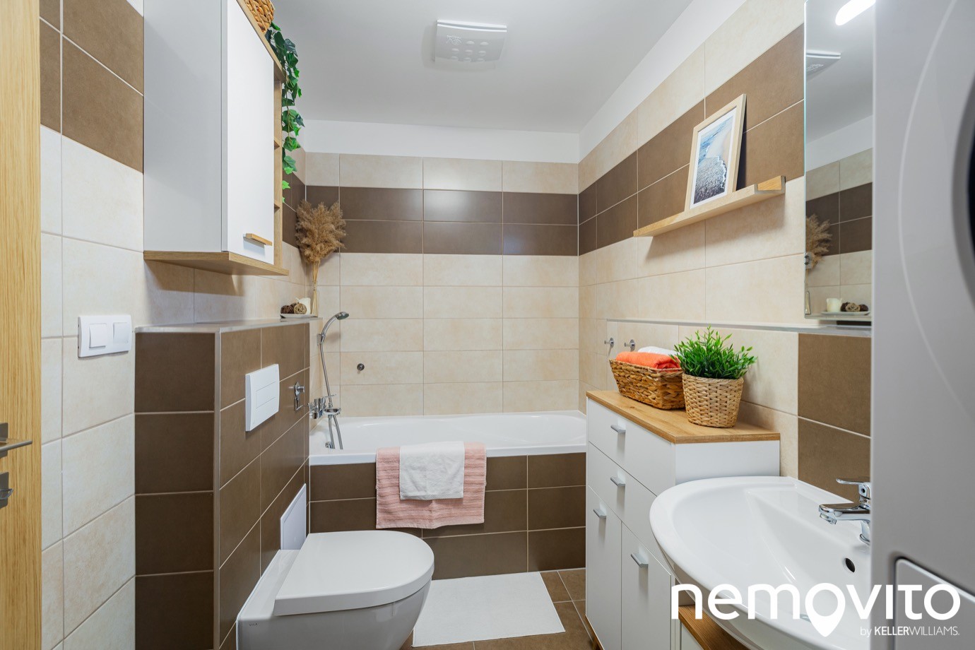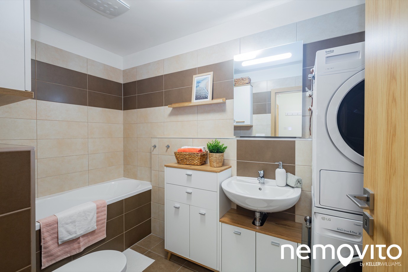 5.5 m2, kam se s přehledem vejde vana, toaleta, pračka se sušičkou a spousta skříněk. Takhle velkou koupelnu mohou často závidět i byty 3+kk.