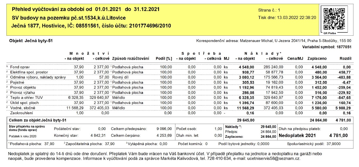 Vyúčtování poplatků za byt - 2021