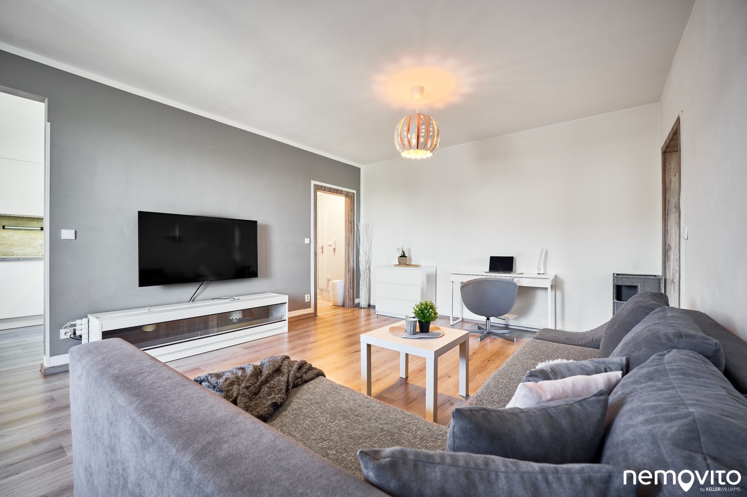 Obývací pokoj s velkými oknem na balkon je orientovaný na východ, takže bez letních nesnesitelných teplot. Byt je nad vámi i pod vámi, bát se tedy nemusíte ani tepla od střechy. Hlavní prostor bytu má 25 m2.