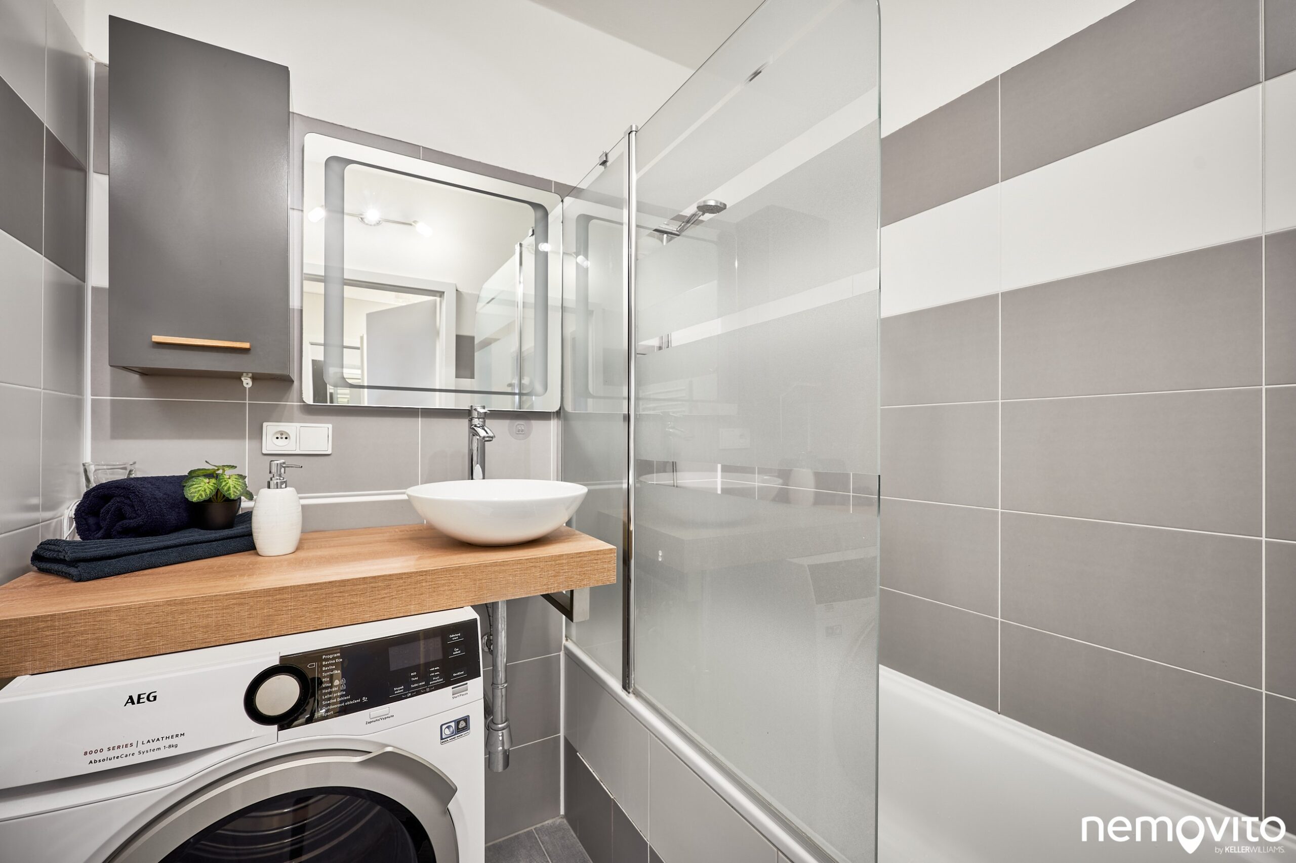 Hned při vstupu vás naproti komoře čeká oddělená toaleta a koupelna s vanou, která pojme také pračku.