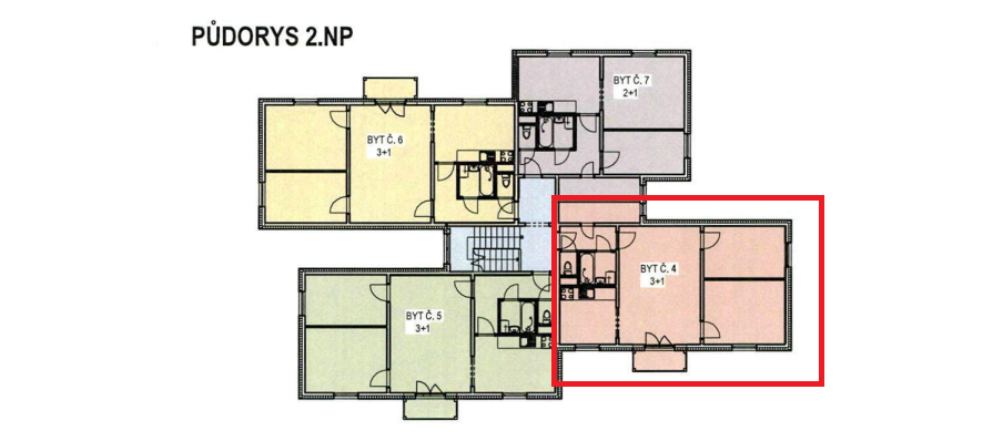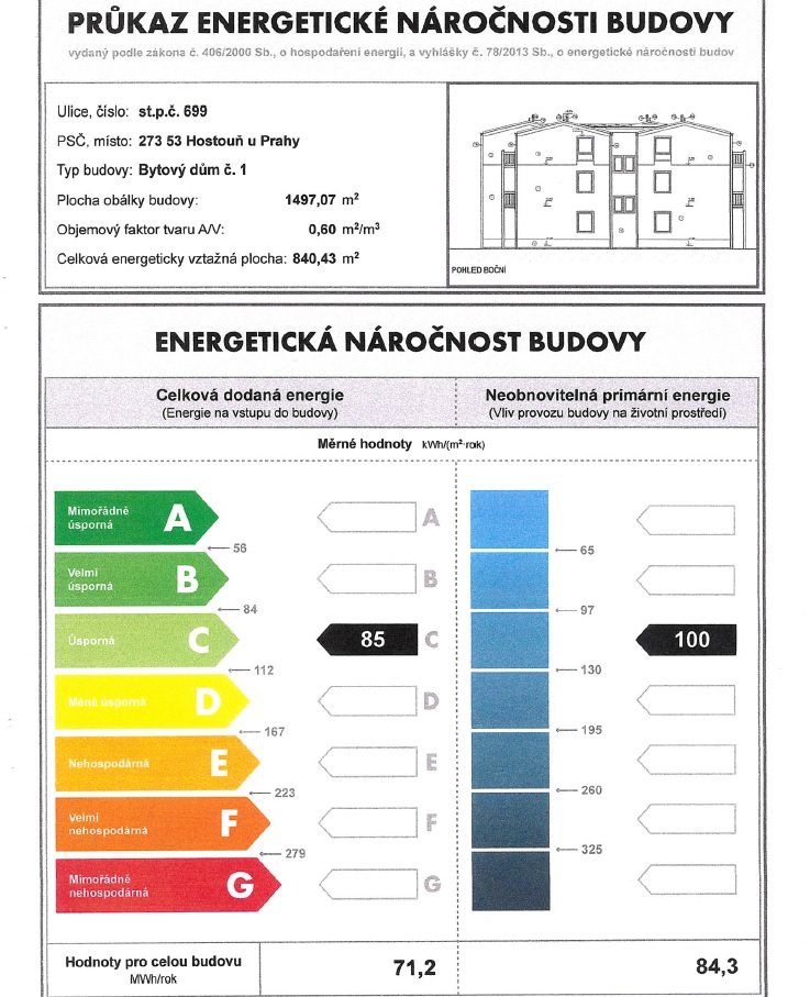 Výtah v domě nehledejte, sklepy ale ano. Každá jednotka má k dispozici vlastní kóji, která se nachází v přízemí. Vstup do domu je v závětří a z boku.
