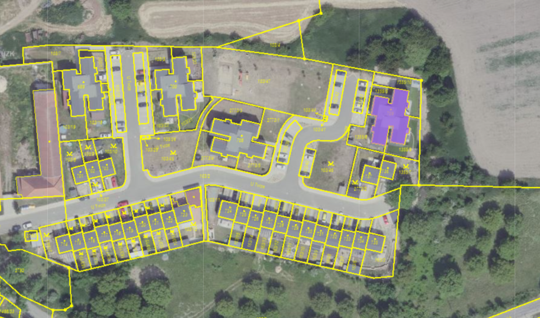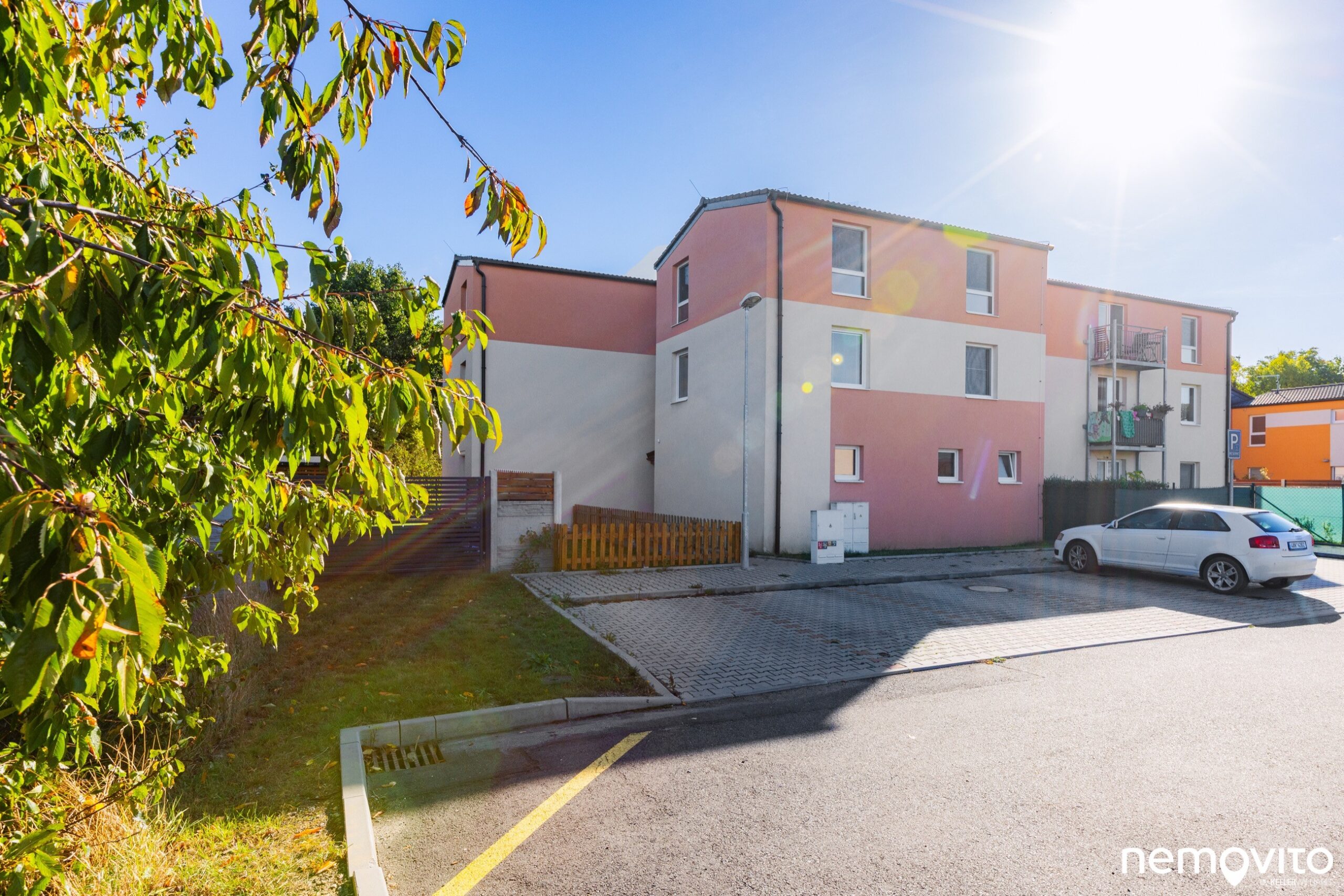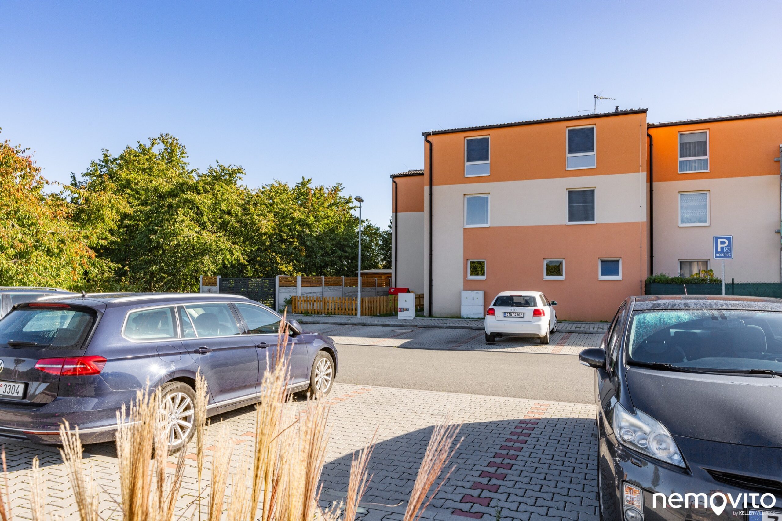 Auto zaparkujete na vyhrazeném stání před domem, které náleží výhradně k tomuto bytu. Před tímto konkrétním domem pak nestojí žádný další, neboť je volná plocha využita pro dětské hřiště.