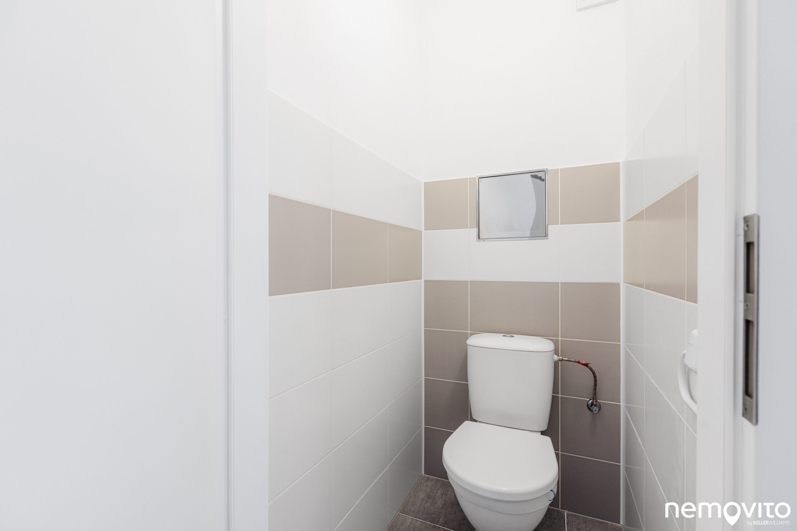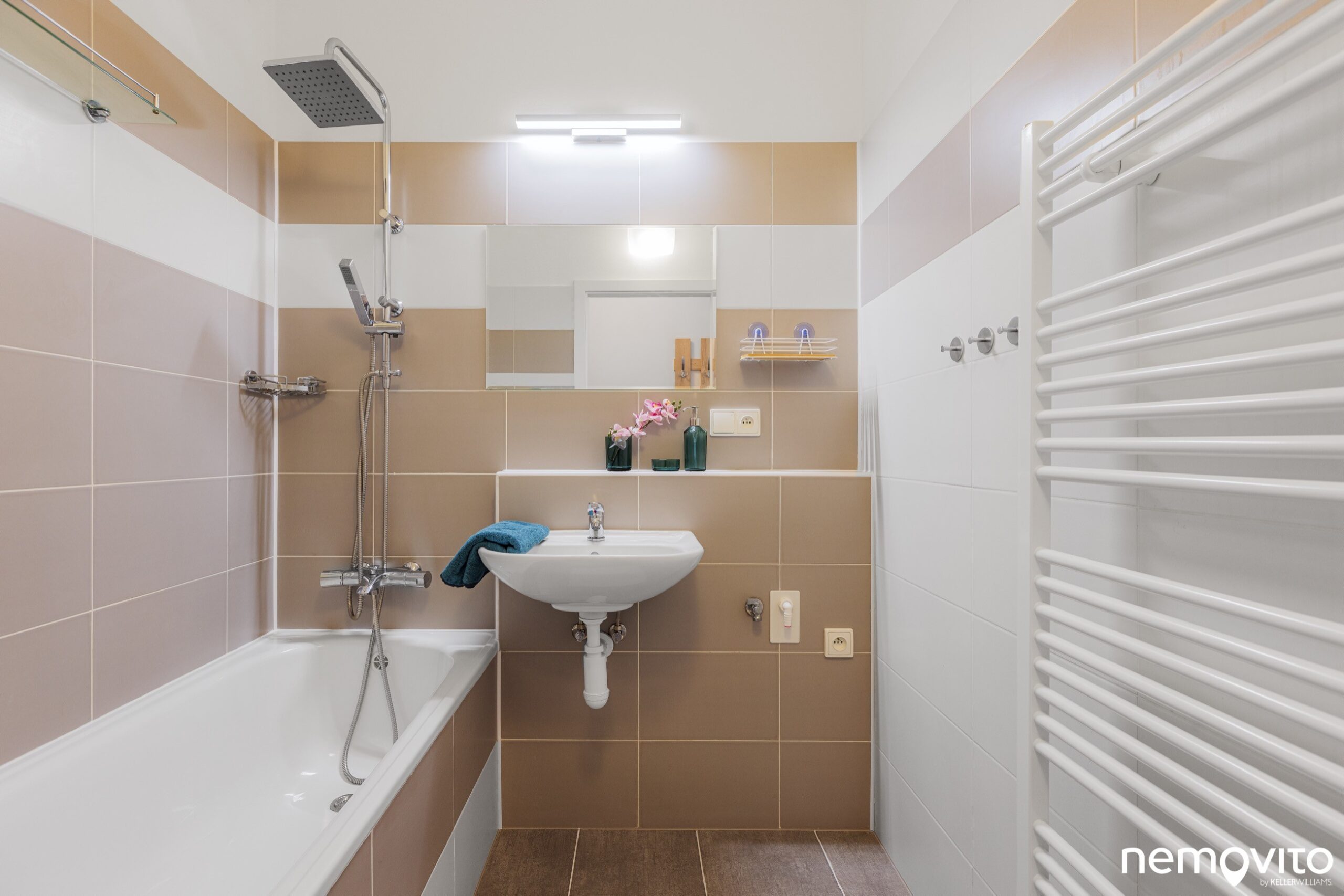 Koupelna i toaleta jsou provedení bez výstřelků, tedy žádné divoké barvy. Důležité je, že jsou od sebe oddělené. Místo na pračku je vedle umyvadla v koupelně.
