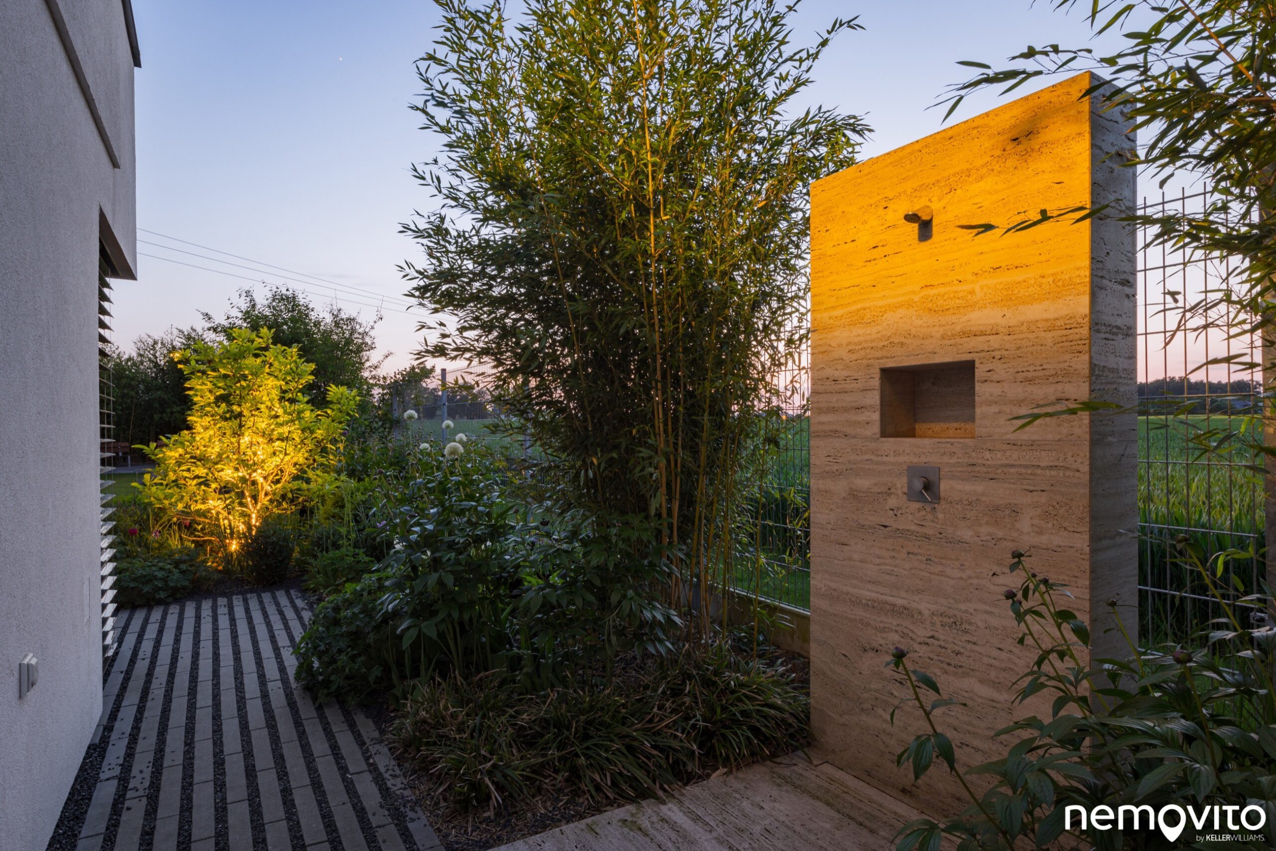 Kryté venkovní posezení s volným výhledem na zeleně, kde tu pravou klidovou atmosféru utváří dřevěná osvětlená socha, jež nese název Modlitba. Pokud by vám z toho klidu bylo horko, pak se můžete osvěžit ve venkovní sprše. Ta je provedena jak jinak, než v travertinu. Lze ji používat i v chladnějších dnech, je totiž vybavena průtokovým ohřívačem.