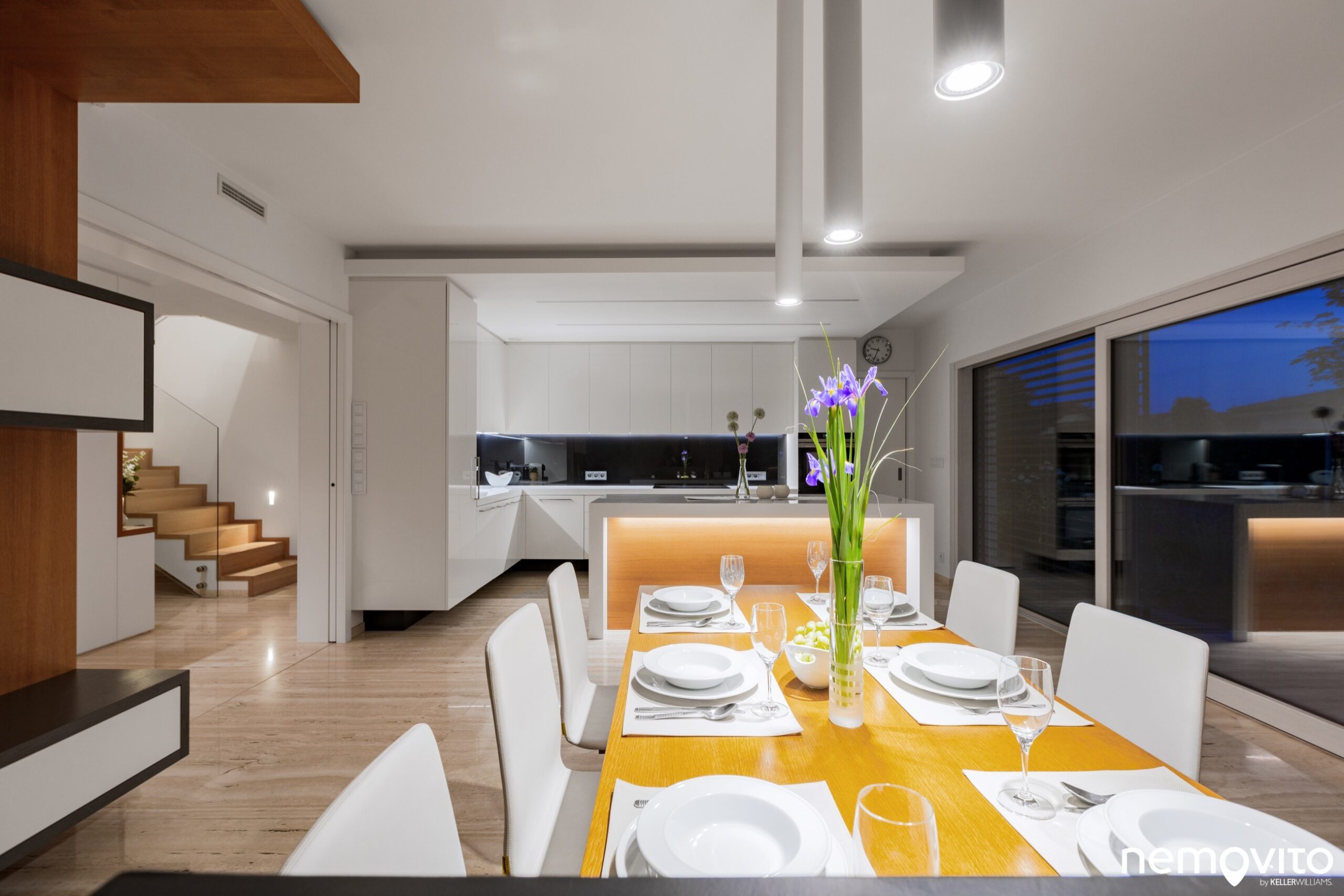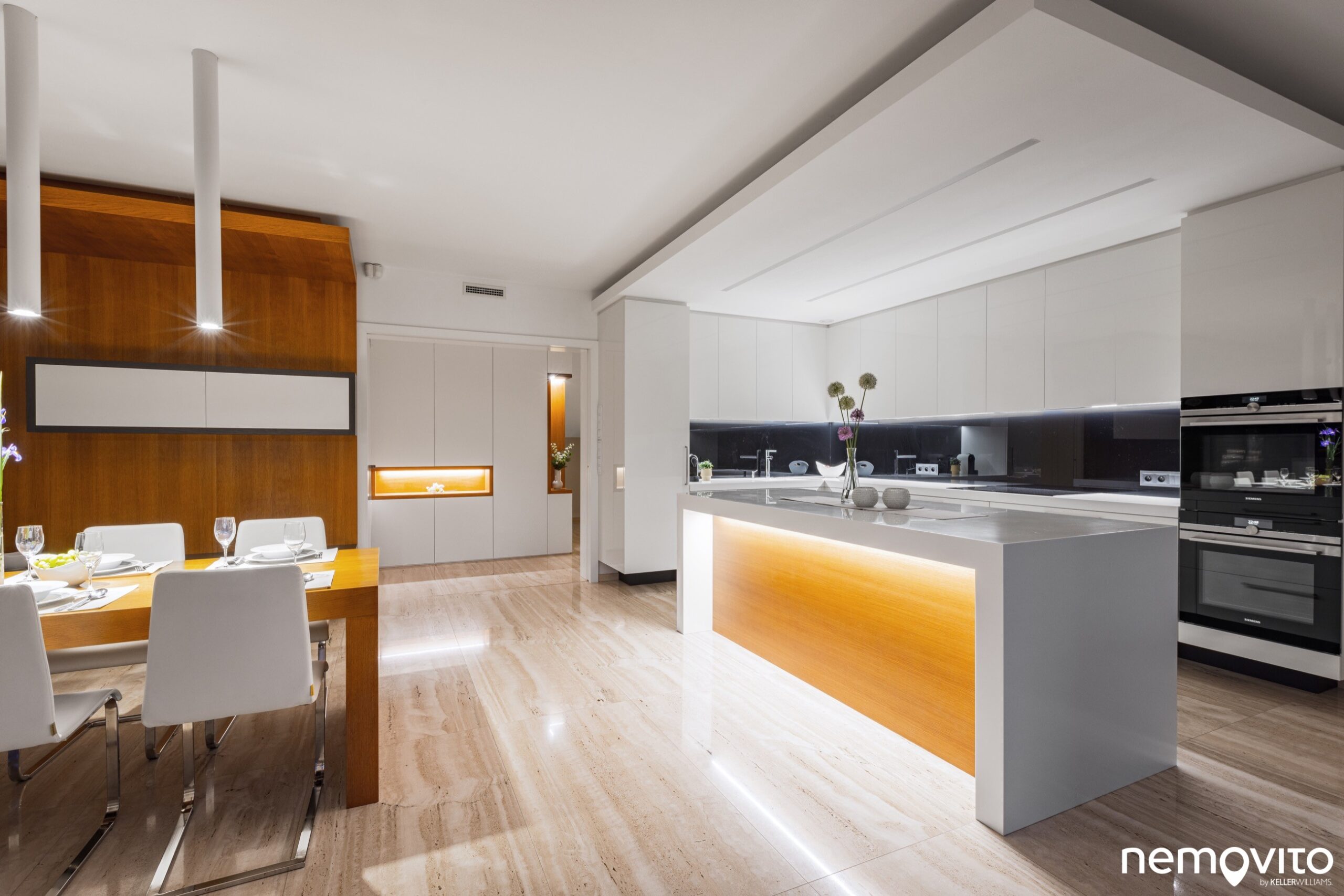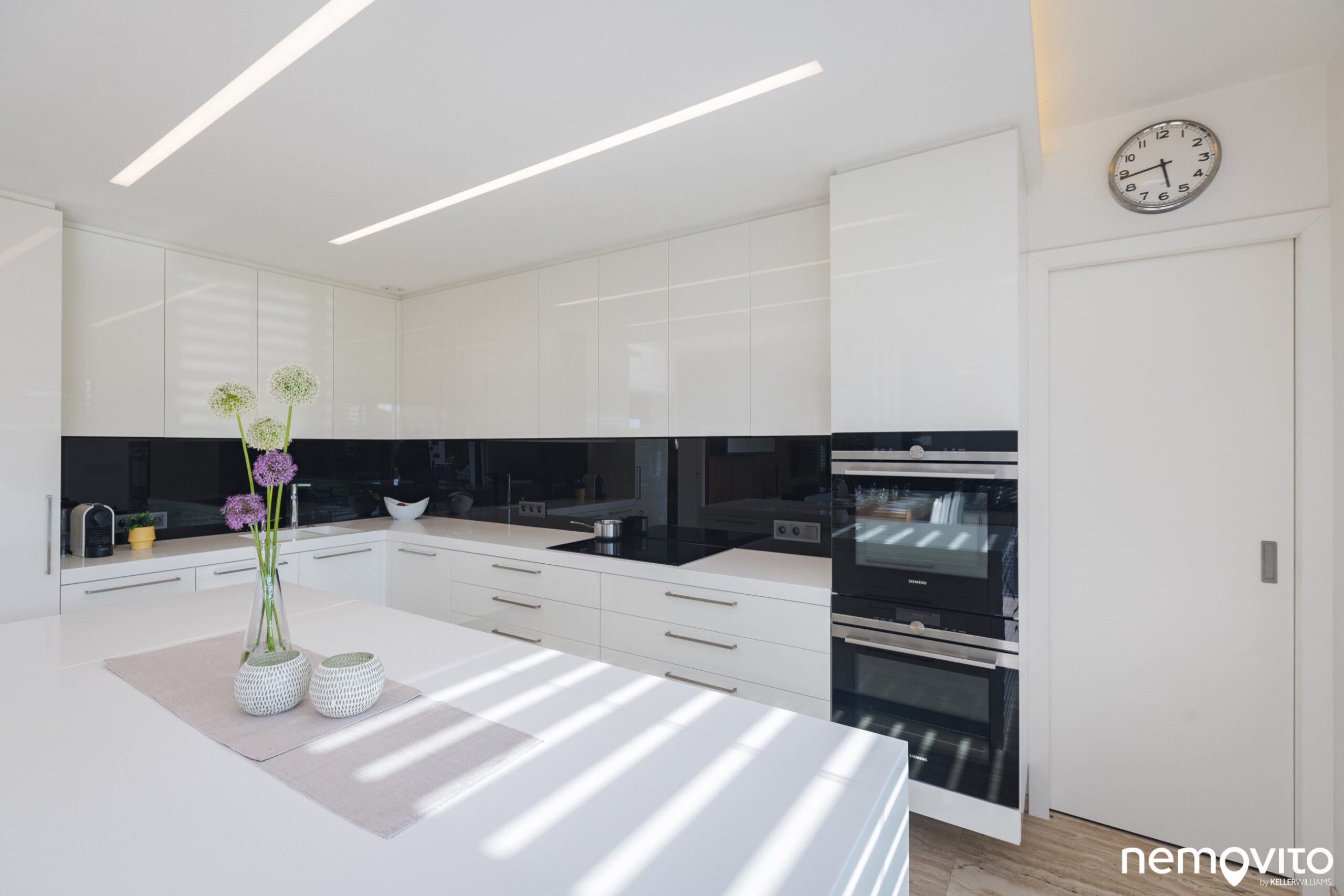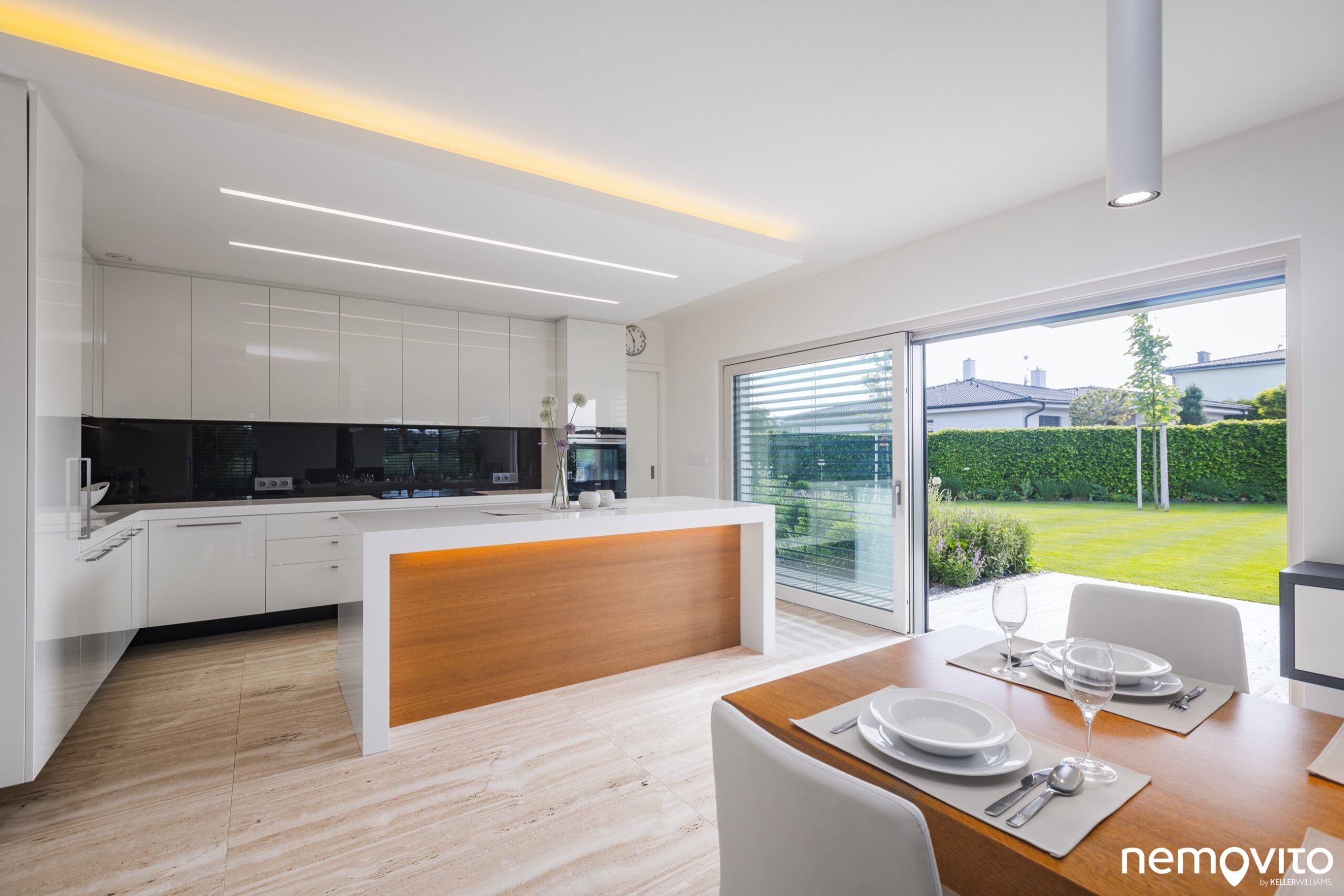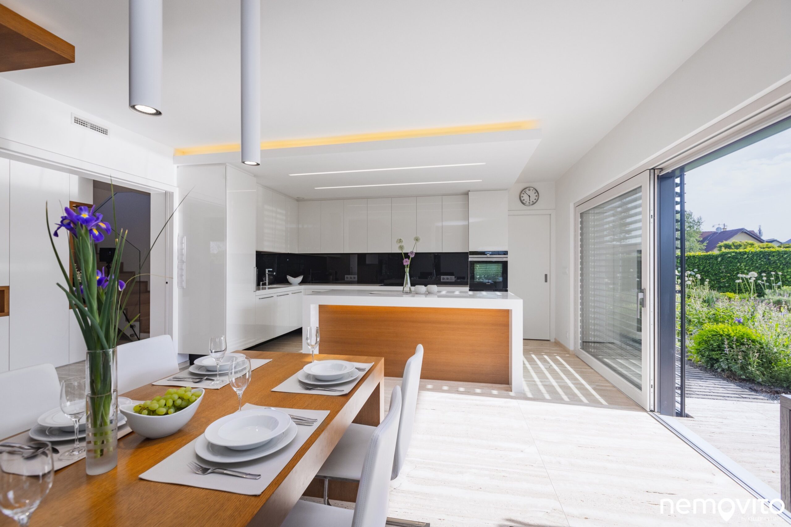 Vychytané a pestré osvětlení rozzáří vaše večery do mnoha podob. Podsvětlený je taktéž podhled nad kuchyňskou linkou i pásky, které jsou v podhledu ukryté. Při stropu si taktéž můžete všimnout mřížek rekuperace, tedy systému řízeného větrání.