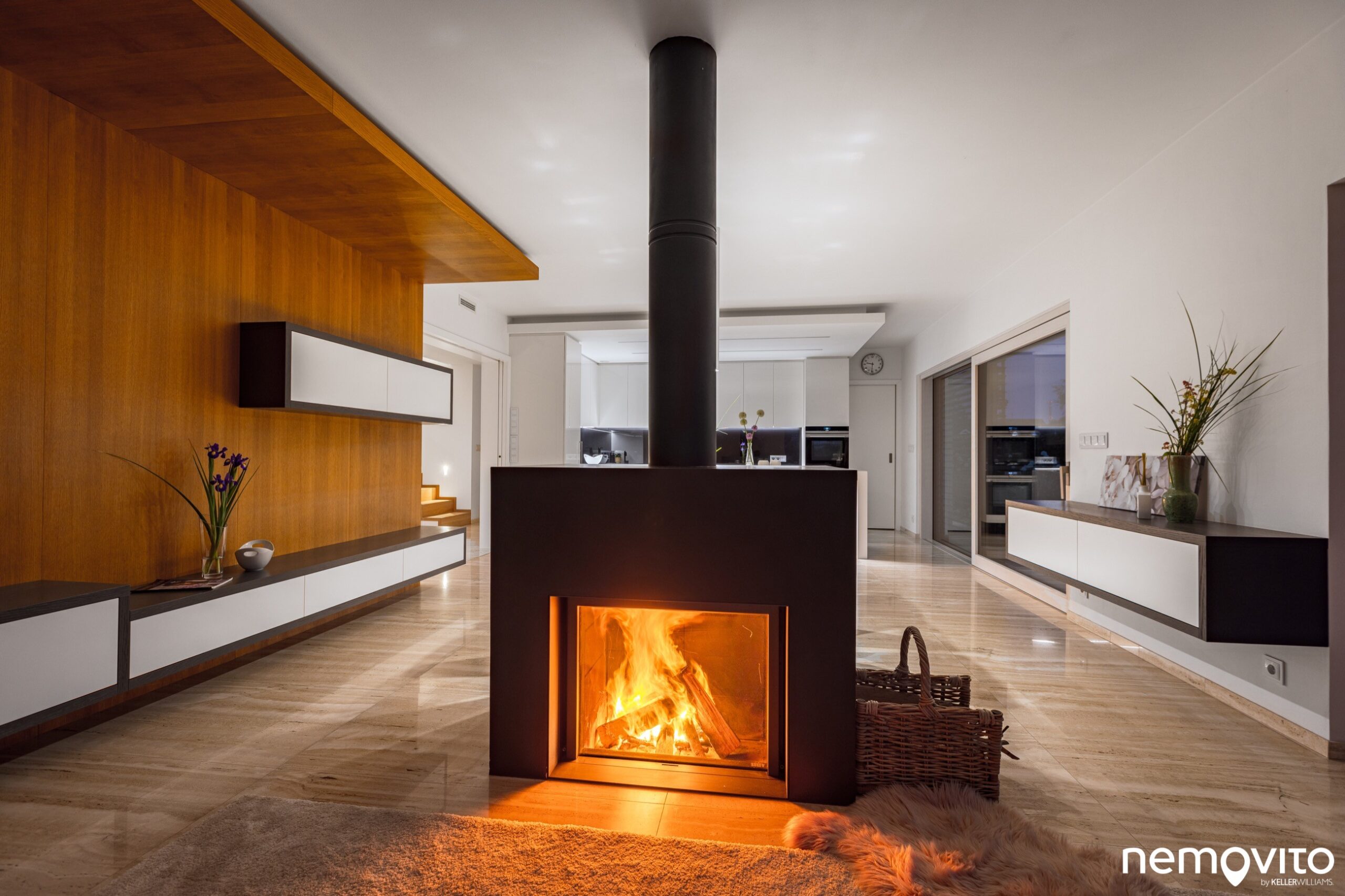 Patříte-li mezi milovníky ohně, pak vás jistě potěší krb, který tvoří dominantu prostoru obývacího pokoje. A samozřejmě, ani on není obyčejný. Ohniště je totiž zapuštěné do podlahy a navazuje do stejné úrovně. Opět drobnost, efekt však skvělý. I díky tomu se na krb budete rádi dívat, i když zrovna nehoří a venku svítí sluníčko.