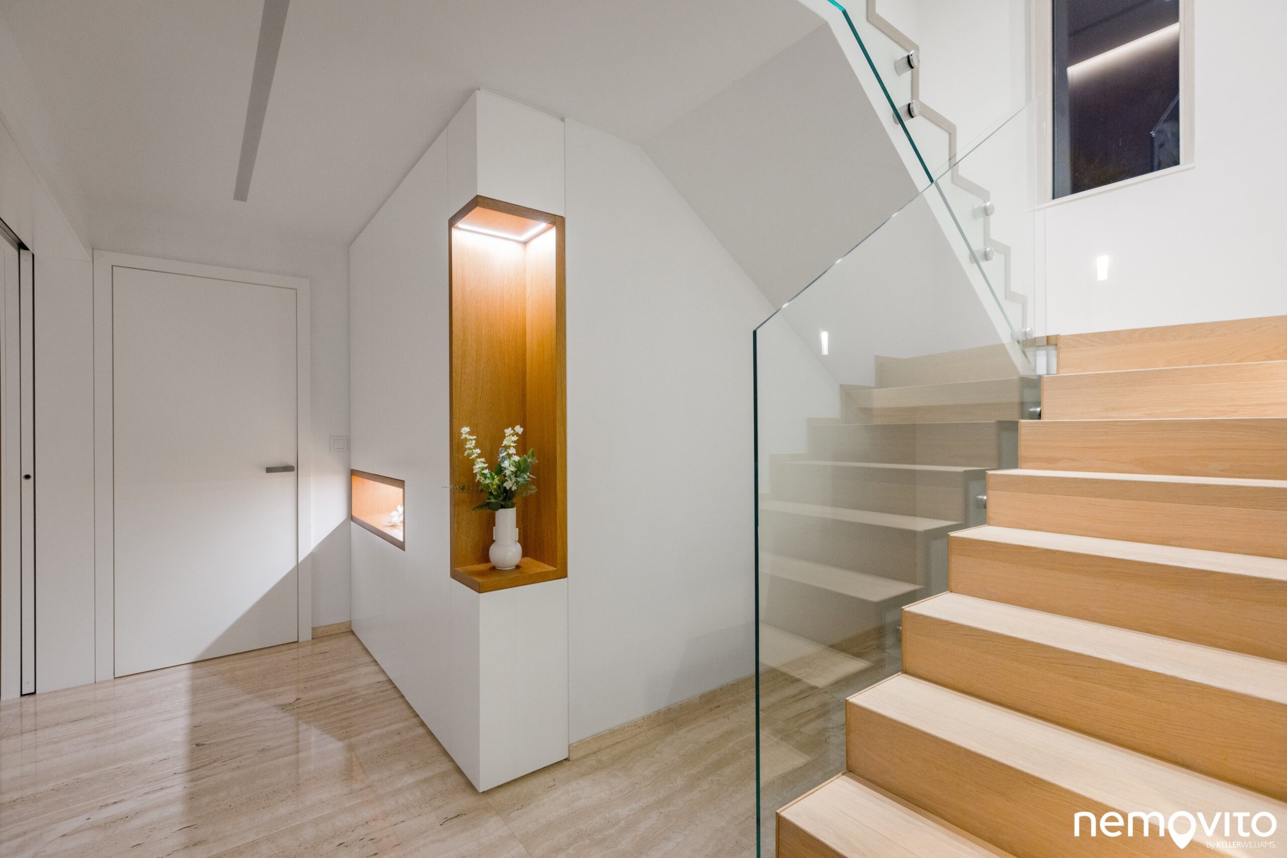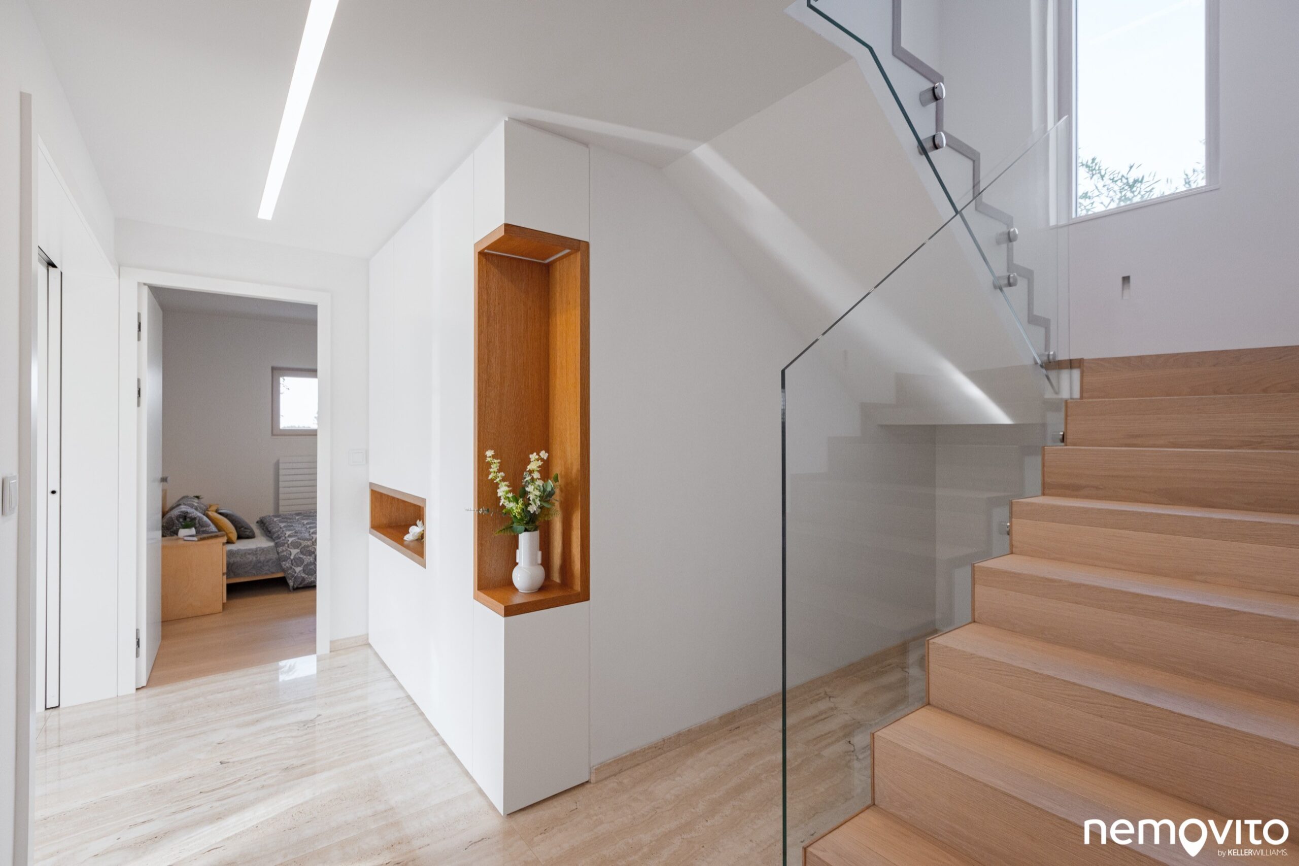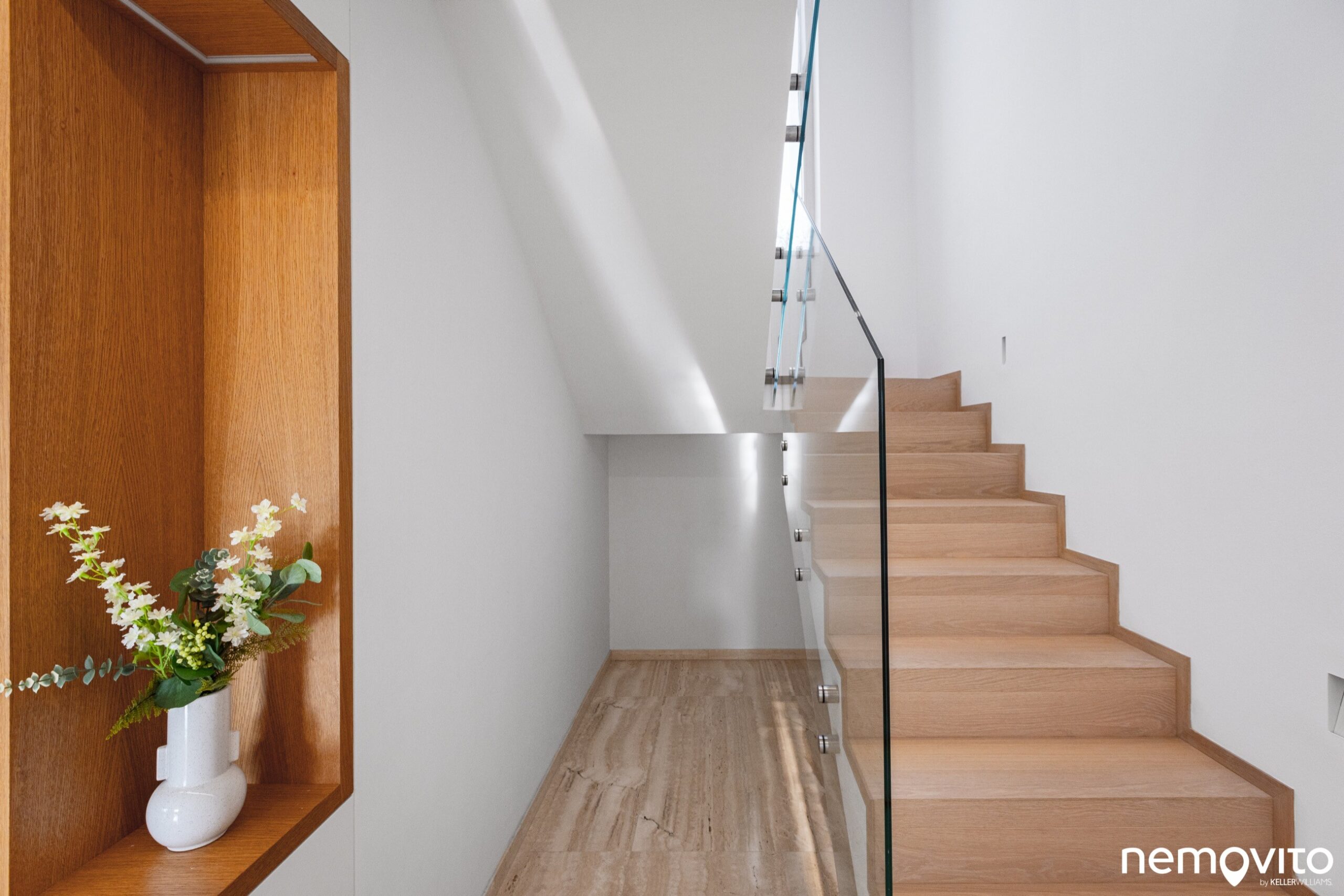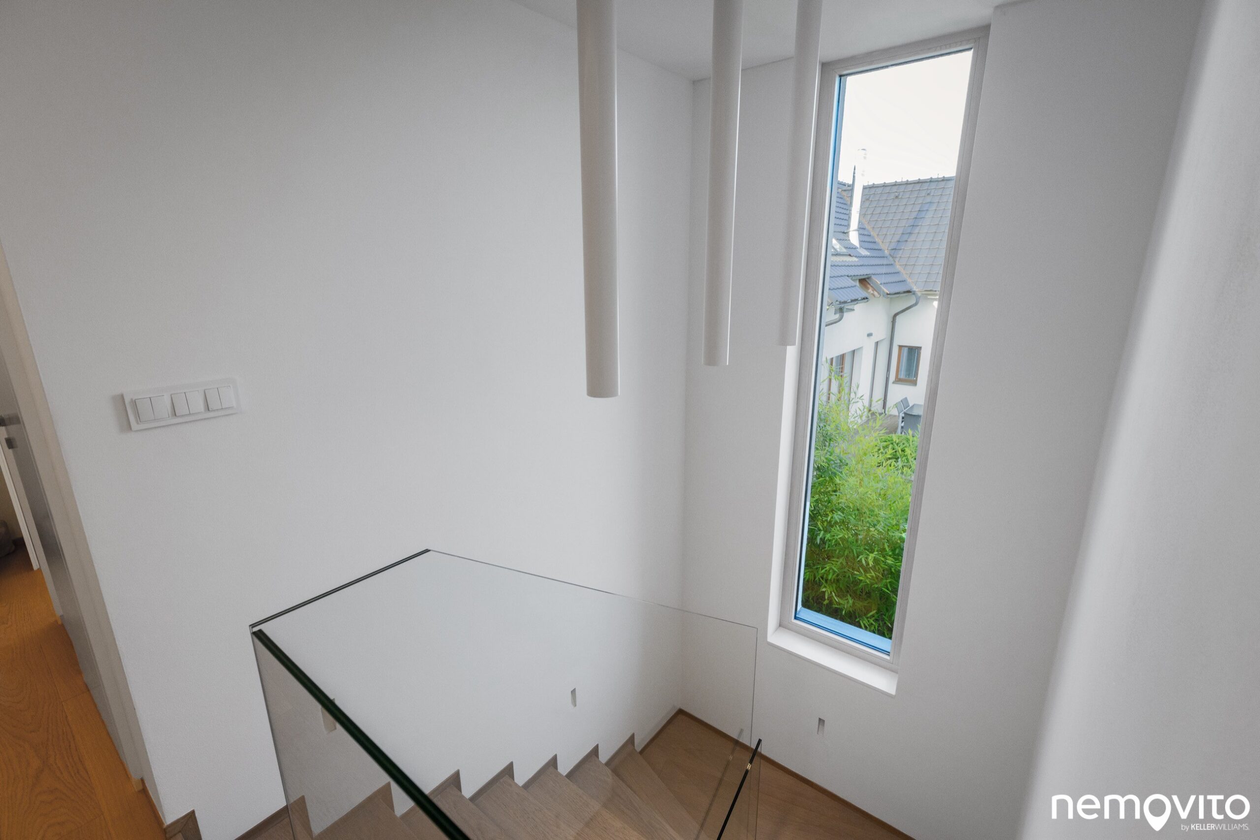 Podceňovat podobu schodiště, to skutečně není radno. Chodit po něm budete několikrát denně a tak je vhodné, aby ve špičkovém domě nejen dobře fungovalo, ale také skvěle vypadalo. Schodiště je tedy prostorné a po dřevěných schodech se skutečně příjemně chodí. Zábradlí ze skla neruší a netvoří zbytečnou optickou bariéru. Díky obrovskému oknu vás tu čeká také spousta světla.