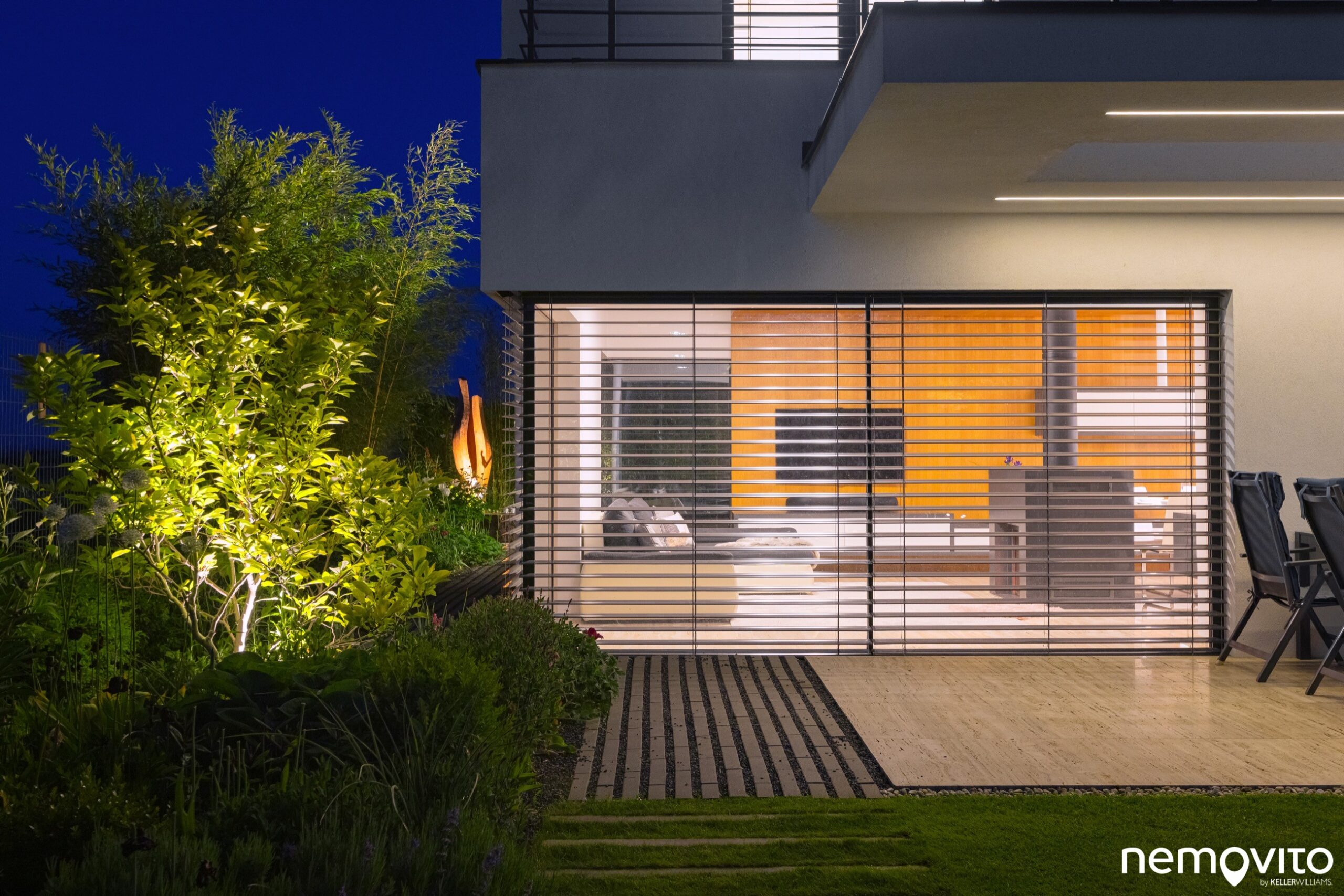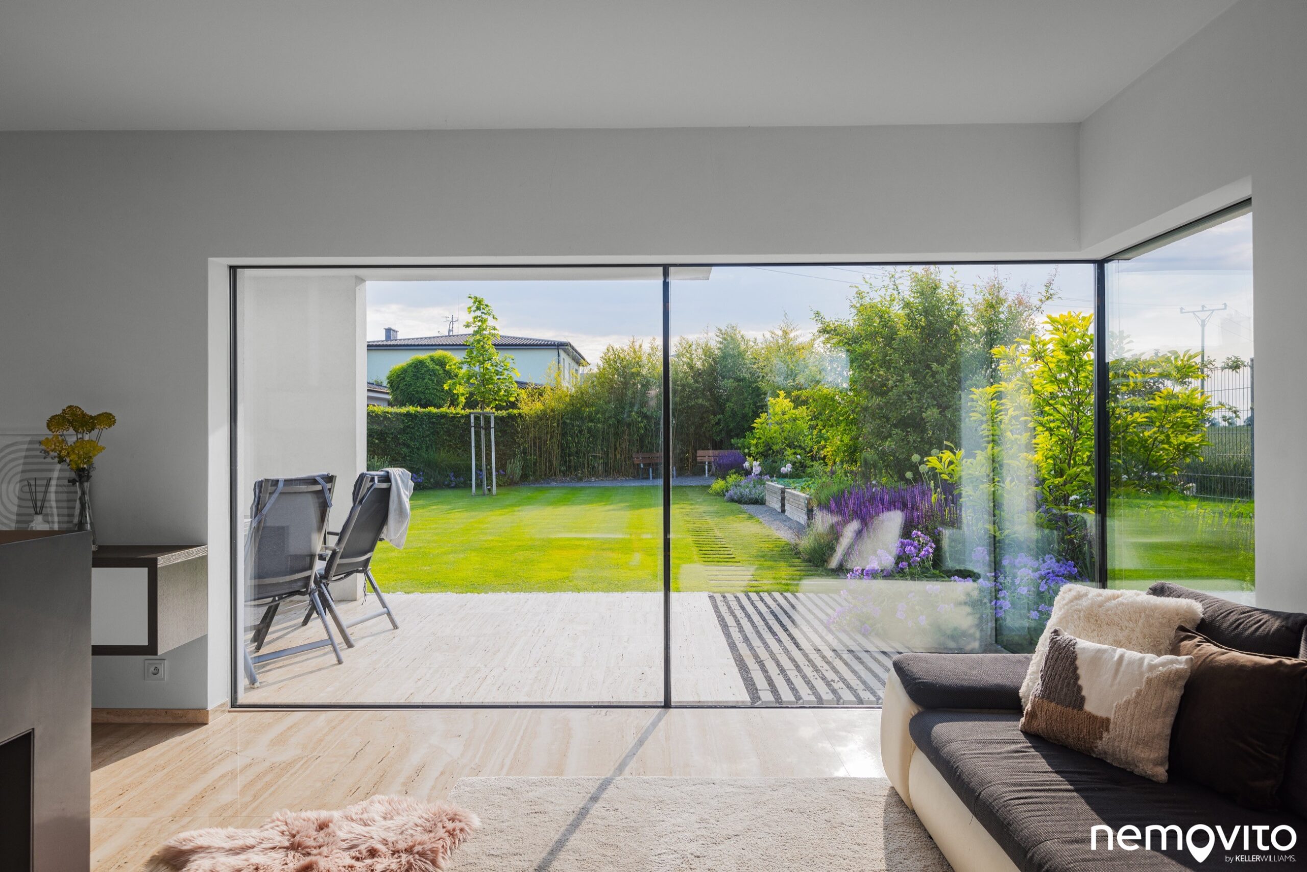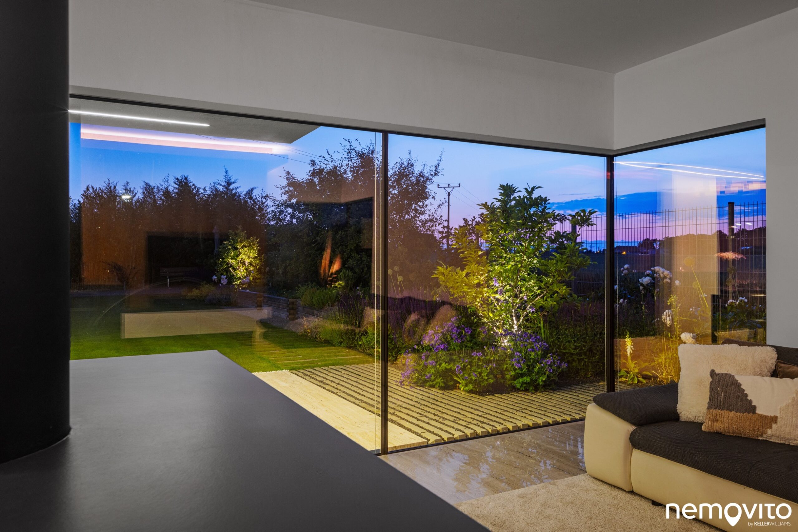 Zdánlivá maličkost, která ale prozradí mnohé. Dokonale pěstěný trávník vysílá jednoznačný signál o tom, že dům je nejen pečlivě navržen, ale také udržován. Pohled přes velké prosklené plochy je tak skutečným pohlazením po duši. Okna jsou dřevohliníková a v obývacím pokoj bezrámová. Výsledný efekt, kdy se okno prakticky ztrácí, nejen skvěle vypadá, ale také nefalšovaně spojuje interiér s exteriérem.