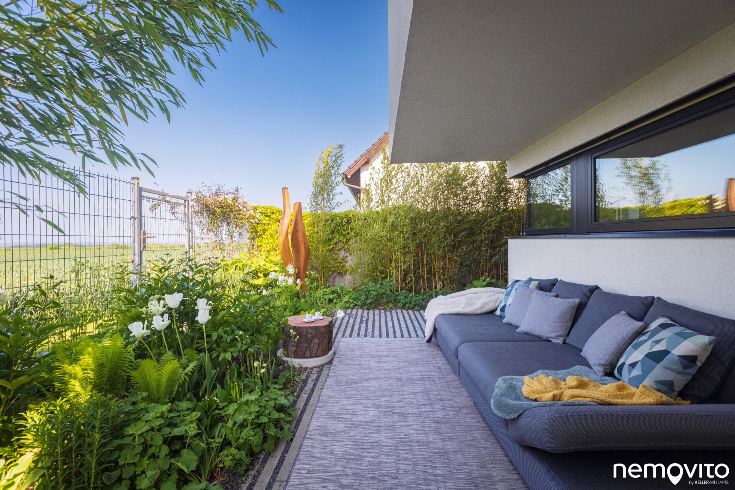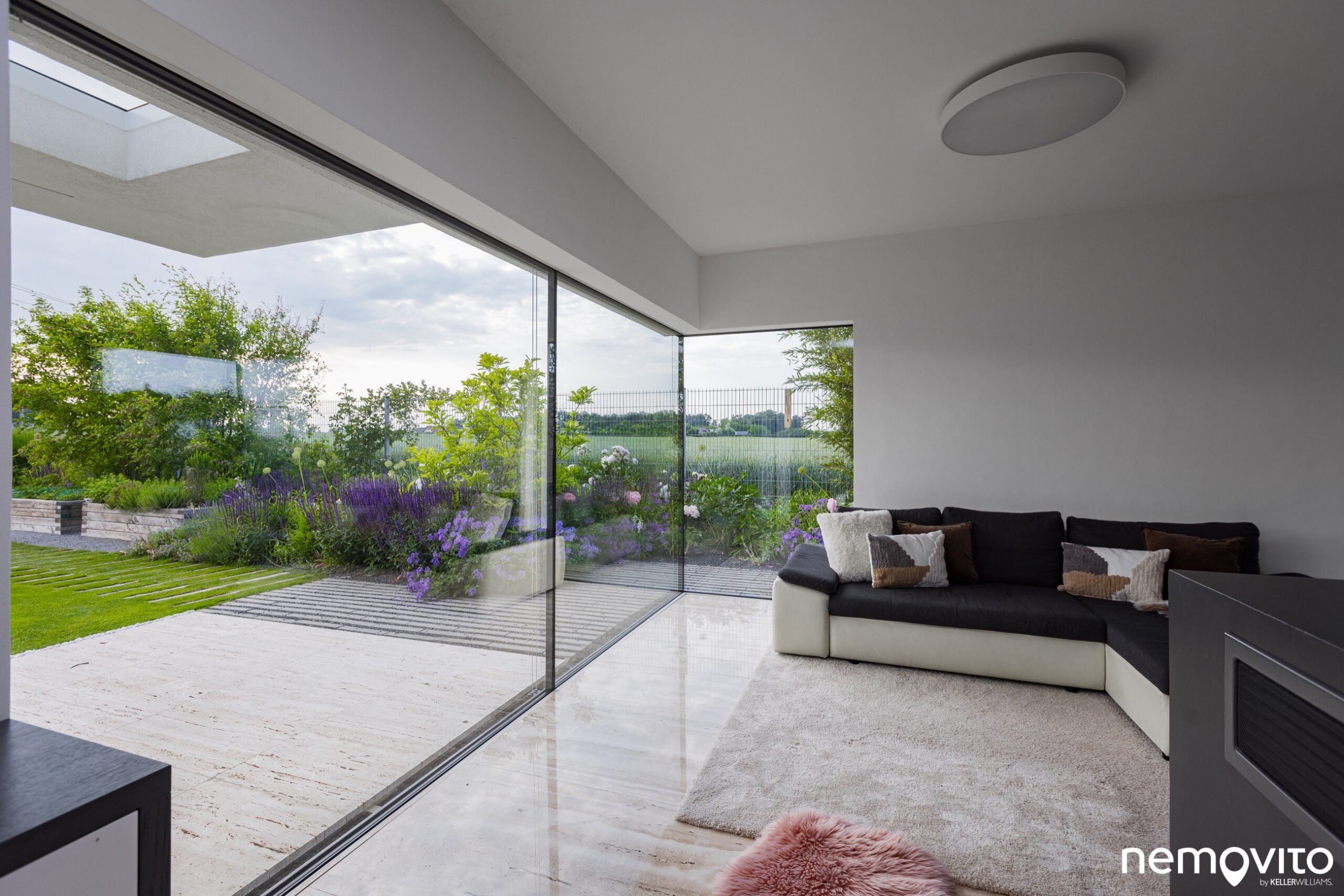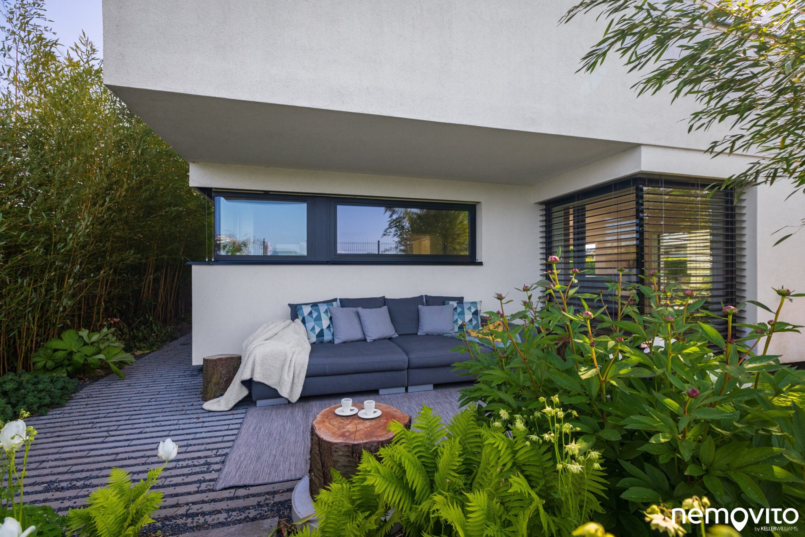 Zdánlivá maličkost, která ale prozradí mnohé. Dokonale pěstěný trávník vysílá jednoznačný signál o tom, že dům je nejen pečlivě navržen, ale také udržován. Pohled přes velké prosklené plochy je tak skutečným pohlazením po duši. Okna jsou dřevohliníková a v obývacím pokoj bezrámová. Výsledný efekt, kdy se okno prakticky ztrácí, nejen skvěle vypadá, ale také nefalšovaně spojuje interiér s exteriérem.