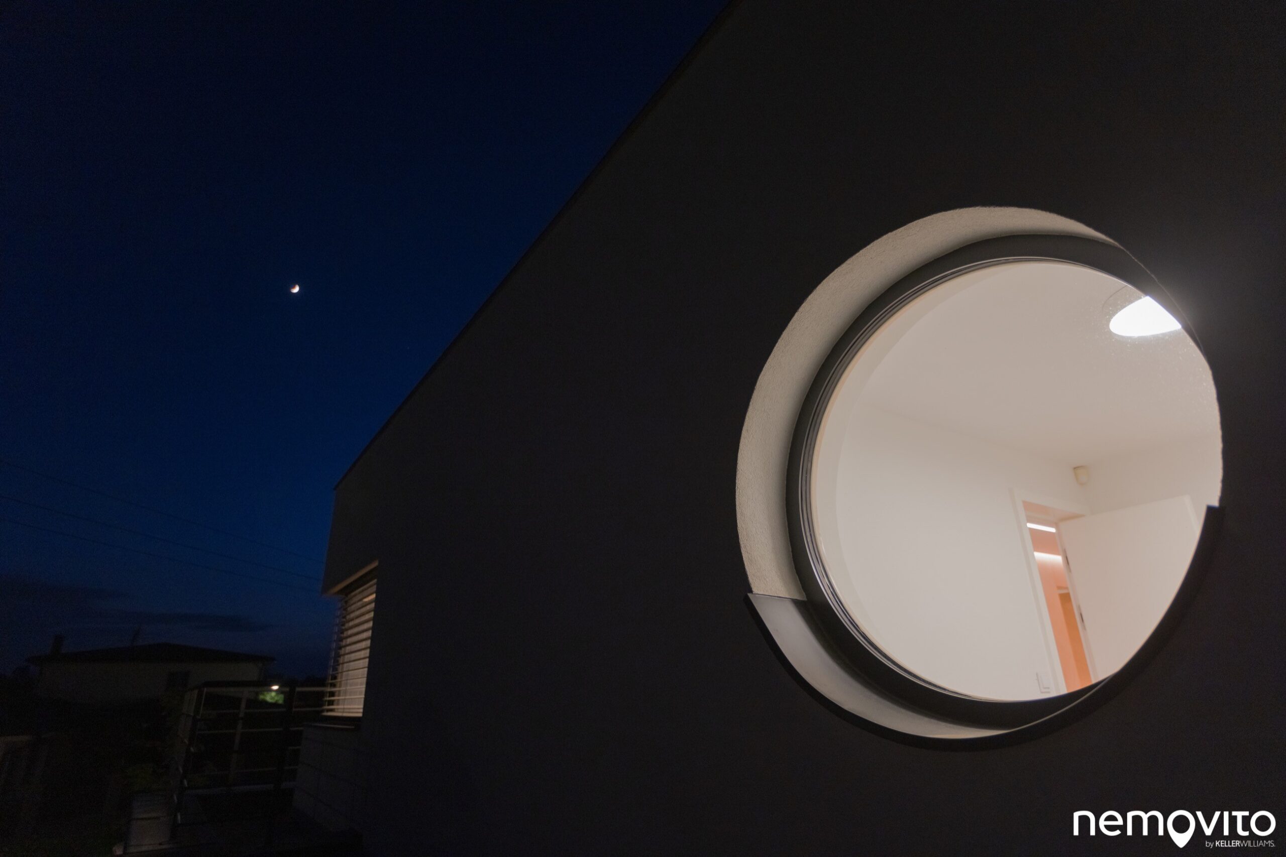 Příjemný dojem vzdušného světlého prostoru vytváří velké rohové okno s orientací na jih a na západ. Pracovní kout jedna báseň. Kolem celého horního podlaží je ochoz, který společně s kulatým oknem nenápadně odkazuje mezi vlny moře. Stavba má totiž z určitých úhlů skutečně evokovat zaoceánský parník.