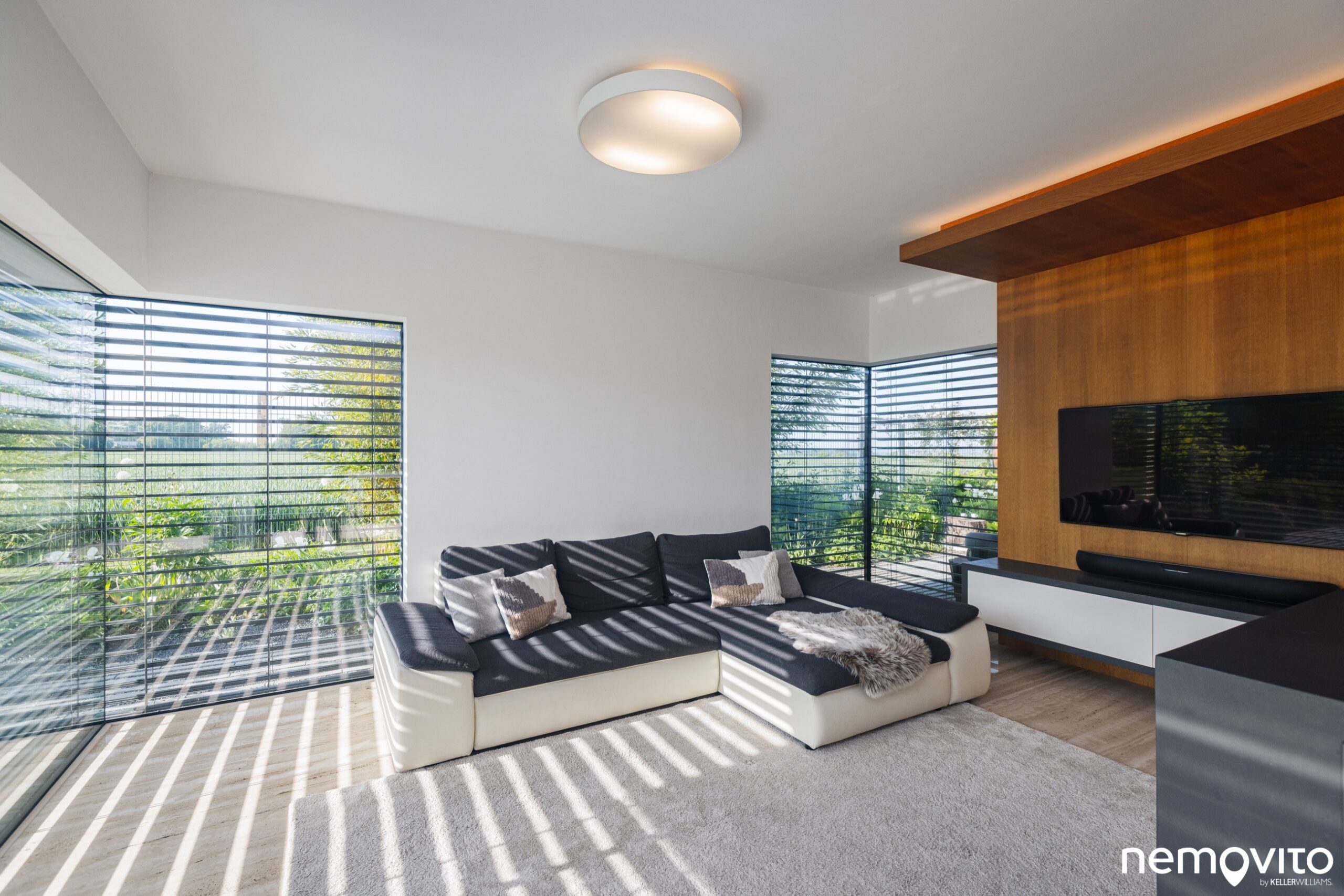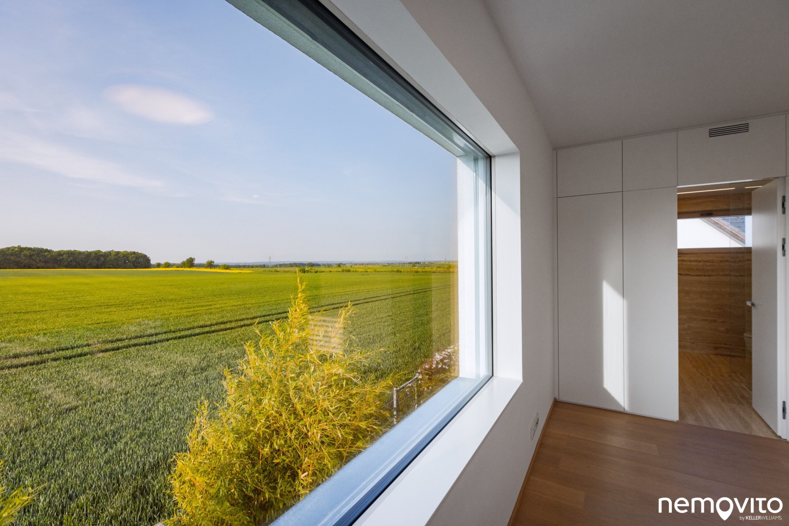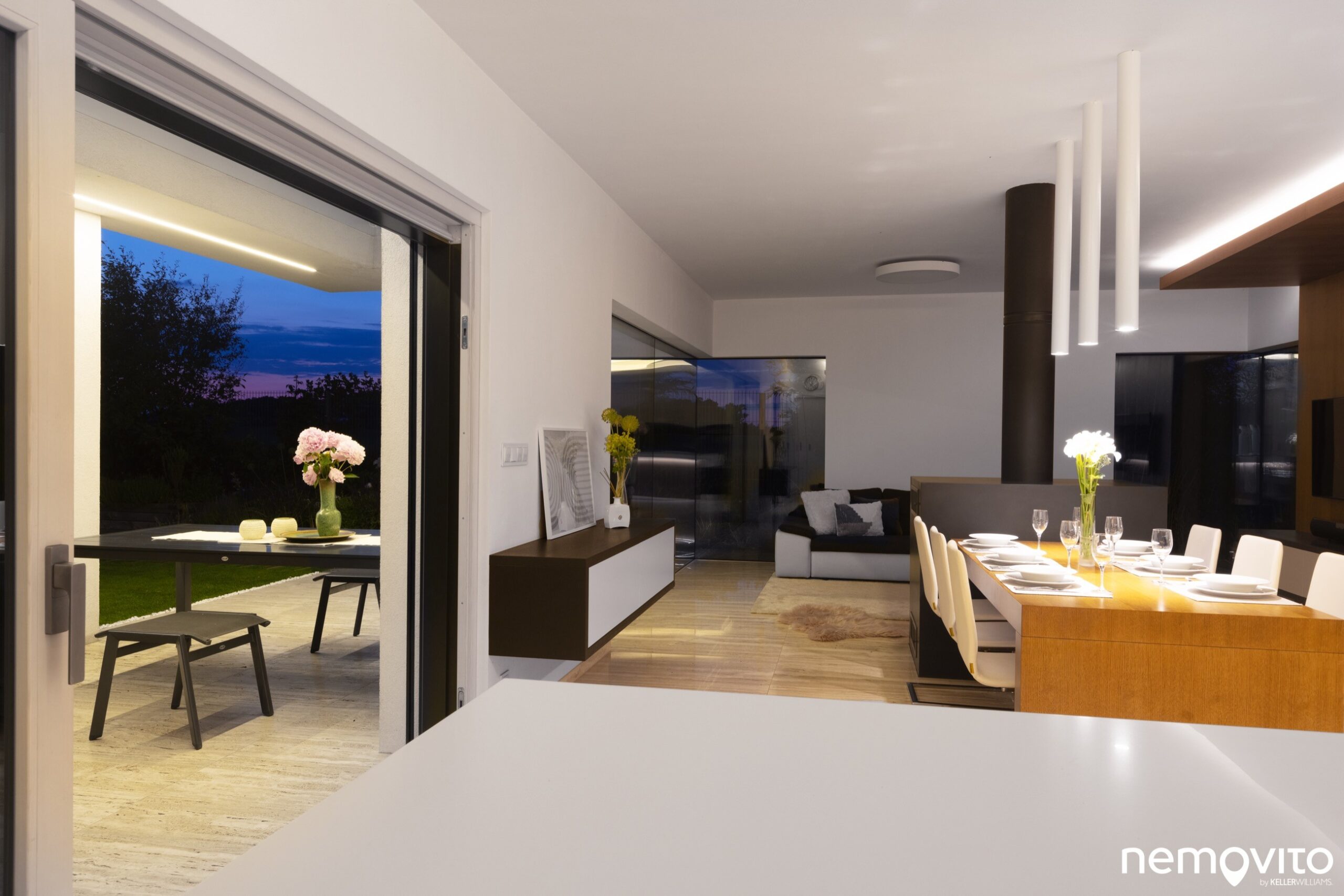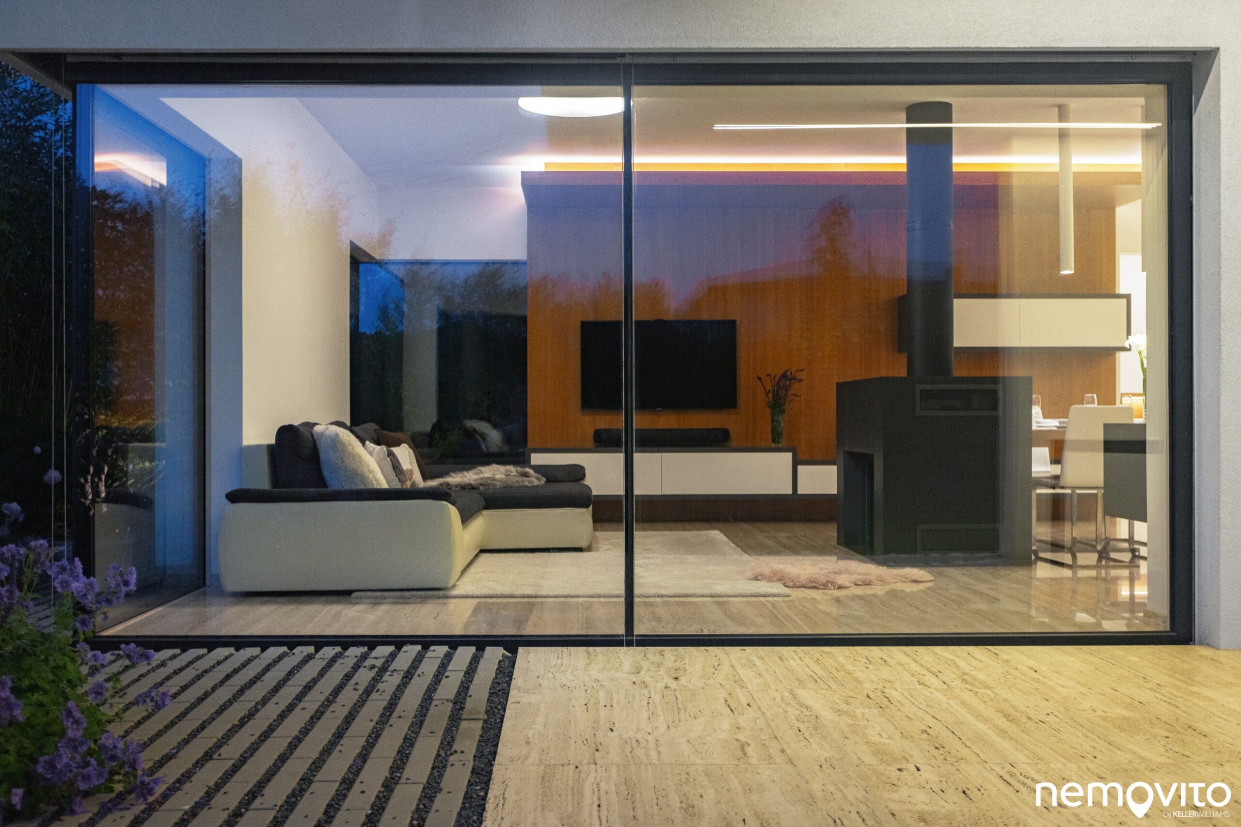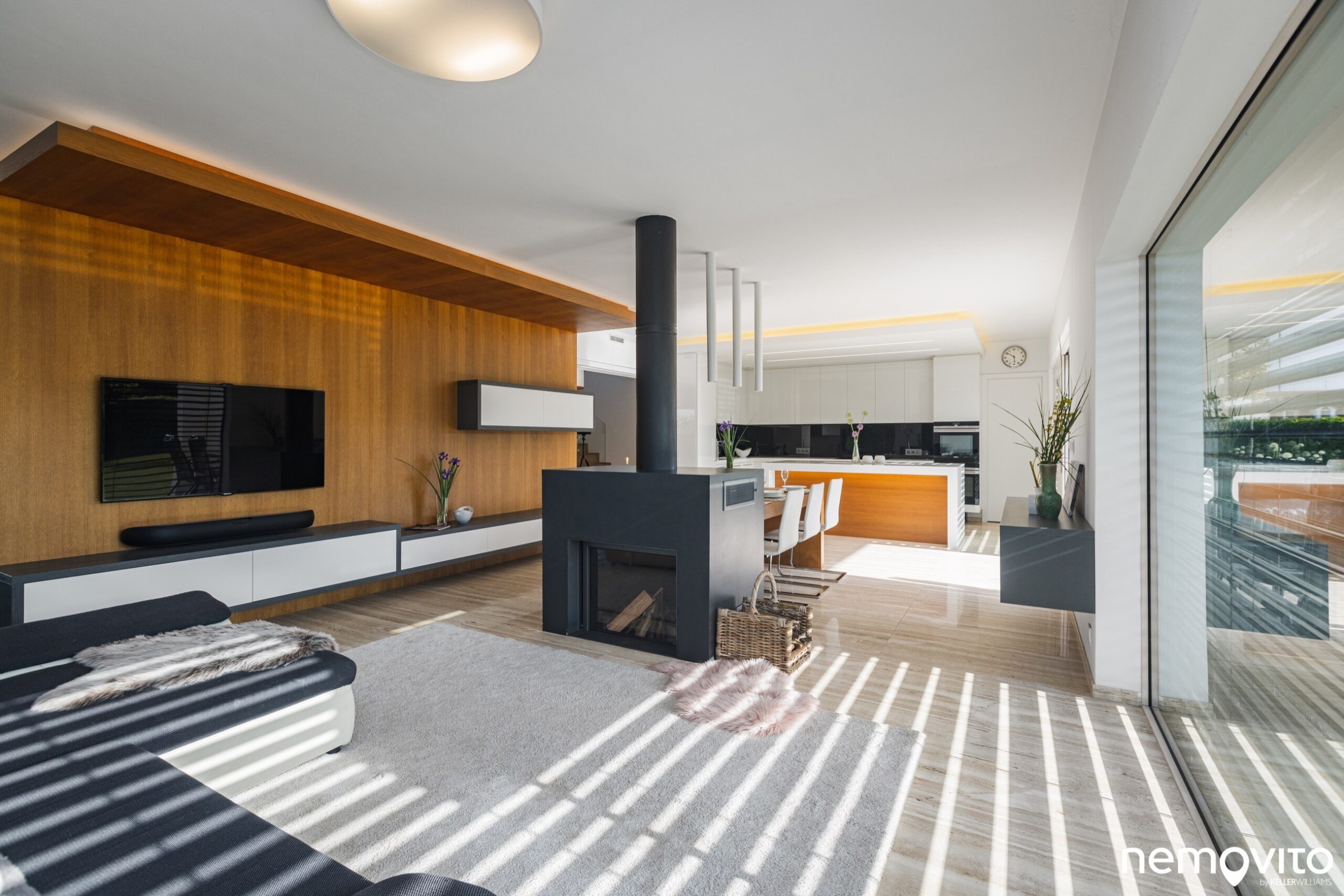 Hlavní obytný prostor domu nabízí impozantních 53 m2 a obrovské prosklené plochy. Všechna okna jsou pochopitelně vybavena exteriérovými elektrickými žaluziemi, které při slunných dnech rozehrají na podlaze hru se světlem. Interiér a výhledy neruší žádné radiátory, podlahové topení je samozřejmost.