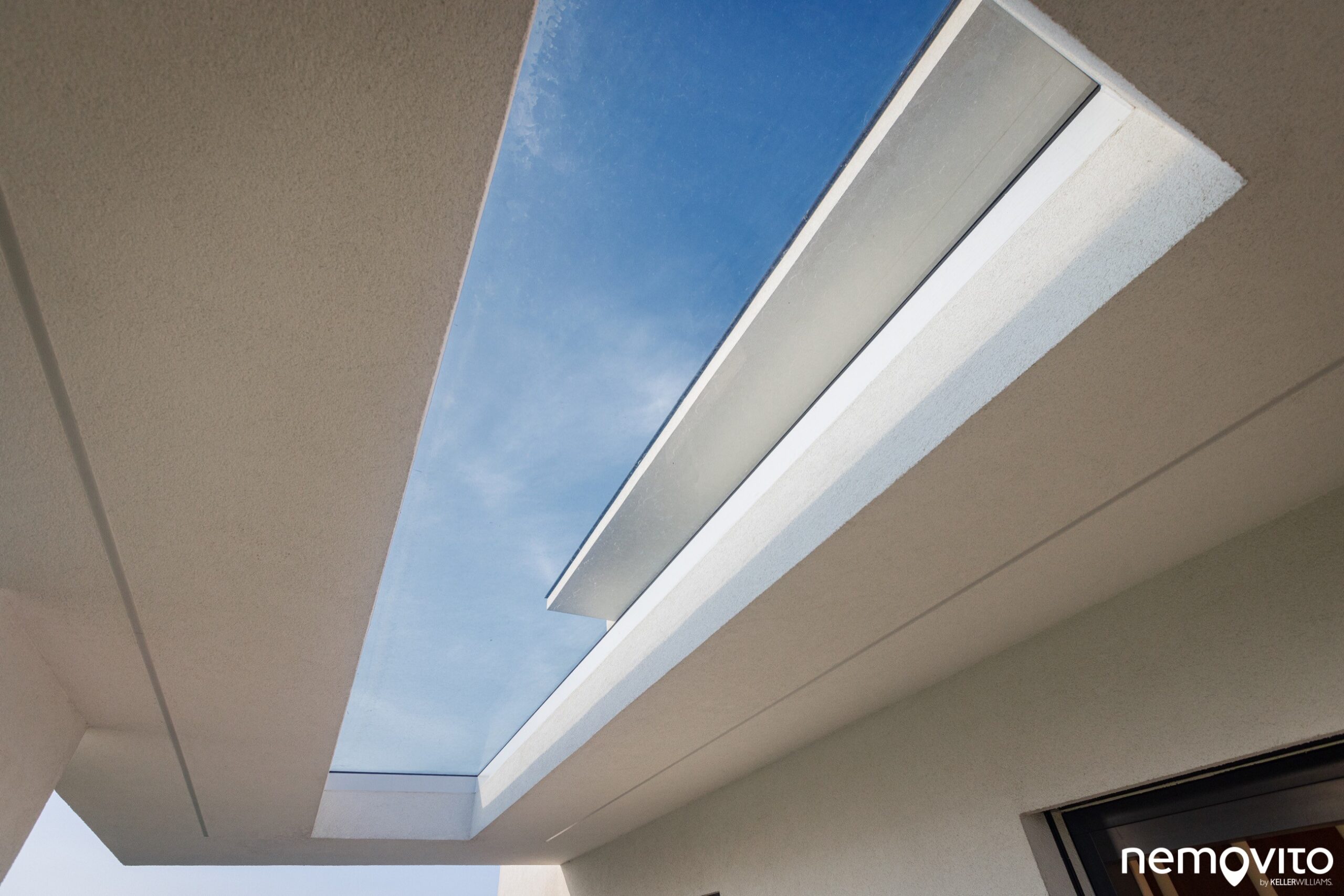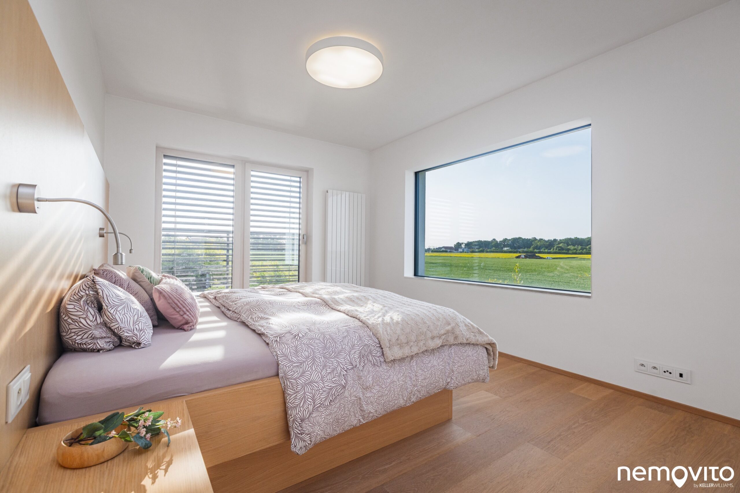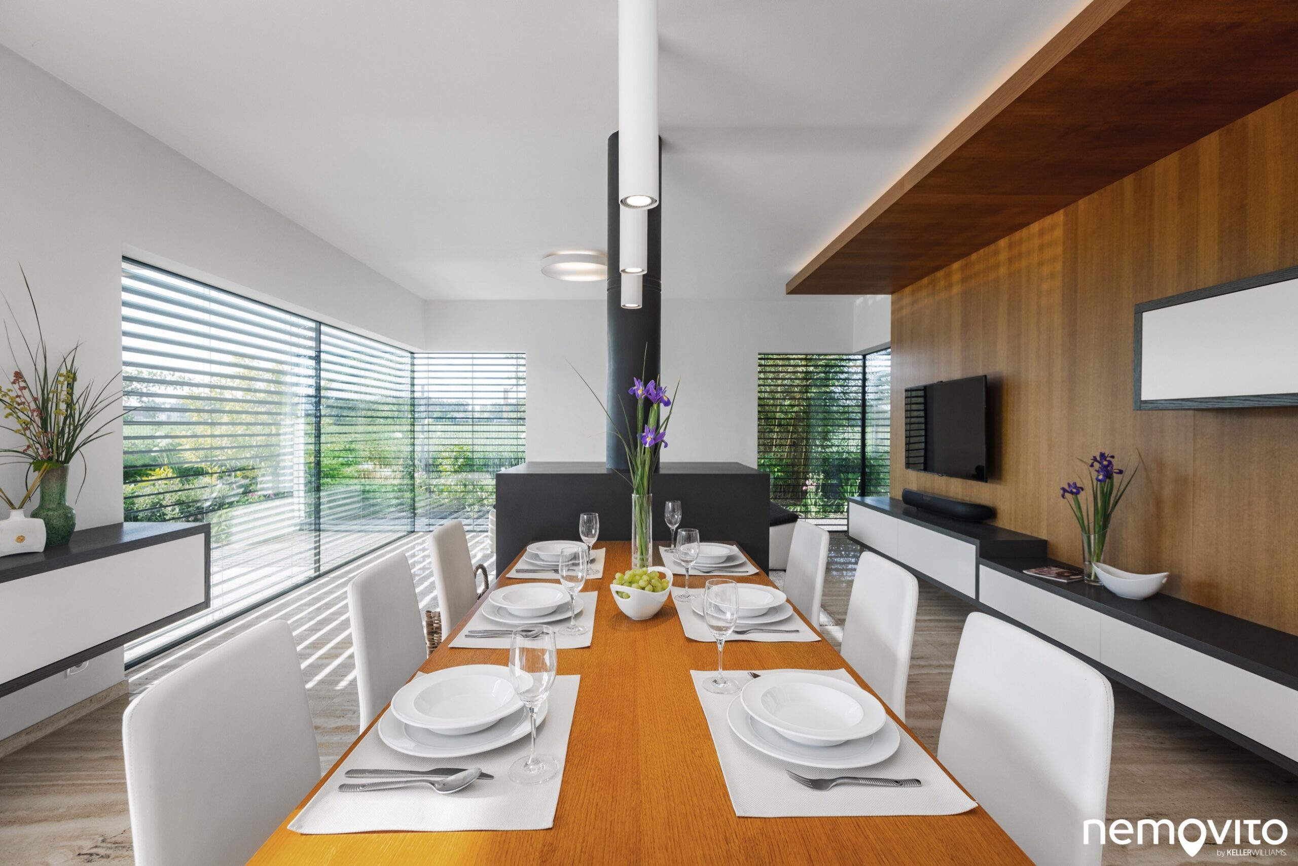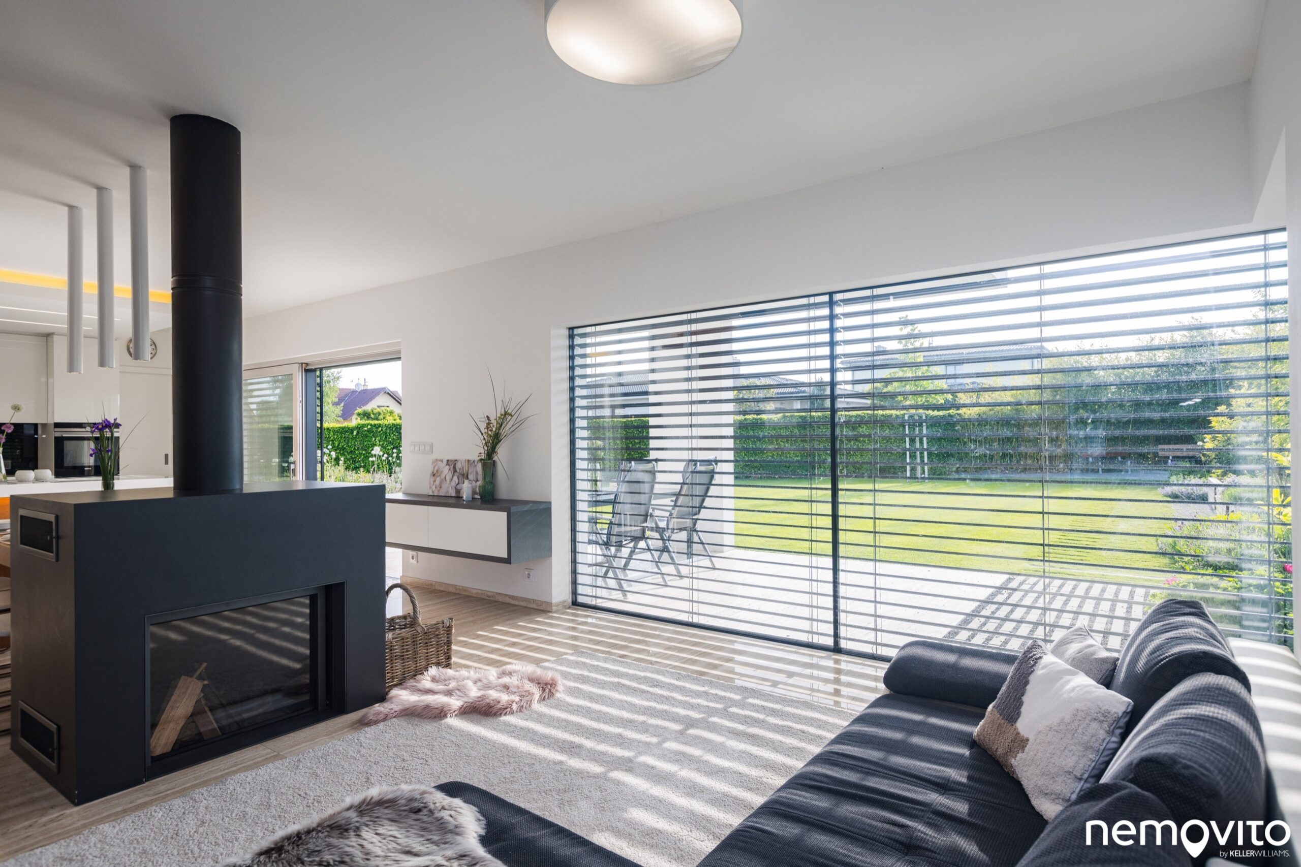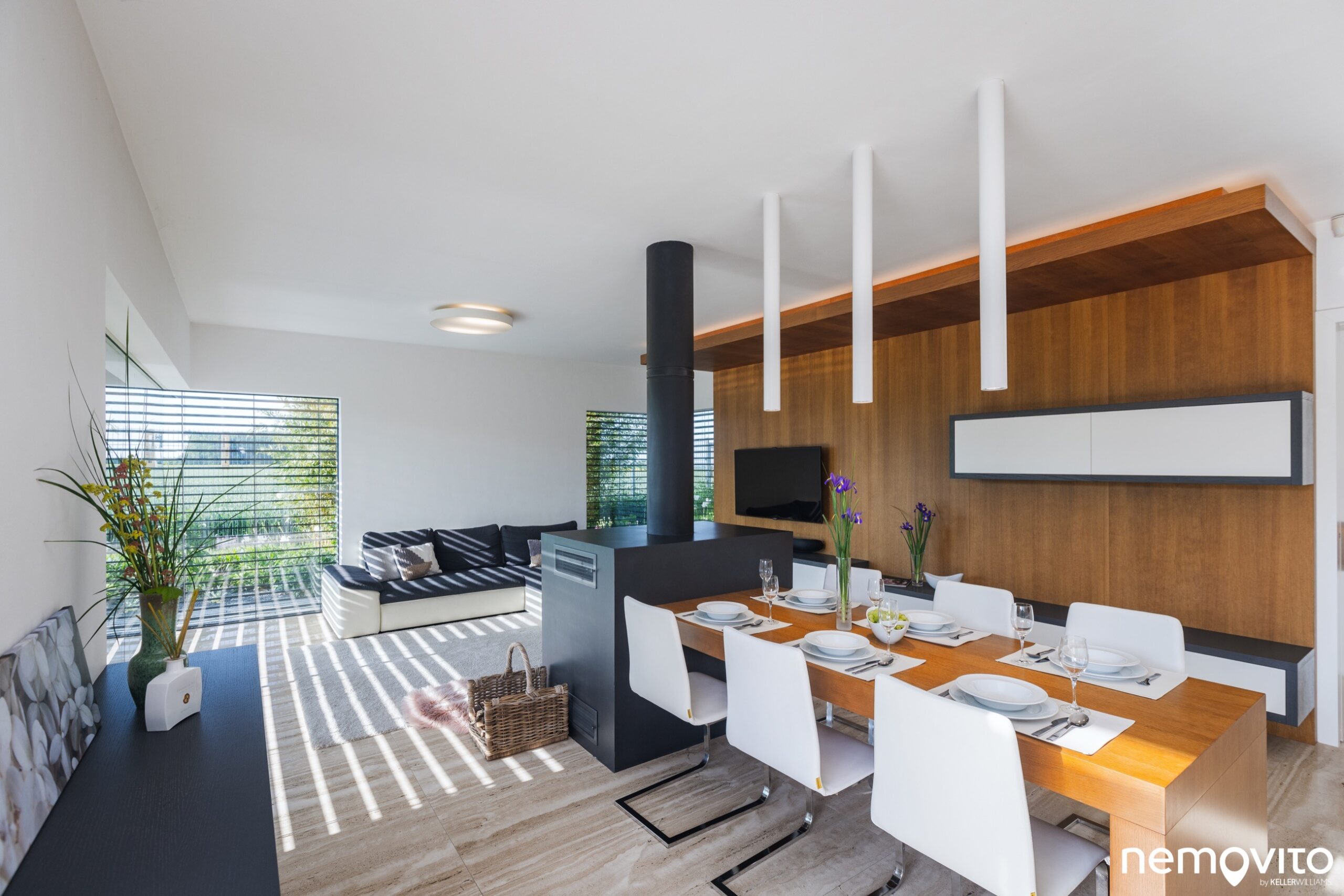 Hlavní obytný prostor domu nabízí impozantních 53 m2 a obrovské prosklené plochy. Všechna okna jsou pochopitelně vybavena exteriérovými elektrickými žaluziemi, které při slunných dnech rozehrají na podlaze hru se světlem. Interiér a výhledy neruší žádné radiátory, podlahové topení je samozřejmost.