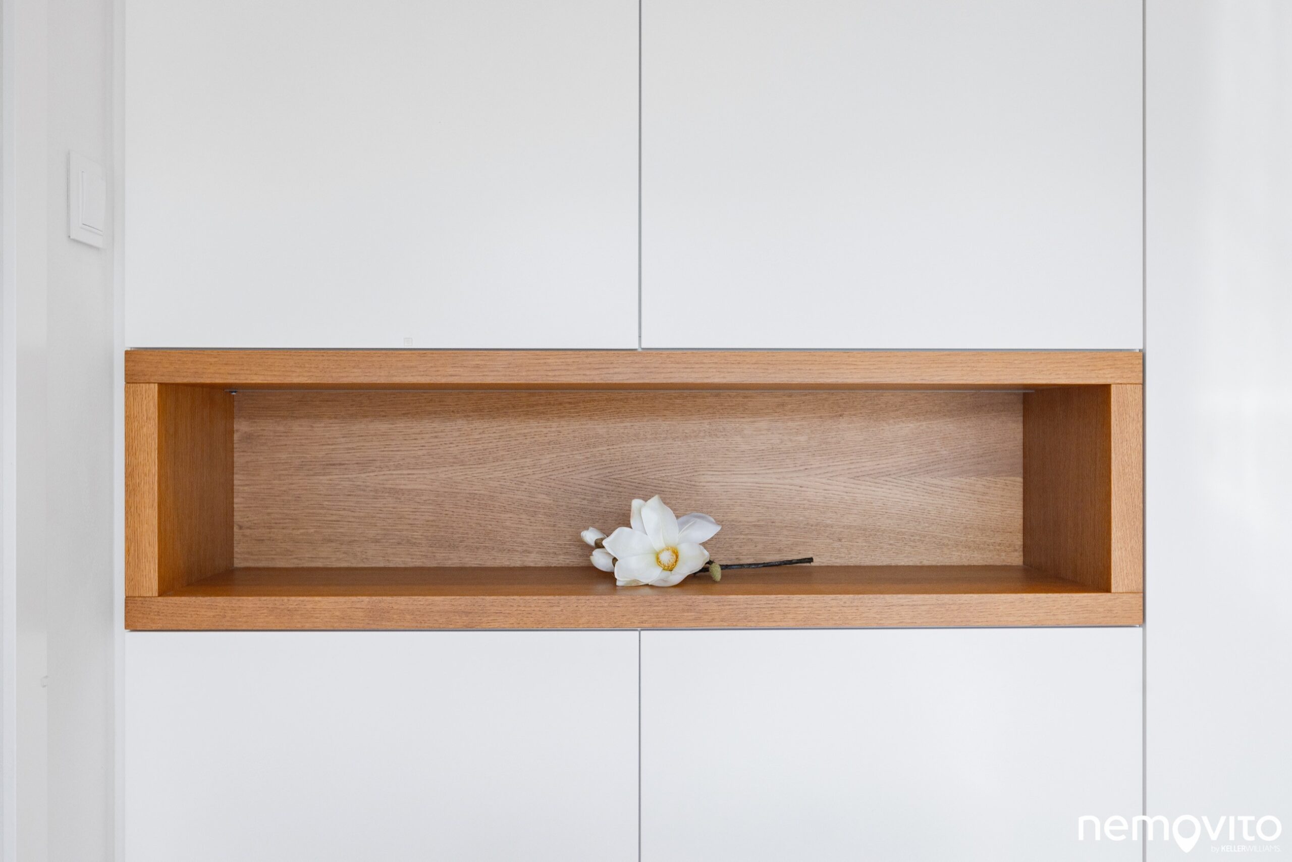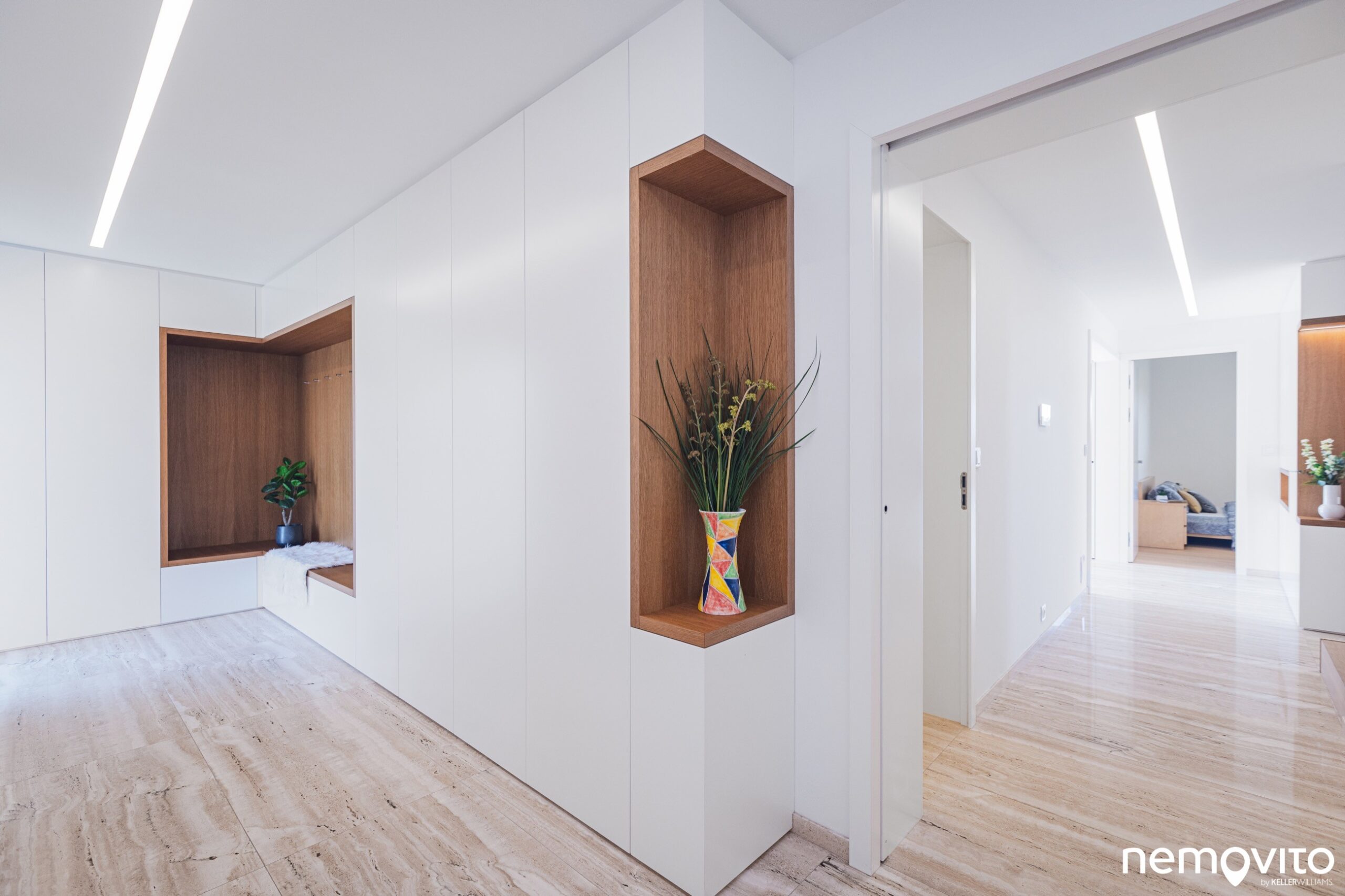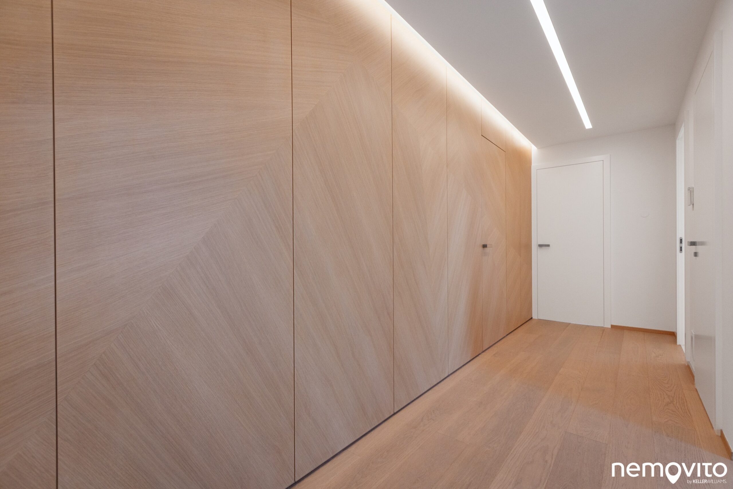 Ten se nachází po obvodu celé stěny vstupního zádveří, které lze oddělit posuvnými dveřmi. Jednotný design nábytku je dokonale čistý a opticky velmi lehký. Víte o něm, ale nijak vás nerozptyluje. I nutné zlo, jako jsou úložné prostory, může být krásné a rafinované.