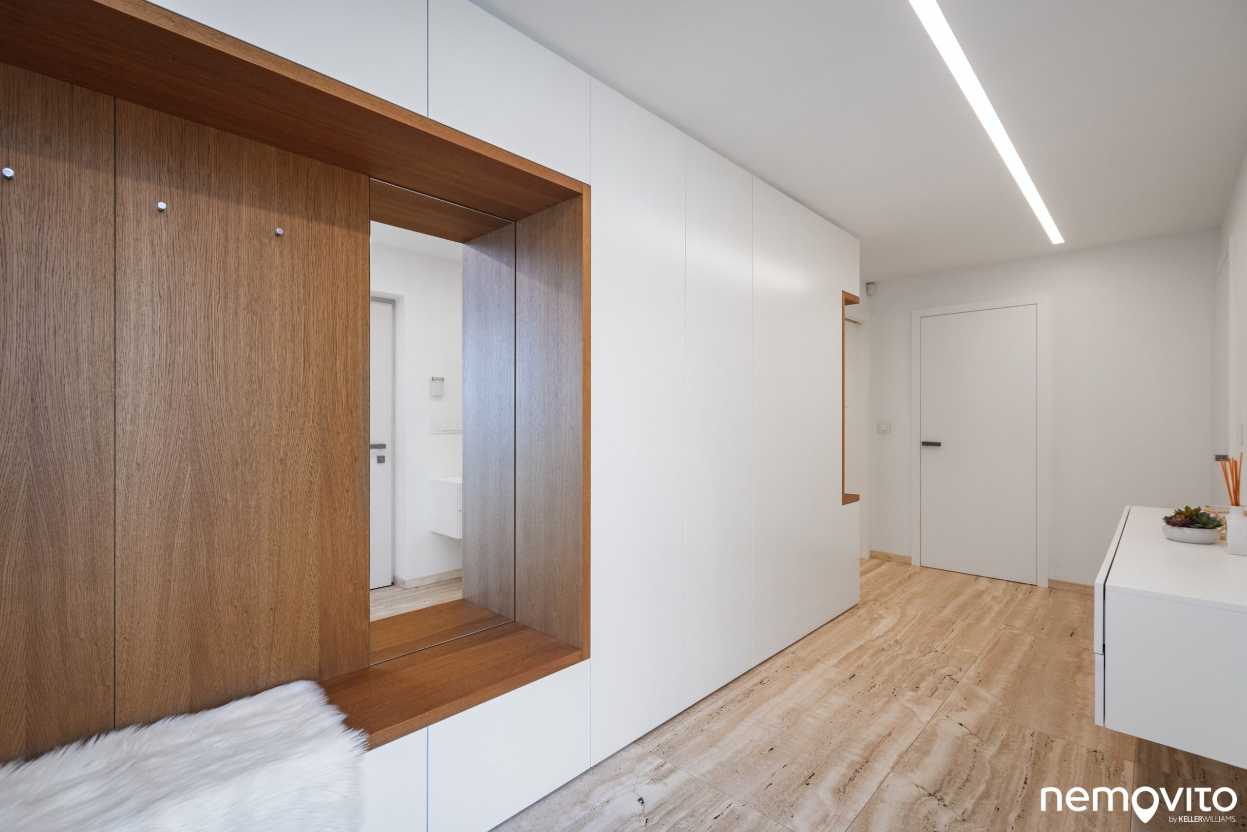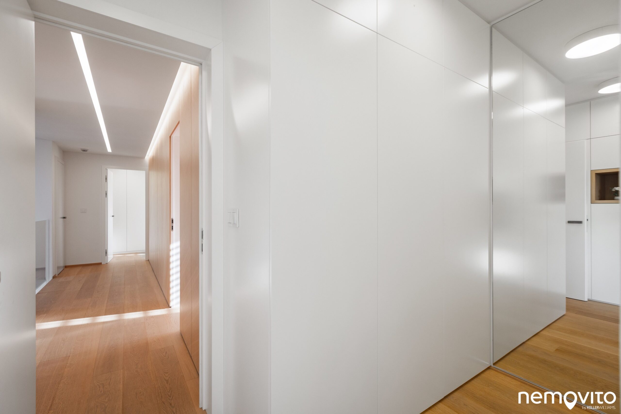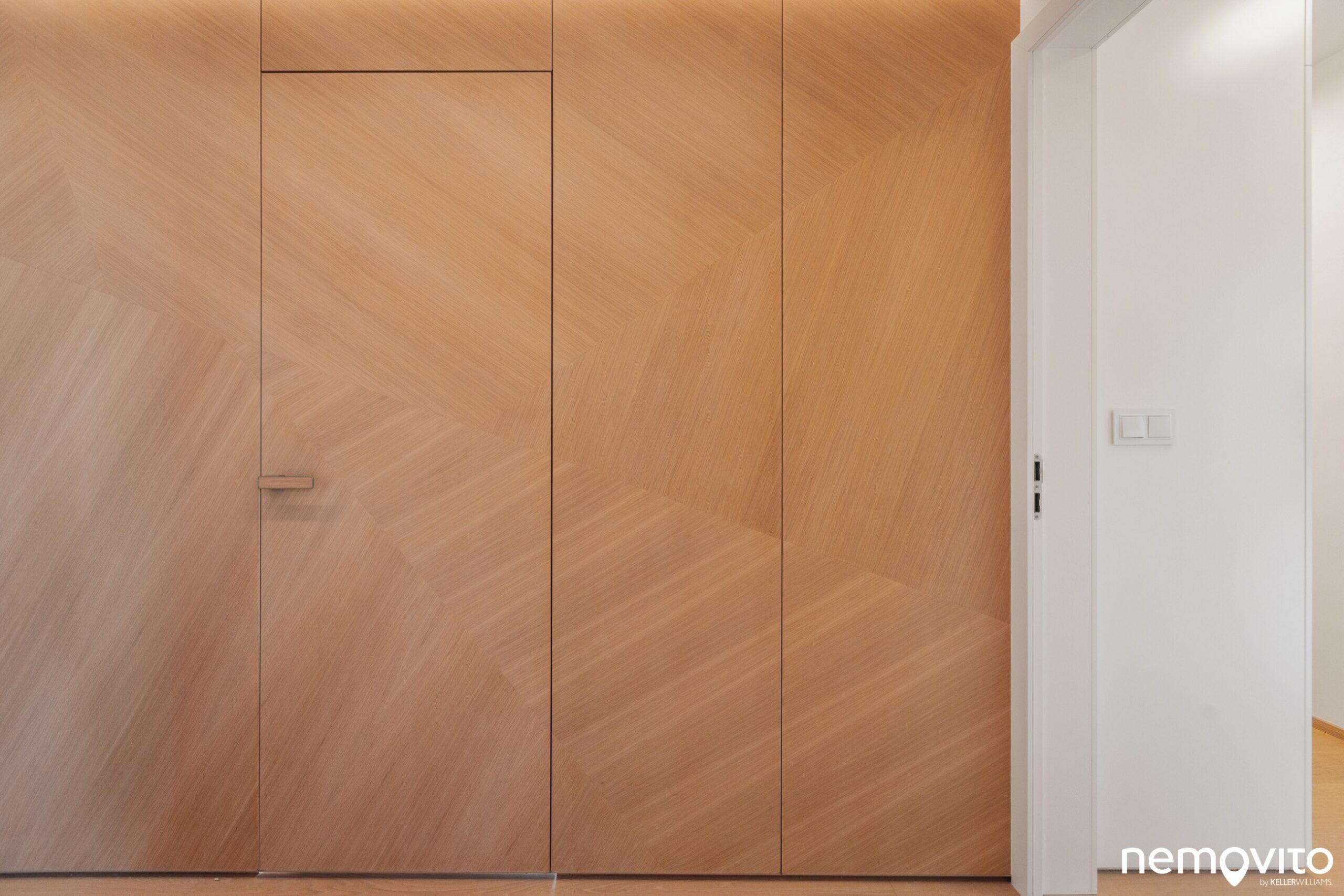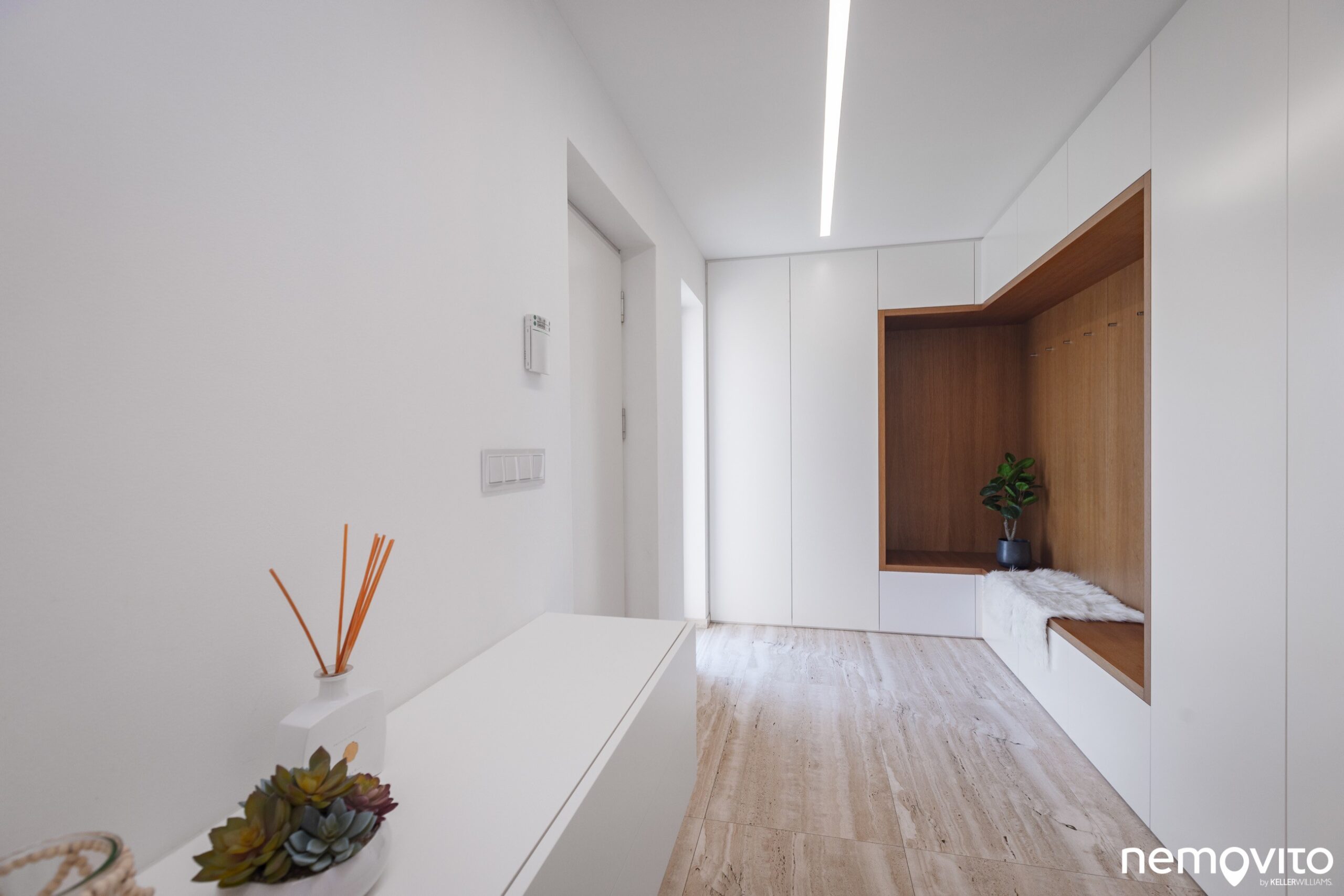 Ten se nachází po obvodu celé stěny vstupního zádveří, které lze oddělit posuvnými dveřmi. Jednotný design nábytku je dokonale čistý a opticky velmi lehký. Víte o něm, ale nijak vás nerozptyluje. I nutné zlo, jako jsou úložné prostory, může být krásné a rafinované.