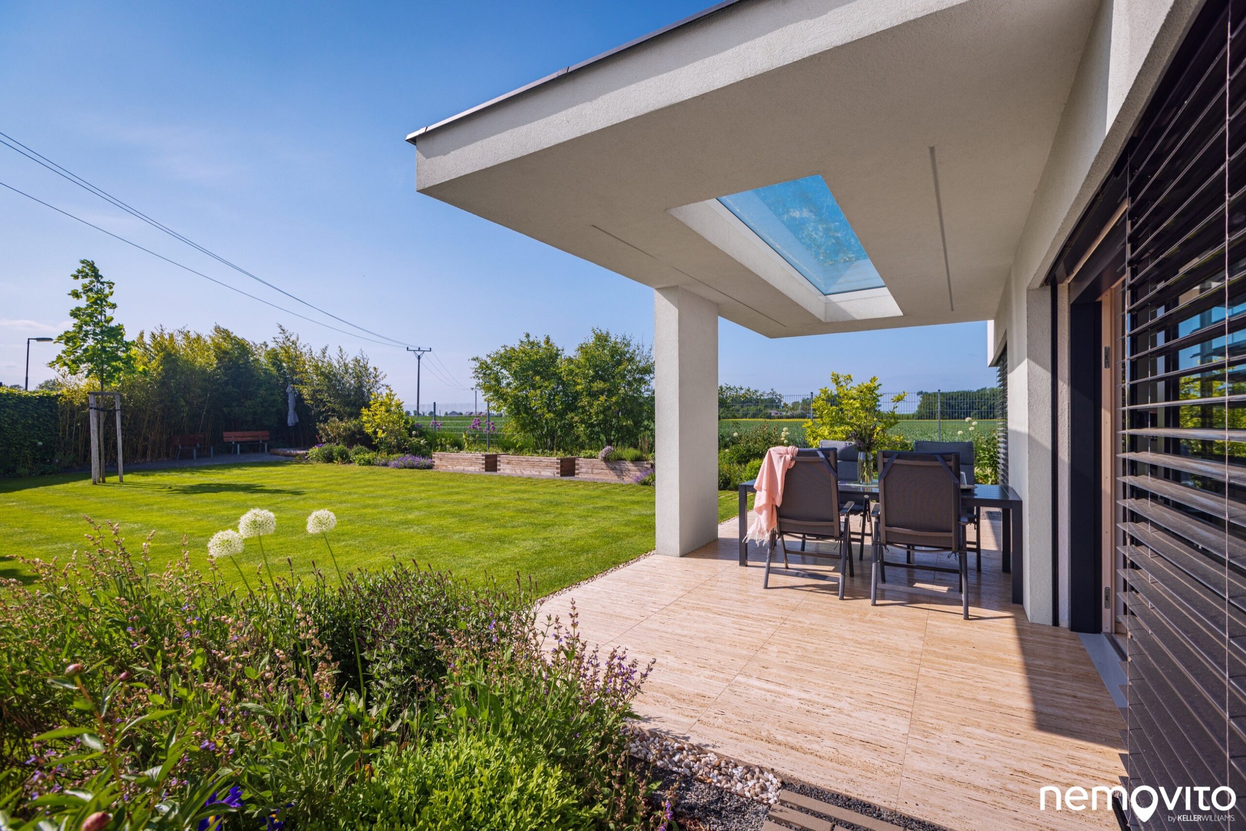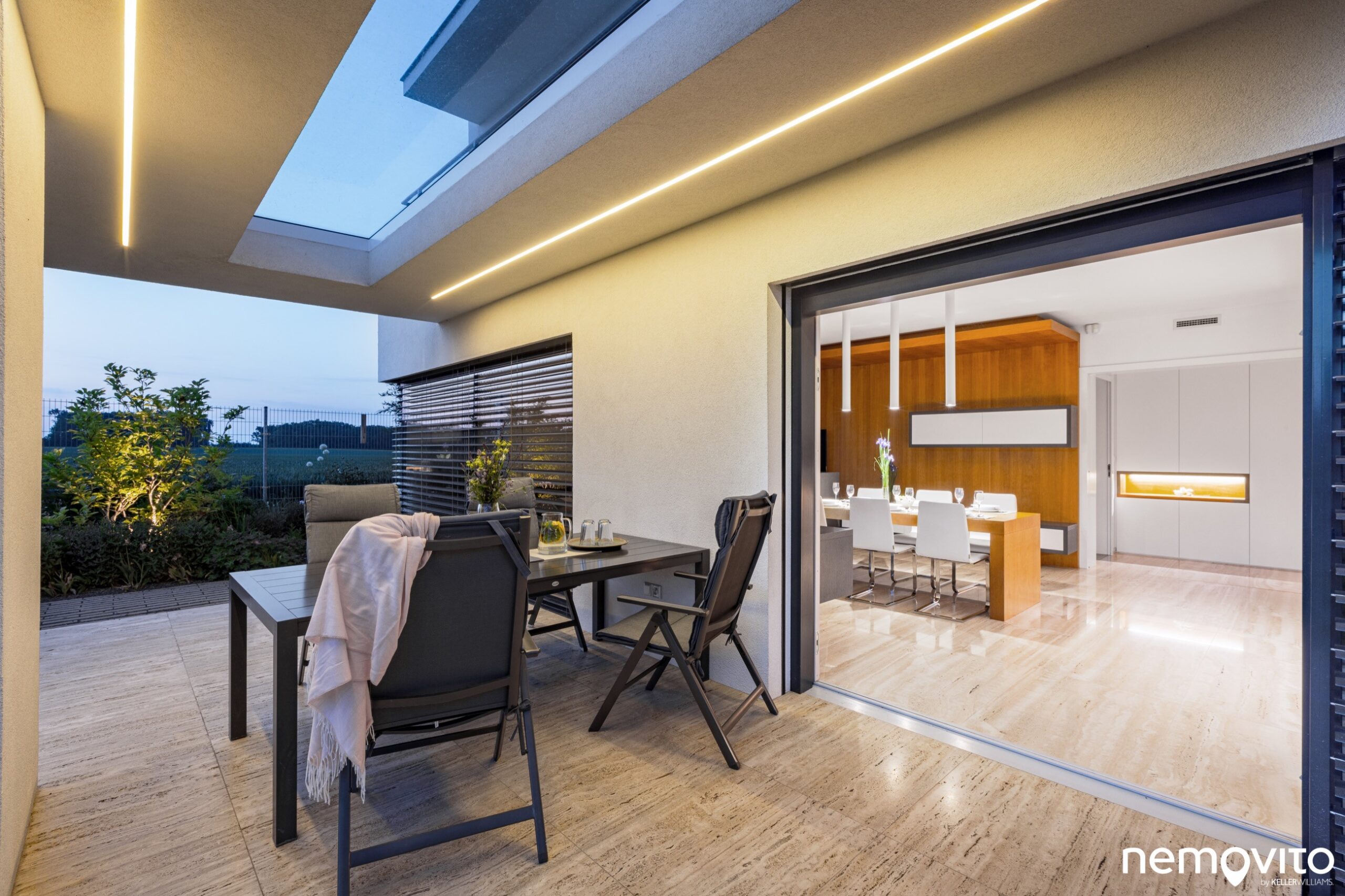 Pokud se řadíte mezi fanoušky zajímavých domů, oči byste na něm nechali. I zdánlivá maličkost, jako je zakrytá terasa, v sobě ukrývá rafinované překvapení v podobě designového čtyřmetrového zasklení otvoru v předsunuté moniéře. Nejenže skvěle vypadá, ale také zajišťuje dostatečný přísun denního světla.