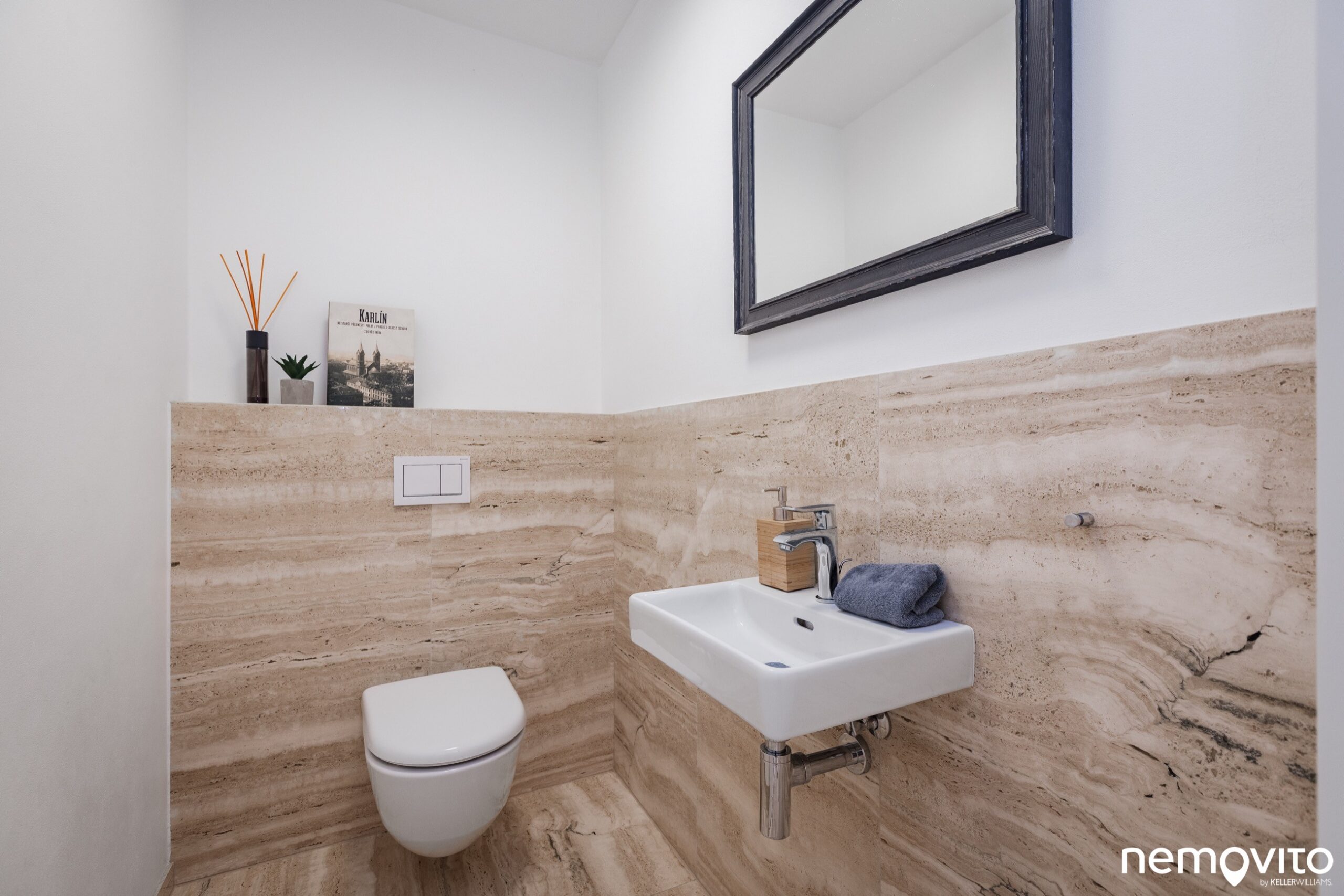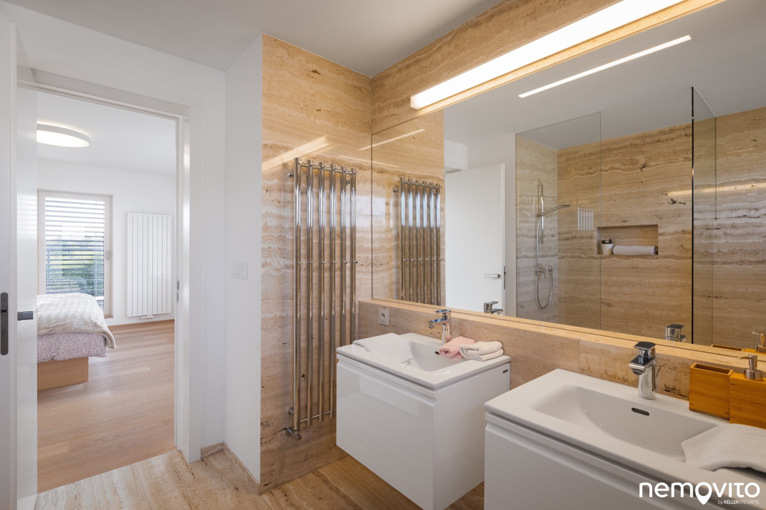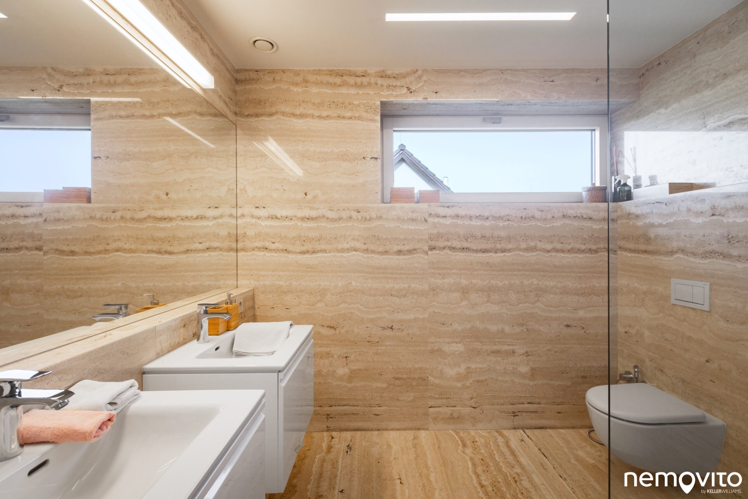 Velkoformátová dlažba z travertinu se nevyhnula ani této koupelně, která tak působí honosným, přesto však střídmým dojmem. A teď hurá na druhé "tajné" dveře.