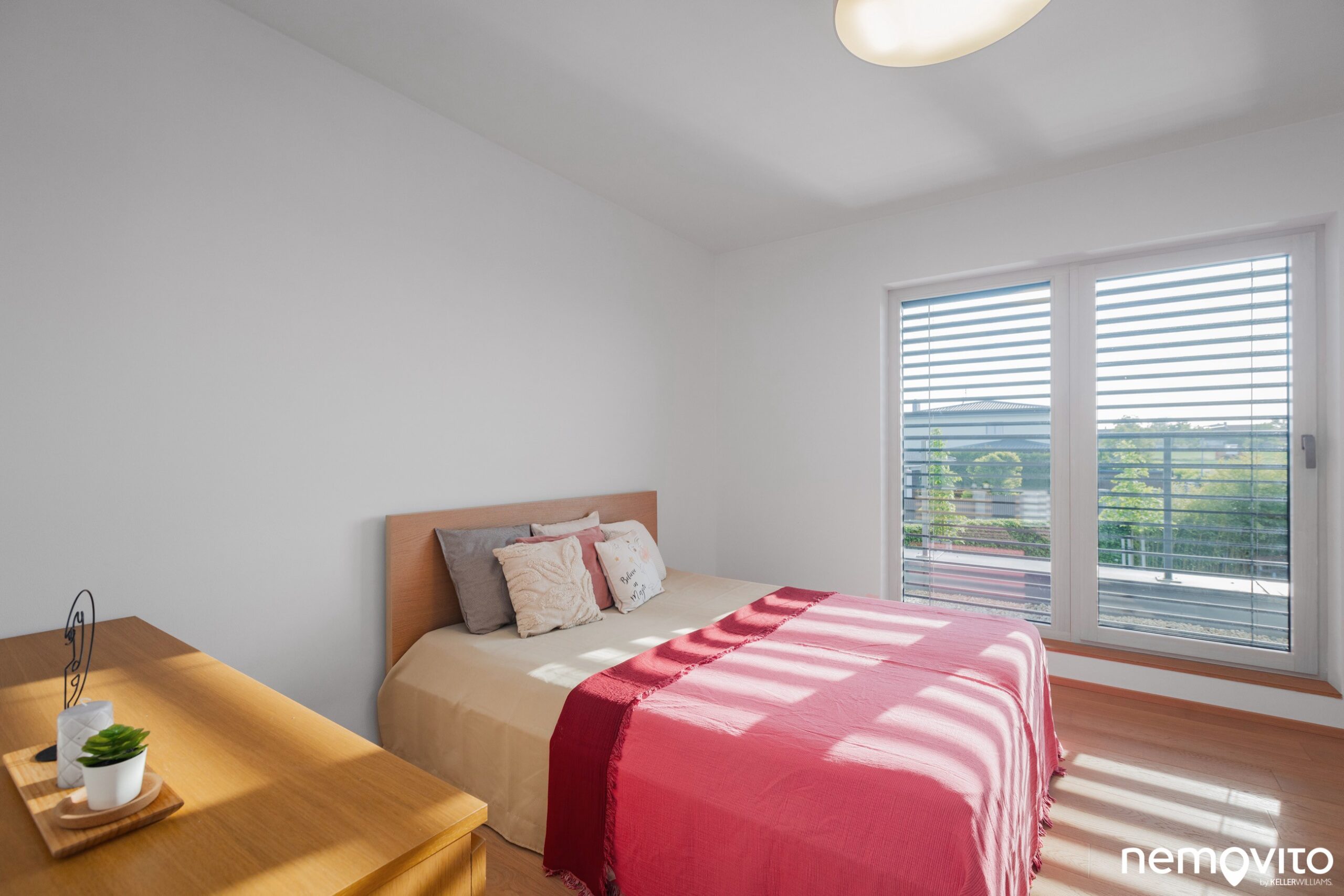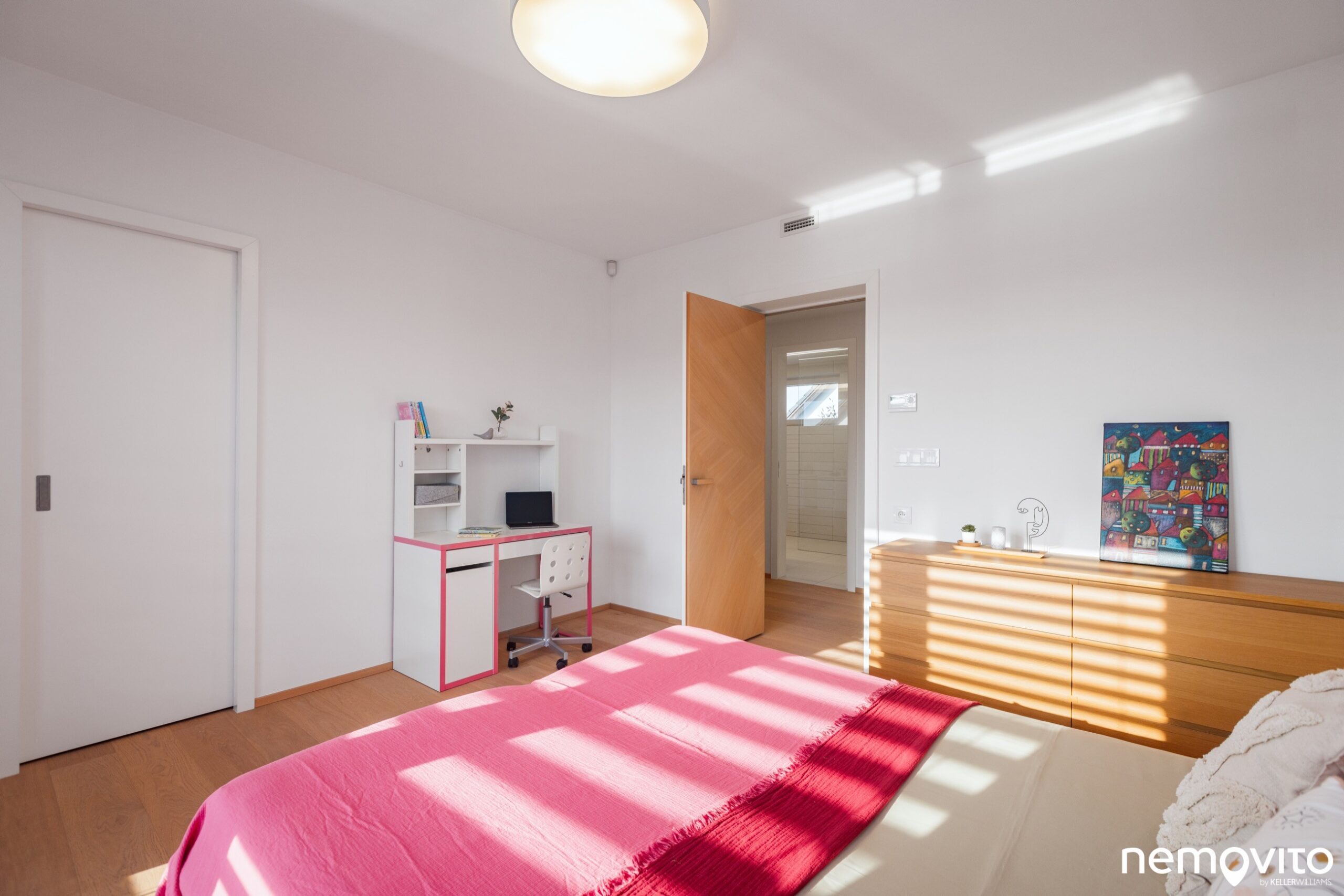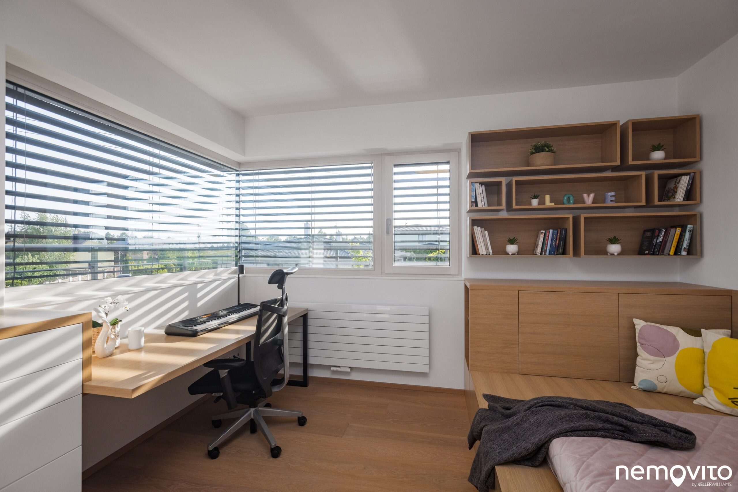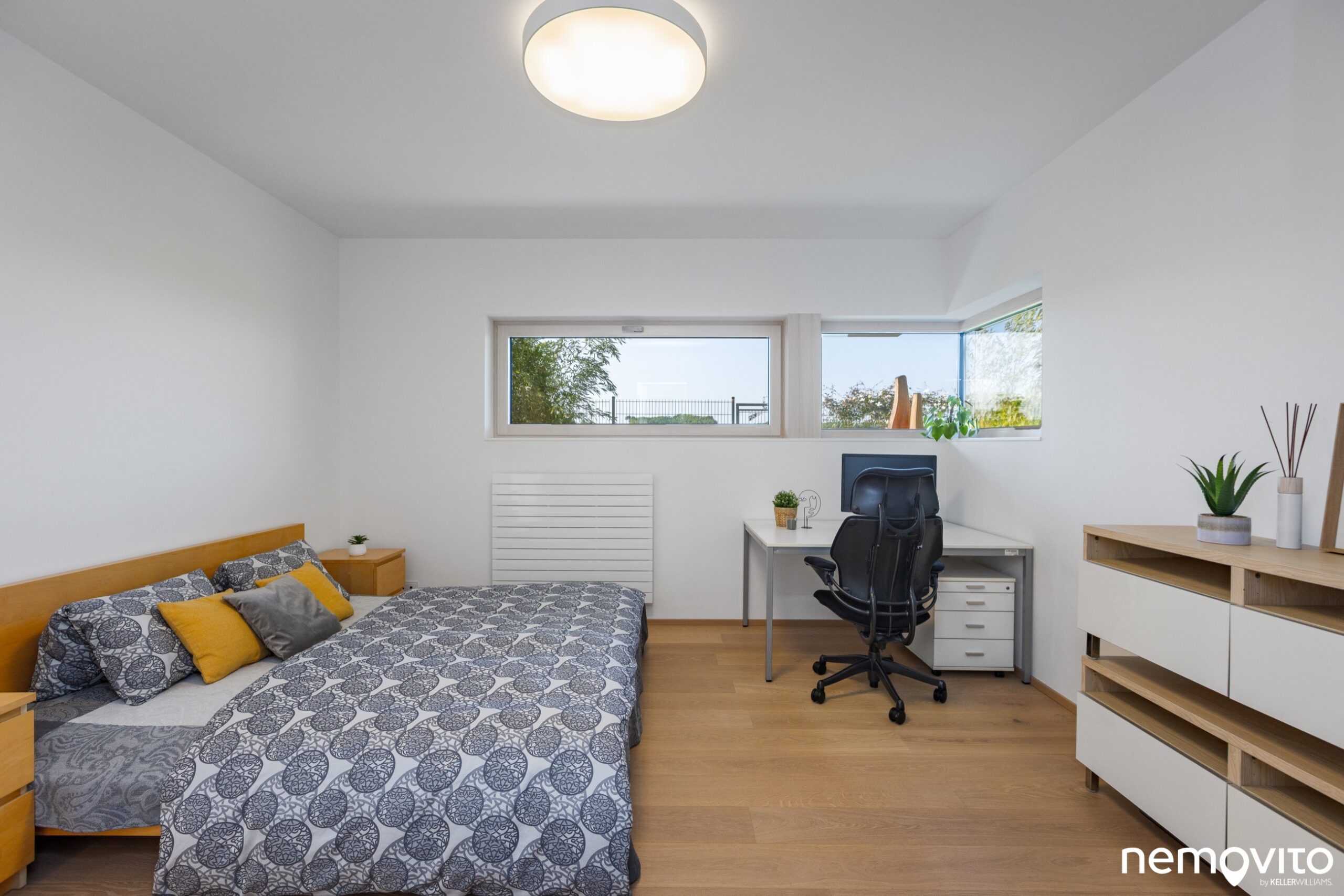 Druhý pokoj má rovněž k dispozici šatnu, celková velikost je 18 m2. Velkým oknem je realizován výstup na venkovní ochoz se západní orientací. Pokoj je dostatečně velký na to, aby v sobě pojmul velkou postel i pracovní kout. S nábytkem to díky šatně přehánět nemusíte. To je ostatně společným jmenovatelem všech horních ložnic - ke každé je k dispozici šatna.