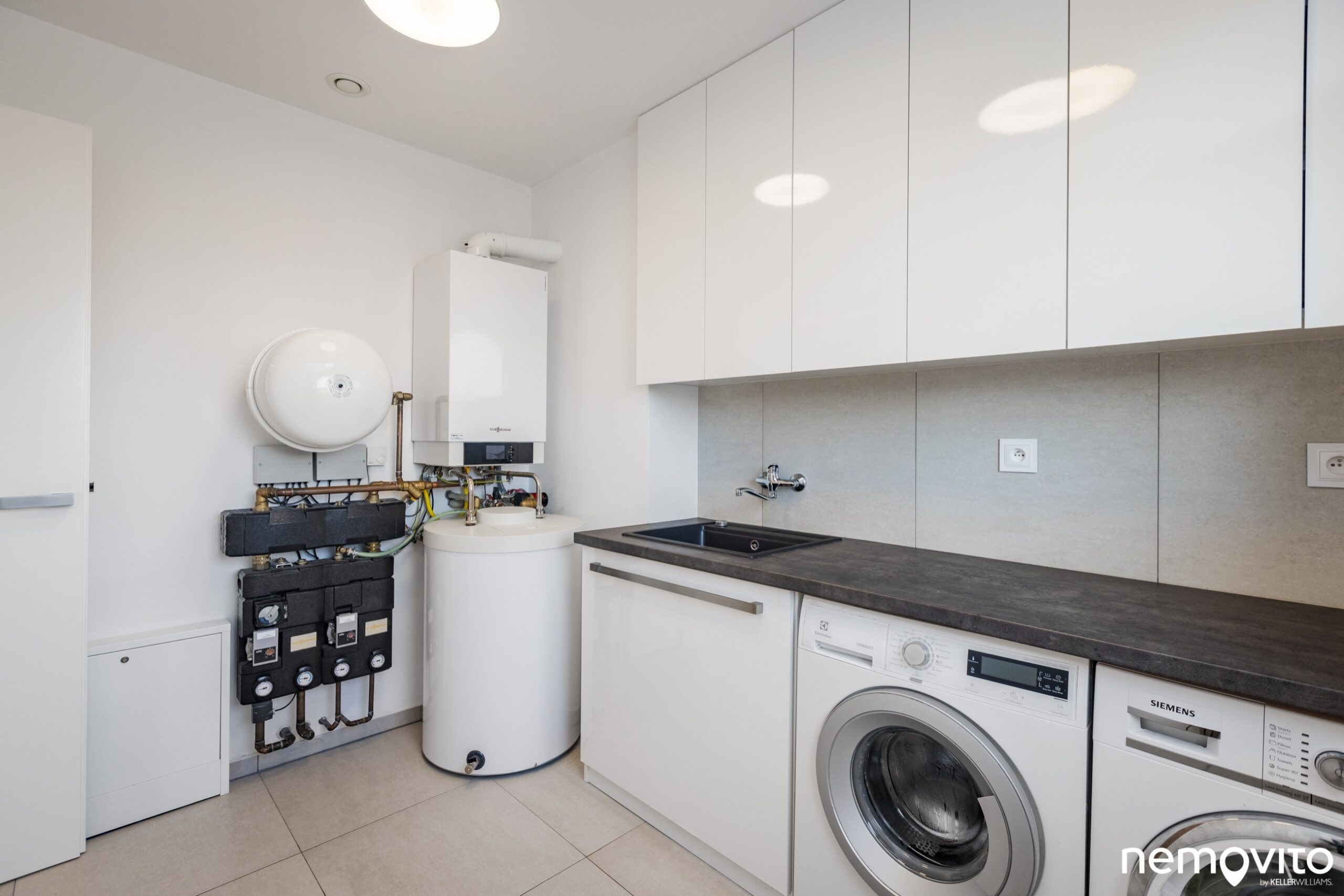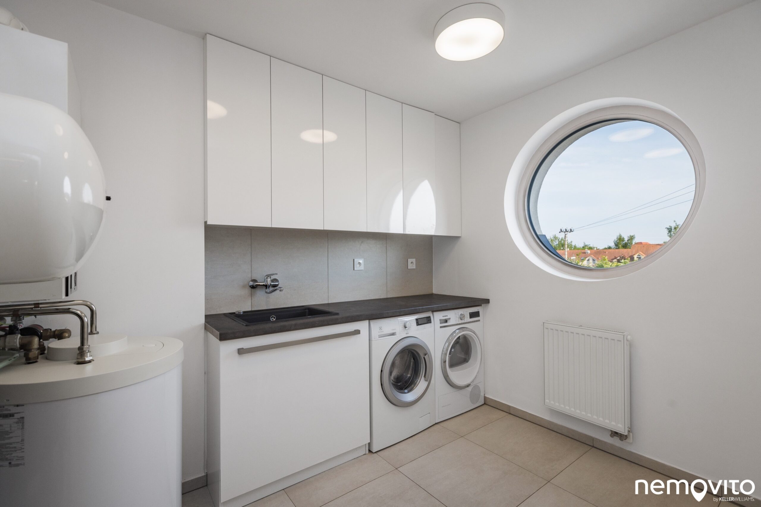 Toaleta je od dětské koupelny oddělená. Asi nejzajímavější technická místnost, kterou jste kdy viděli. Kulaté okno je pro architektonické studio typickým prvkem a tak i když půjdete prát, což vážně žádná zábava není, bude alespoň na co koukat. V technické místnosti je umístěn plynový kotel, zásobník na teplou vodu, rozvod podlahového topení a vestavěná skříň pro prádelnu. Ta je umístěna co nejblíže dětským ložnicím. Pohled z druhé strany místnosti je ZDE.